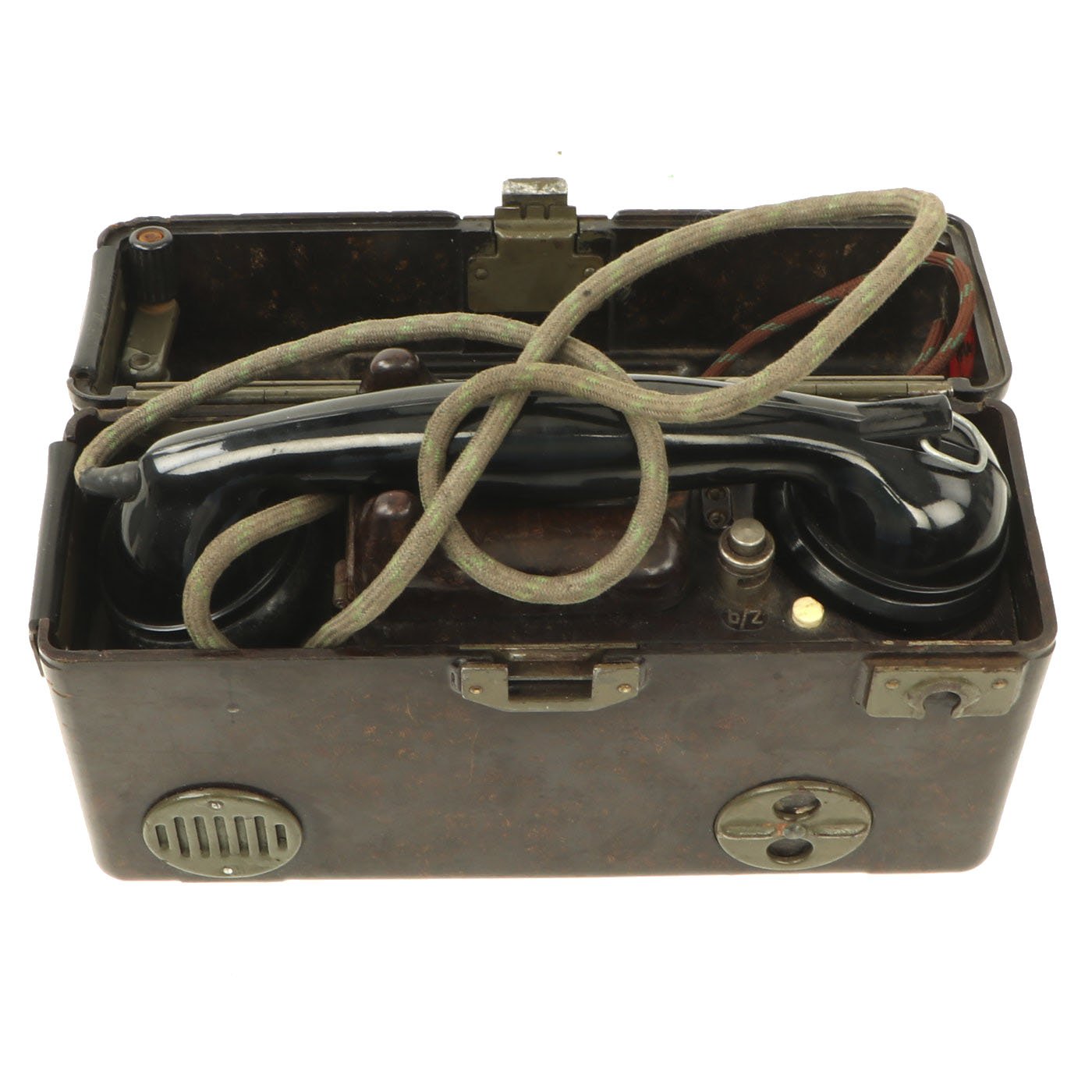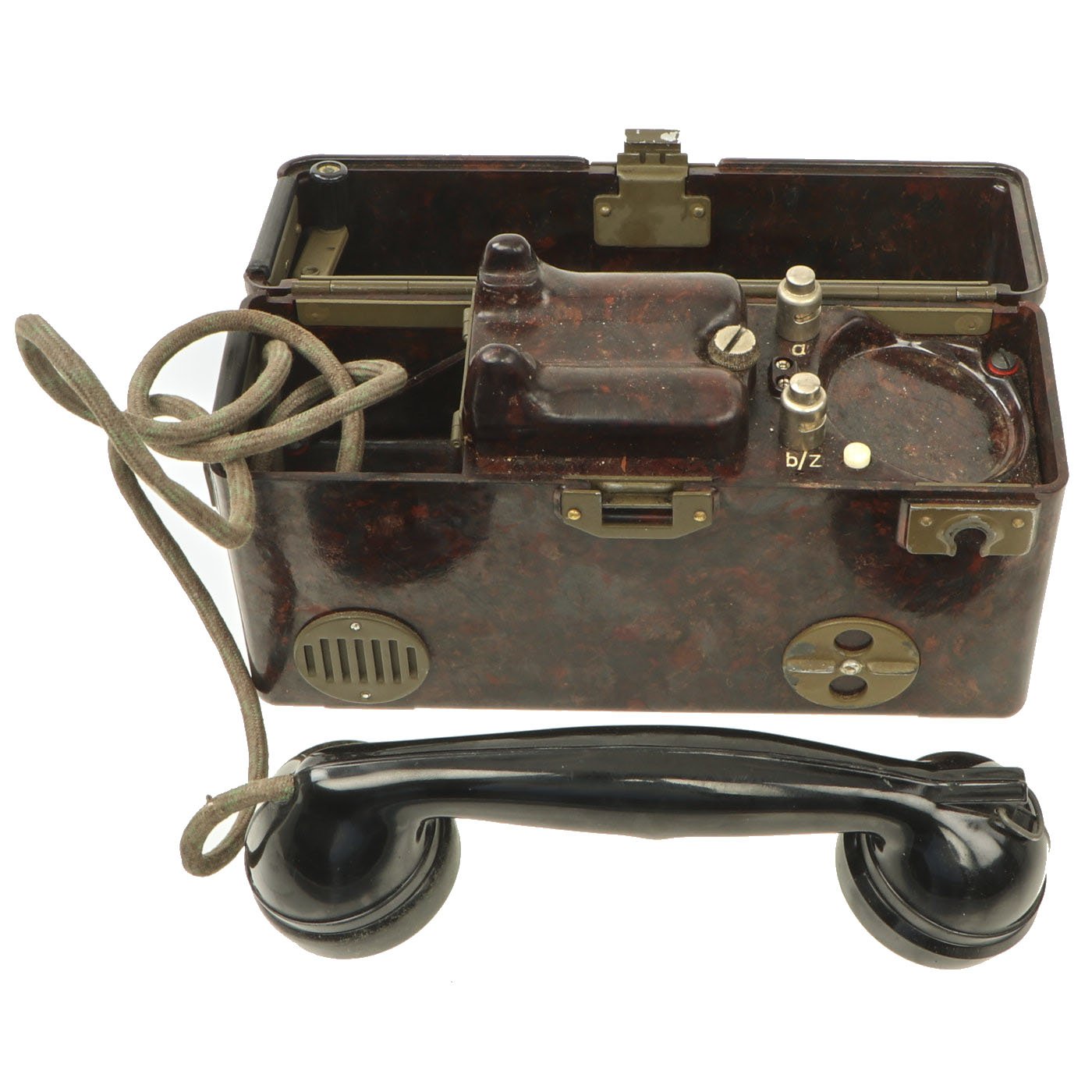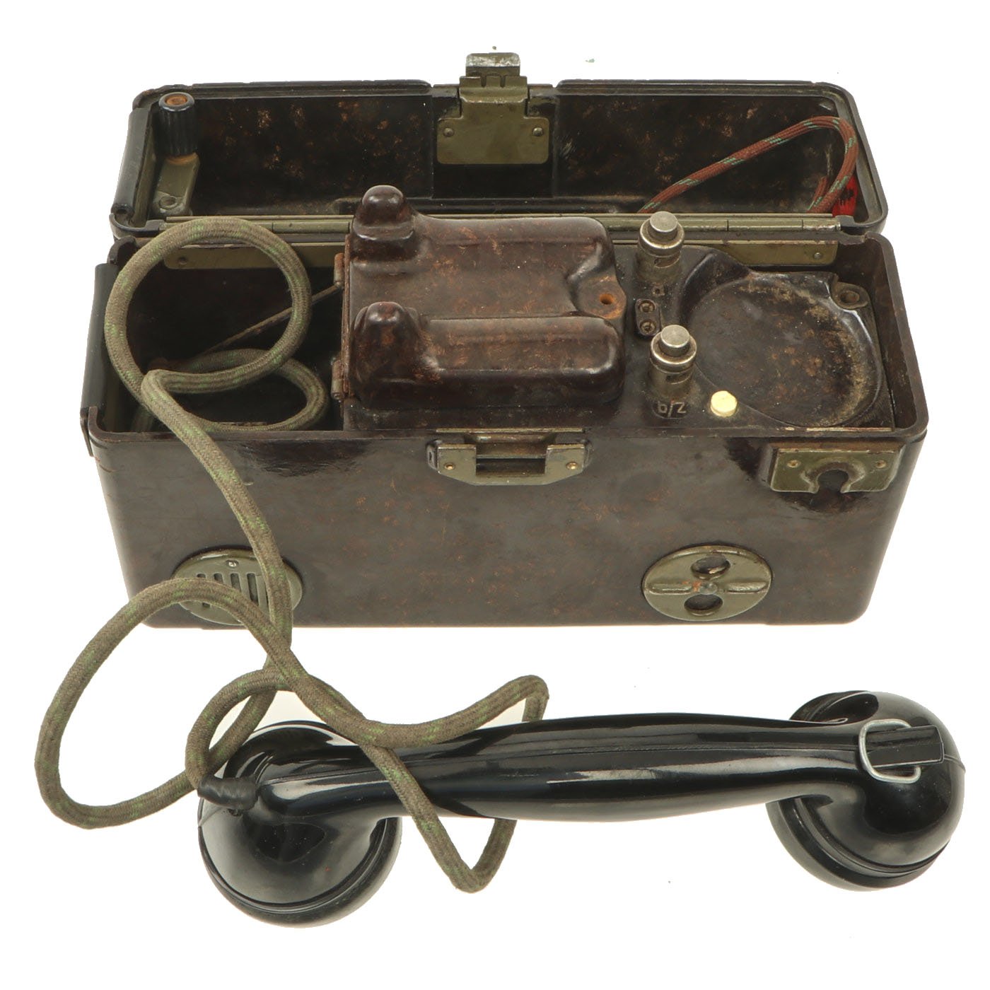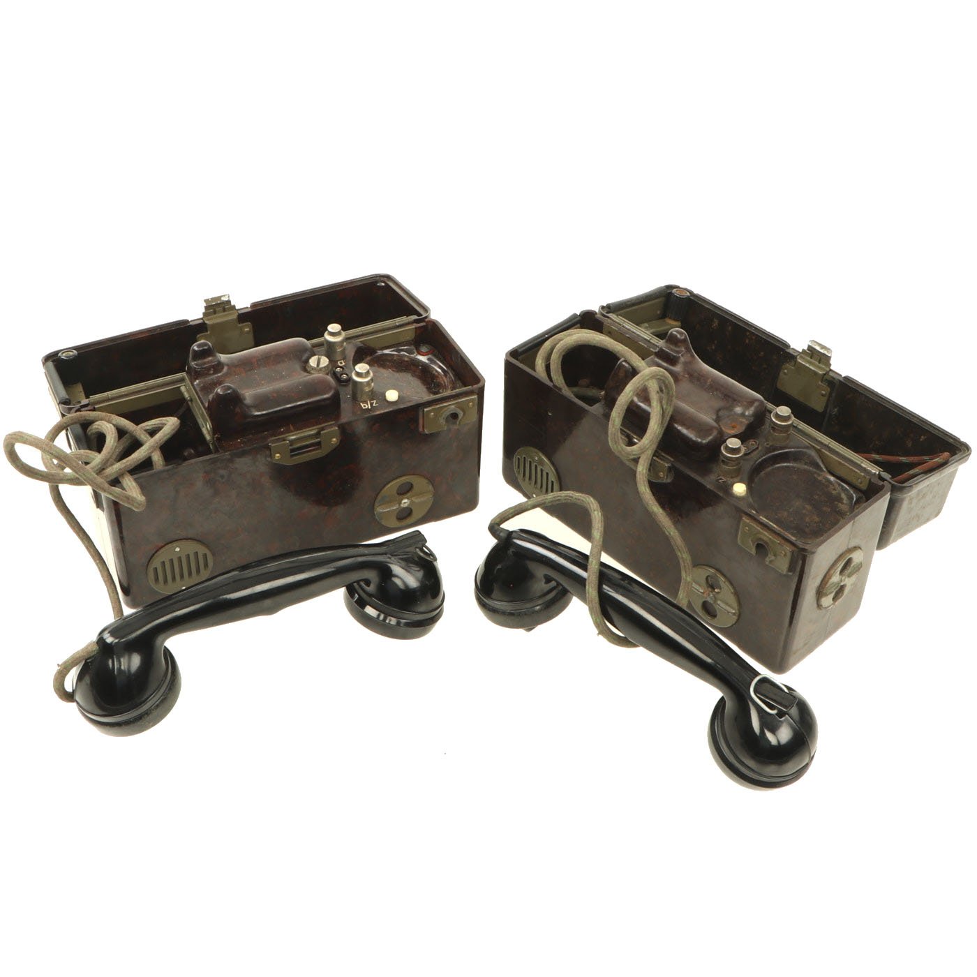 Similar to the German FF-33 phone, these were used by the Czechoslovakian army. Heavy duty Bakelite box with an inside engraving that reads POZOR, NEPŘÍTEL NASLOUCHÁ! (Beware the enemy is listening). They Measure approximately 10” long x 6 ½” tall x 3” wide, and look to have most of the original accessories. One example is missing some screws and the battery compartment locking bolt, but otherwise both look to be complete. They both have the connection cord, handsets, and cranks, as well as intact phonetic alphabet markings on the top covers.