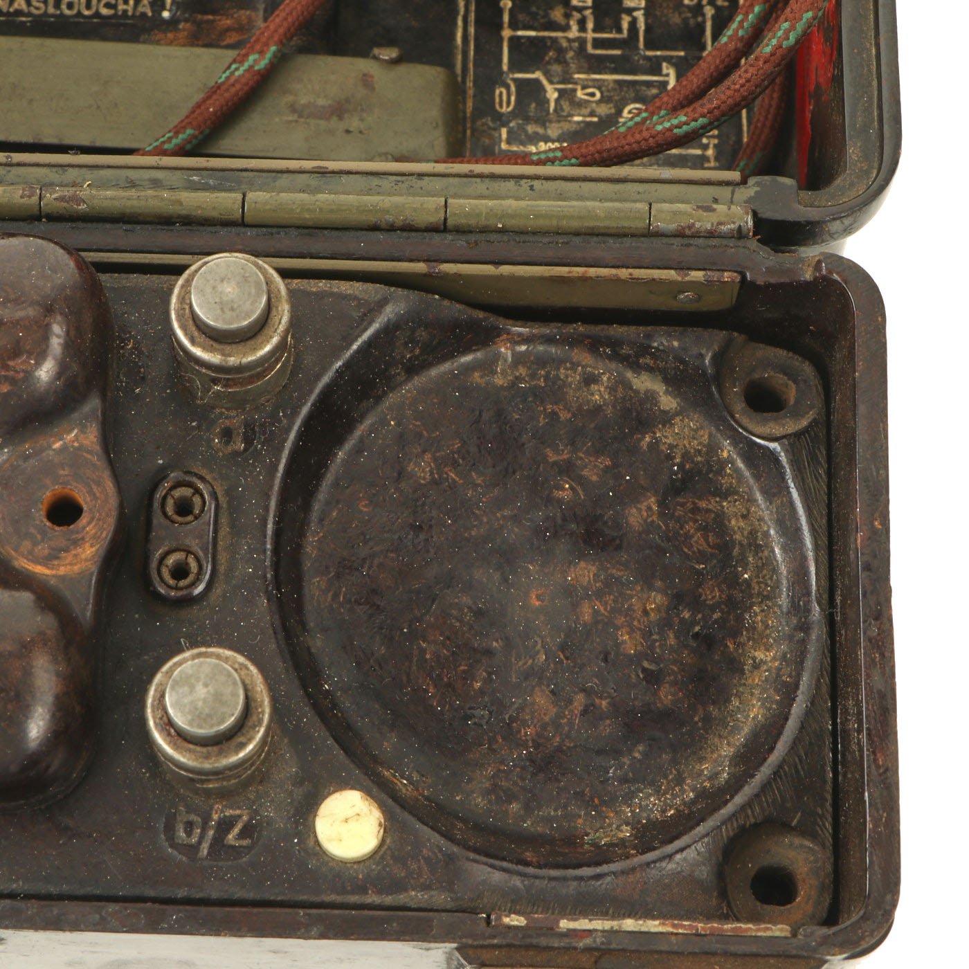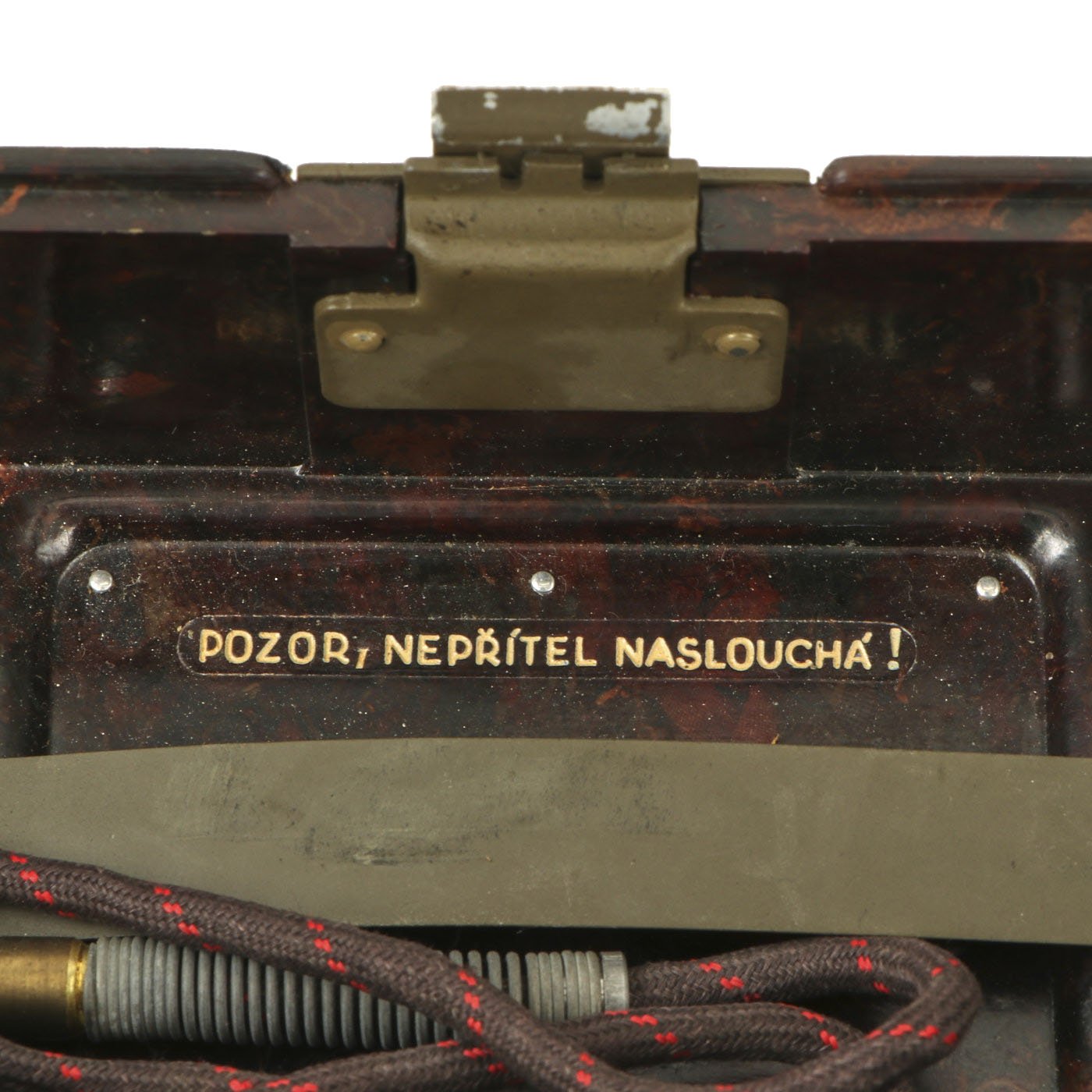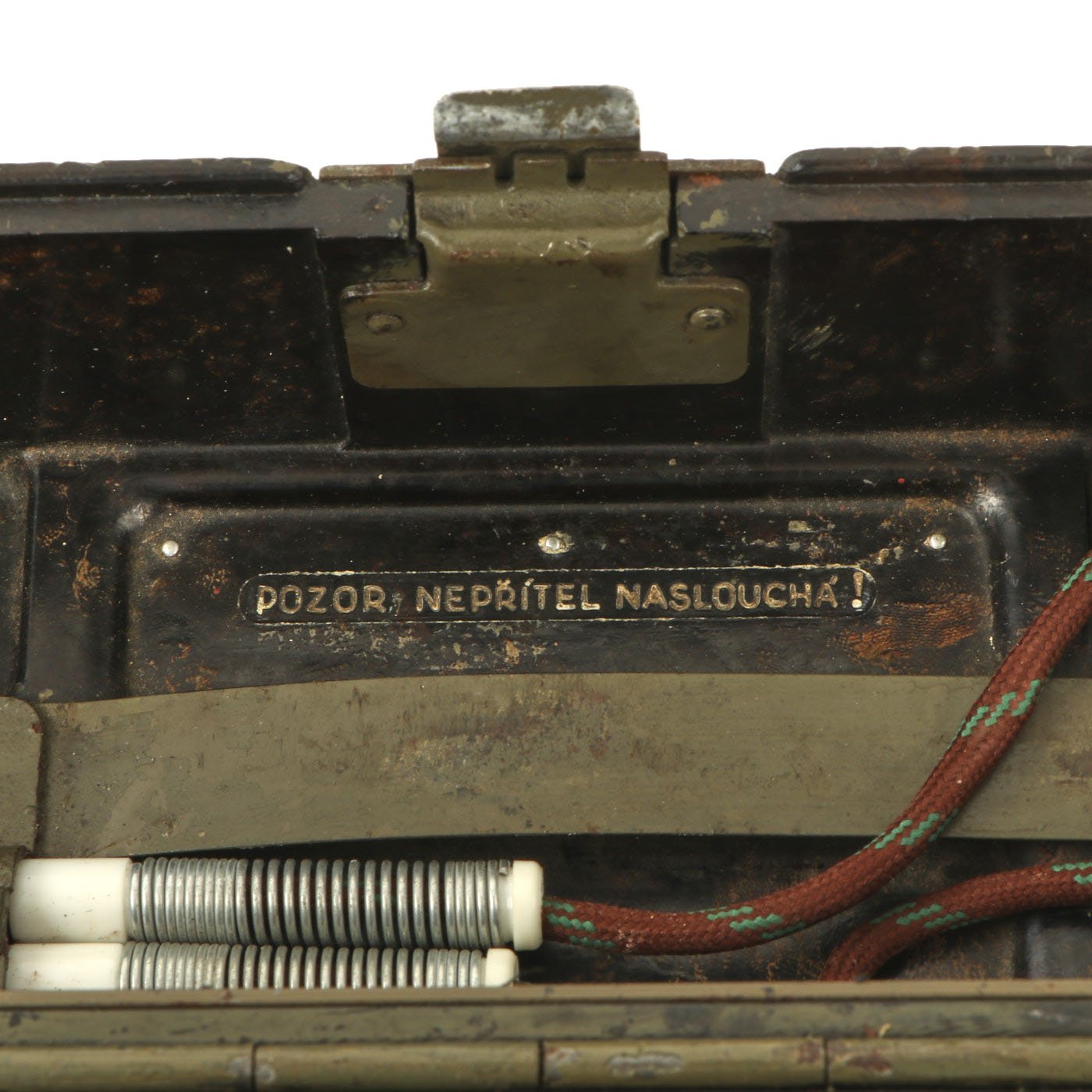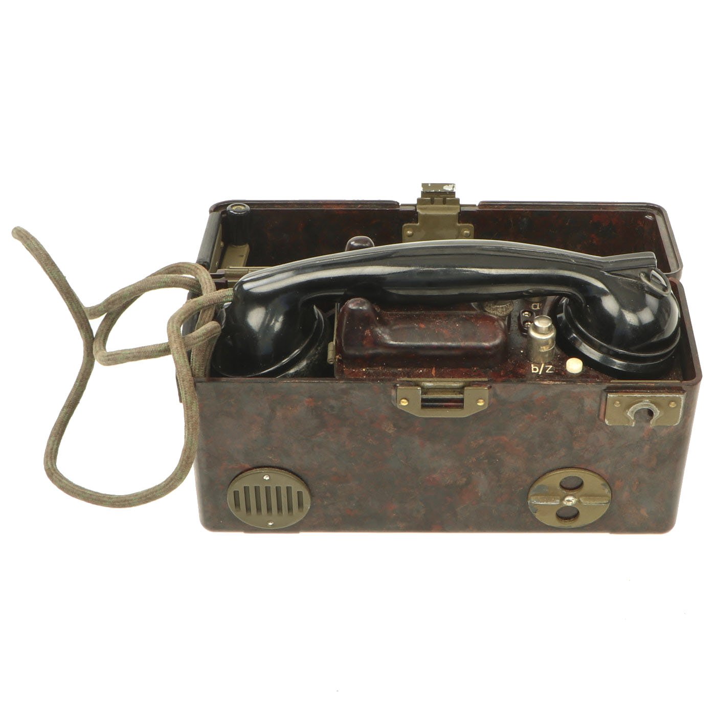 Similar to the German FF-33 phone, these were used by the Czechoslovakian army. Heavy duty Bakelite box with an inside engraving that reads POZOR, NEPŘÍTEL NASLOUCHÁ! (Beware the enemy is listening). They Measure approximately 10” long x 6 ½” tall x 3” wide, and look to have most of the original accessories. One example is missing some screws and the battery compartment locking bolt, but otherwise both look to be complete. They both have the connection cord, handsets, and cranks, as well as intact phonetic alphabet markings on the top covers.