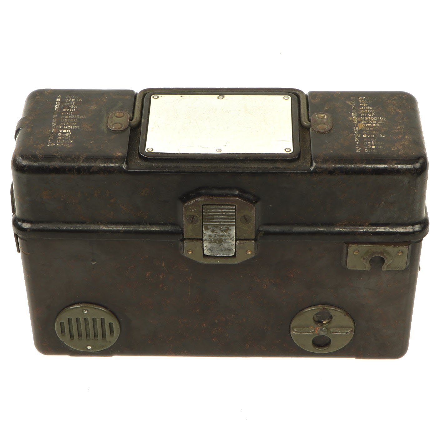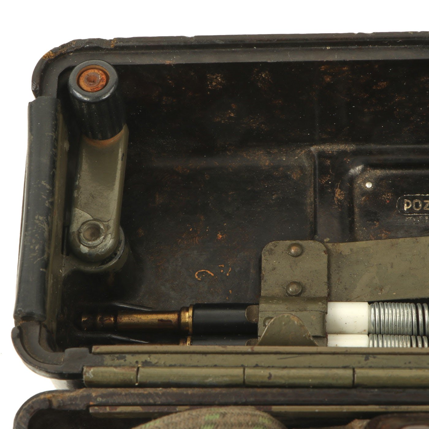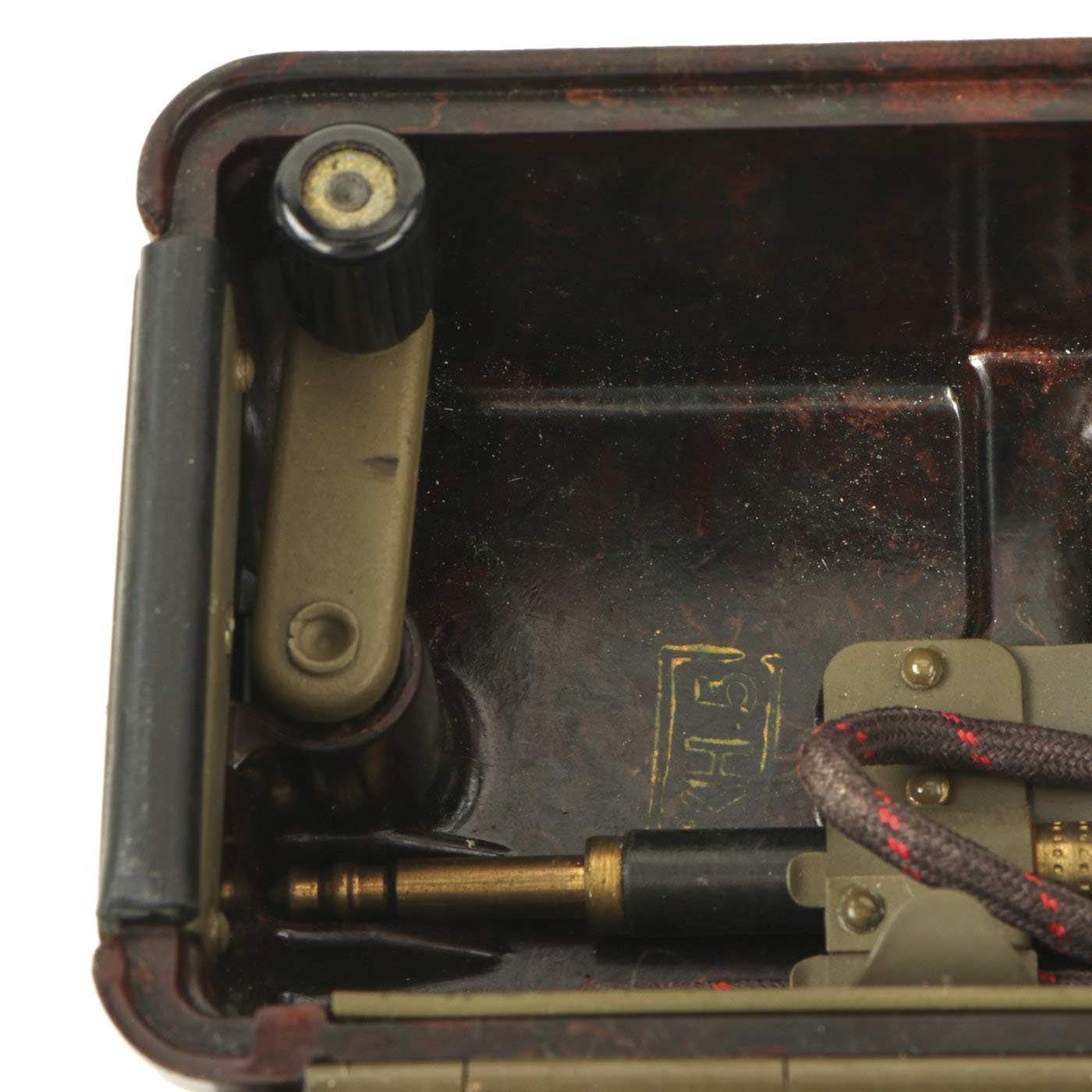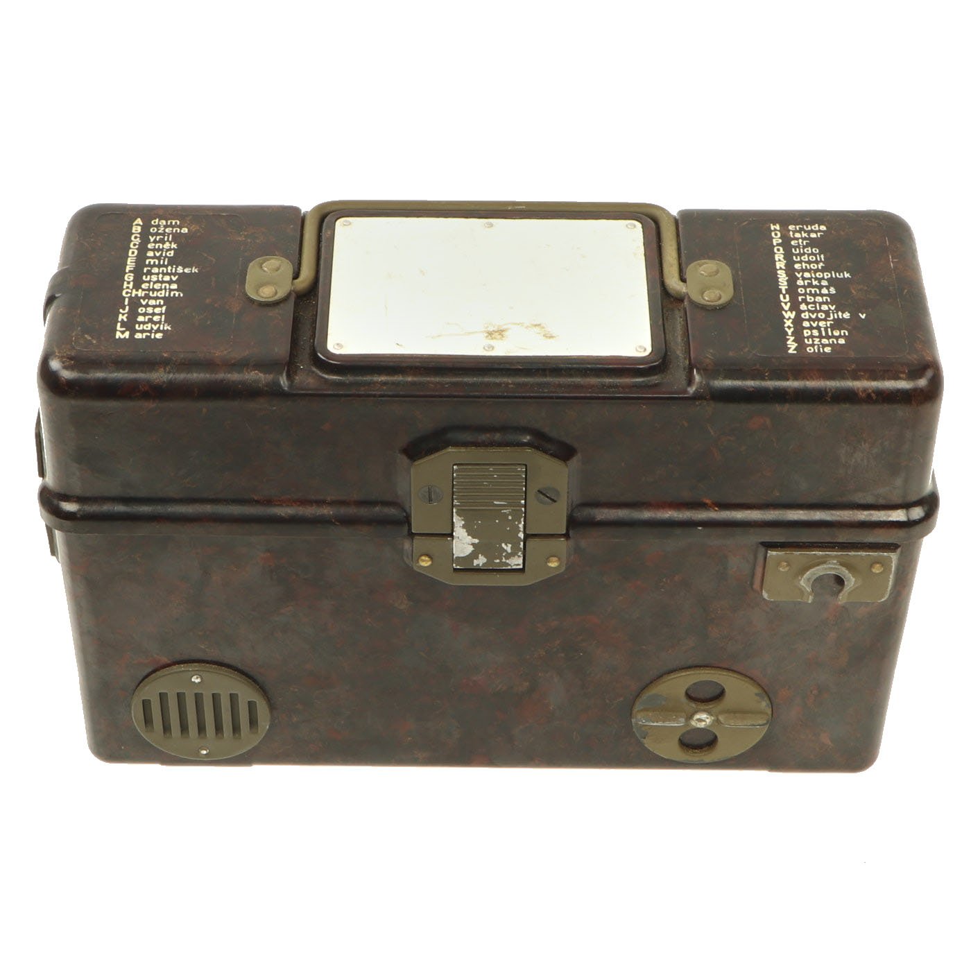 Similar to the German FF-33 phone, these were used by the Czechoslovakian army. Heavy duty Bakelite box with an inside engraving that reads POZOR, NEPŘÍTEL NASLOUCHÁ! (Beware the enemy is listening). They Measure approximately 10” long x 6 ½” tall x 3” wide, and look to have most of the original accessories. One example is missing some screws and the battery compartment locking bolt, but otherwise both look to be complete. They both have the connection cord, handsets, and cranks, as well as intact phonetic alphabet markings on the top covers.