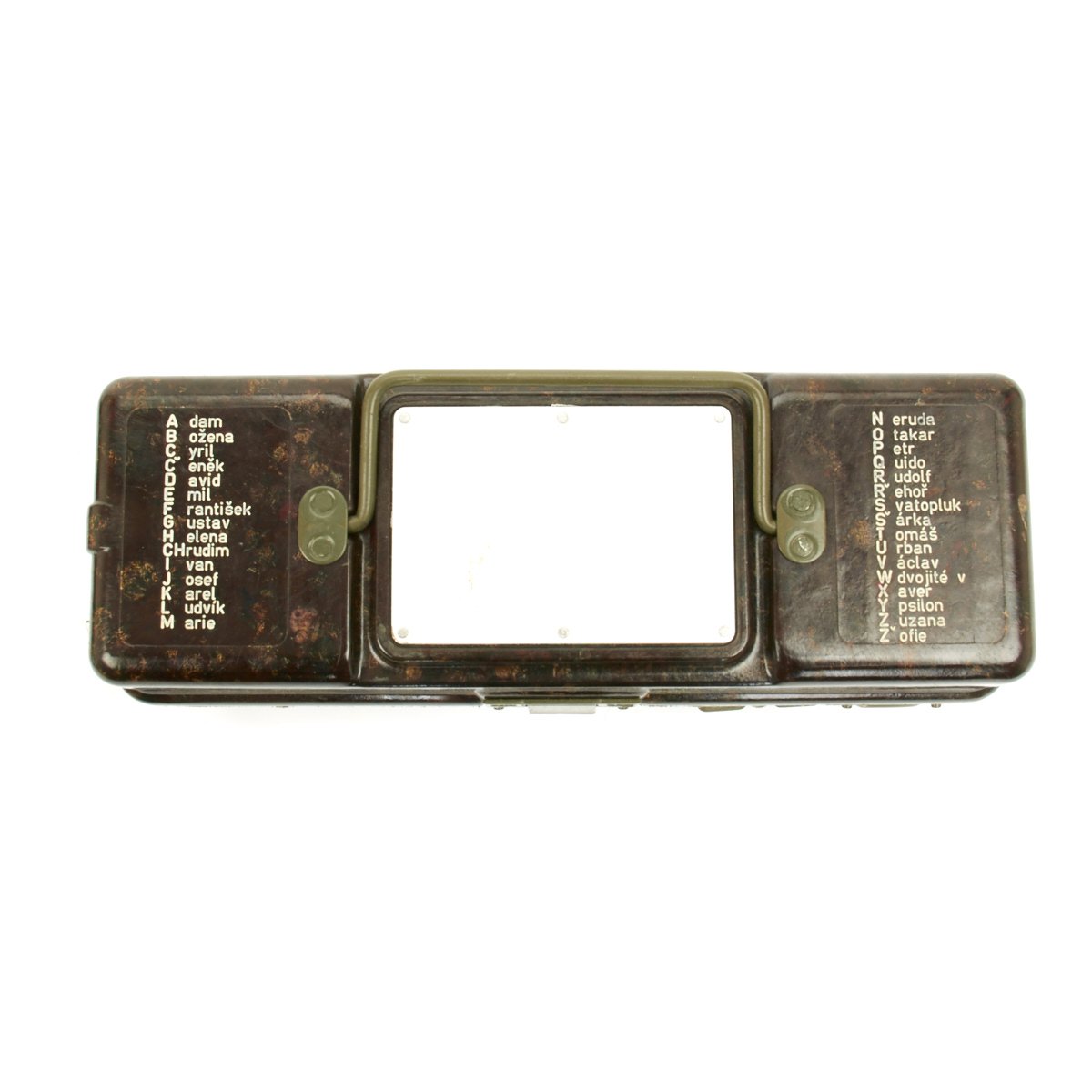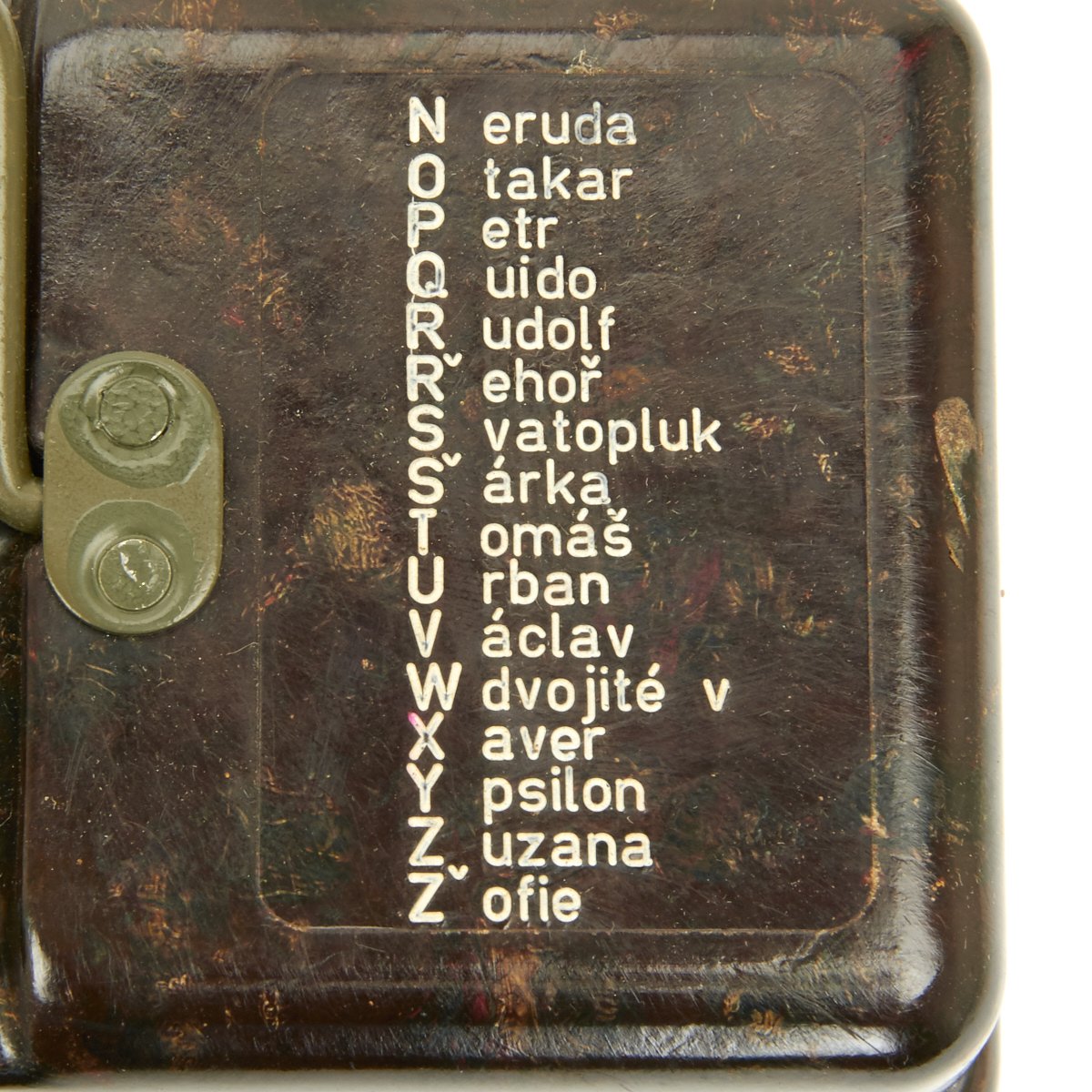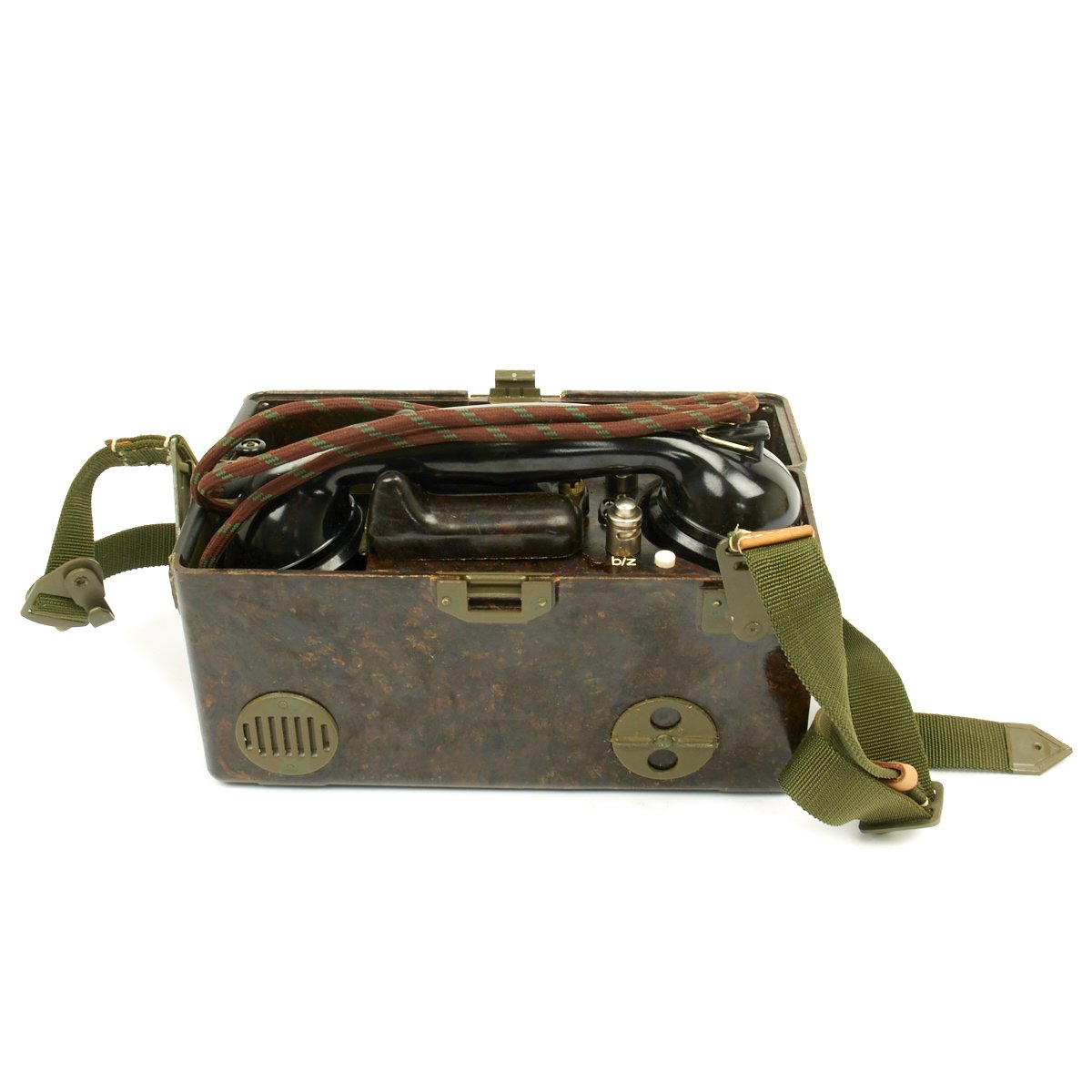 Similar to the German FF-33 phone, these were used by the Czech army. Heavy duty Bakelite box with an inside engraving that reads Pozor nepřítel naslouchá! (Beware the enemy is listening). They Measure approximately 10” long x 6 ½” tall x 3” wide, an come complete with carrying straps and all accessories.