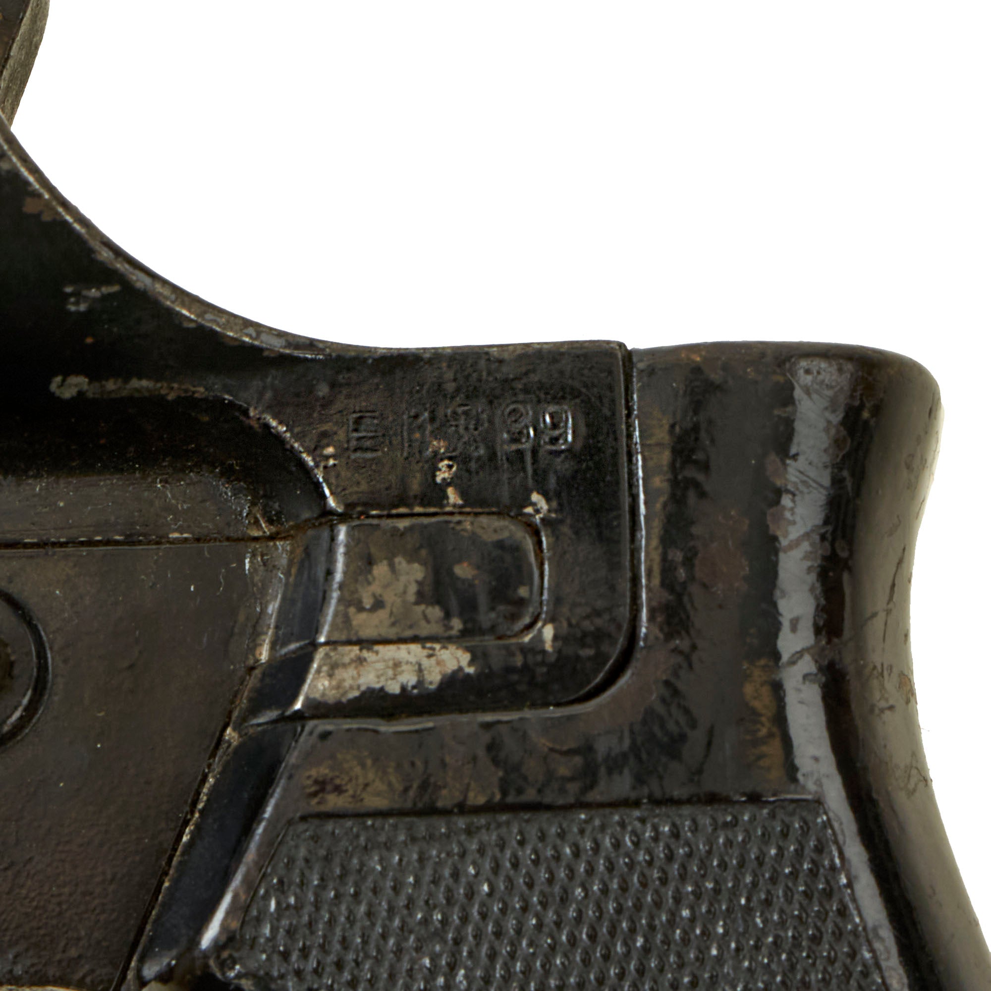 Overall condition is fair with the pistol having been painted black, and the wooden grips replaced with plastic/bakelite. The pistol is in perfect mechanical condition and includes the often missing firing pin.