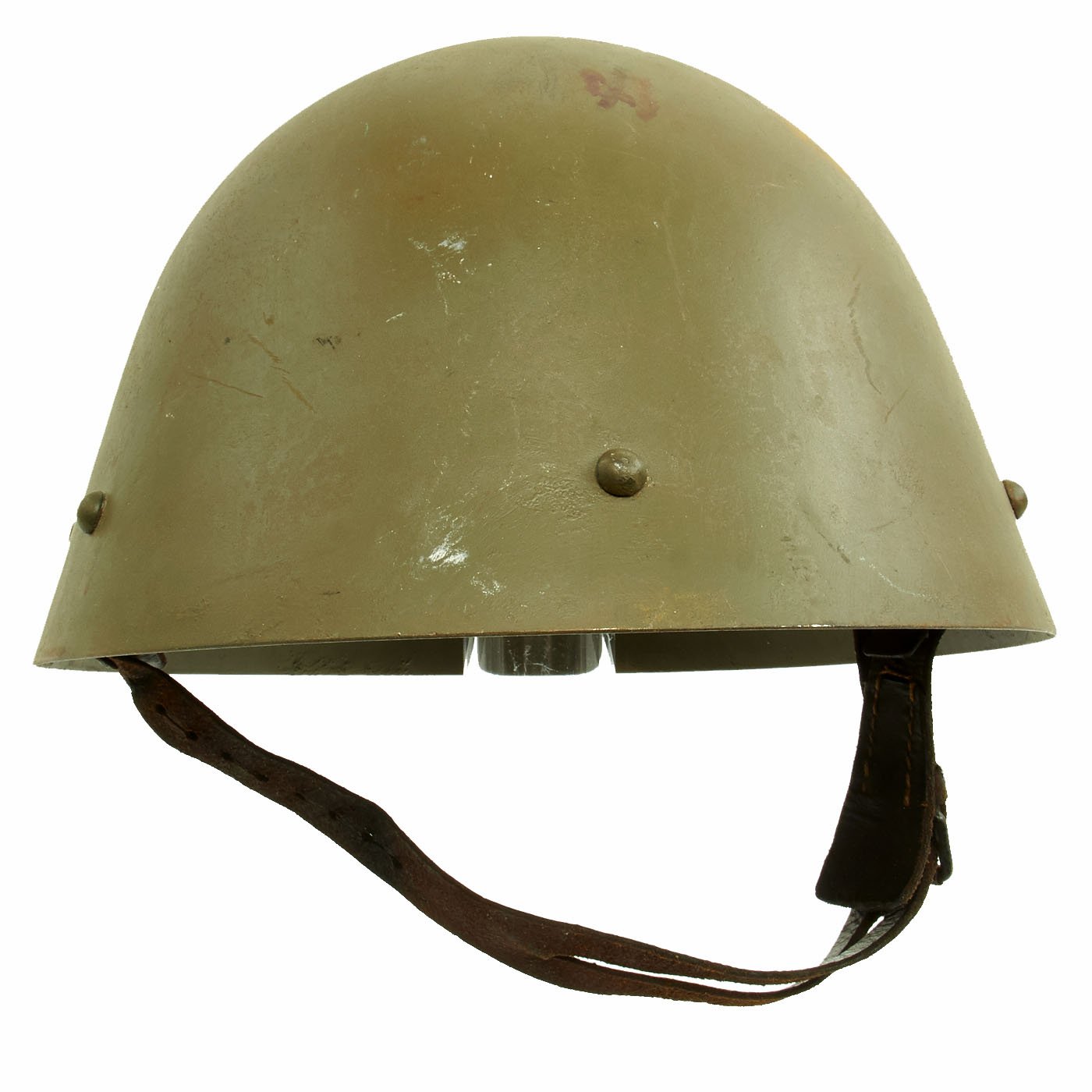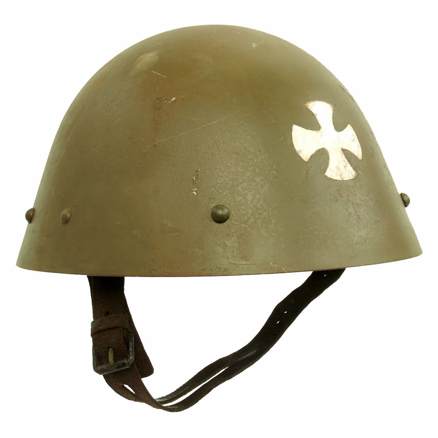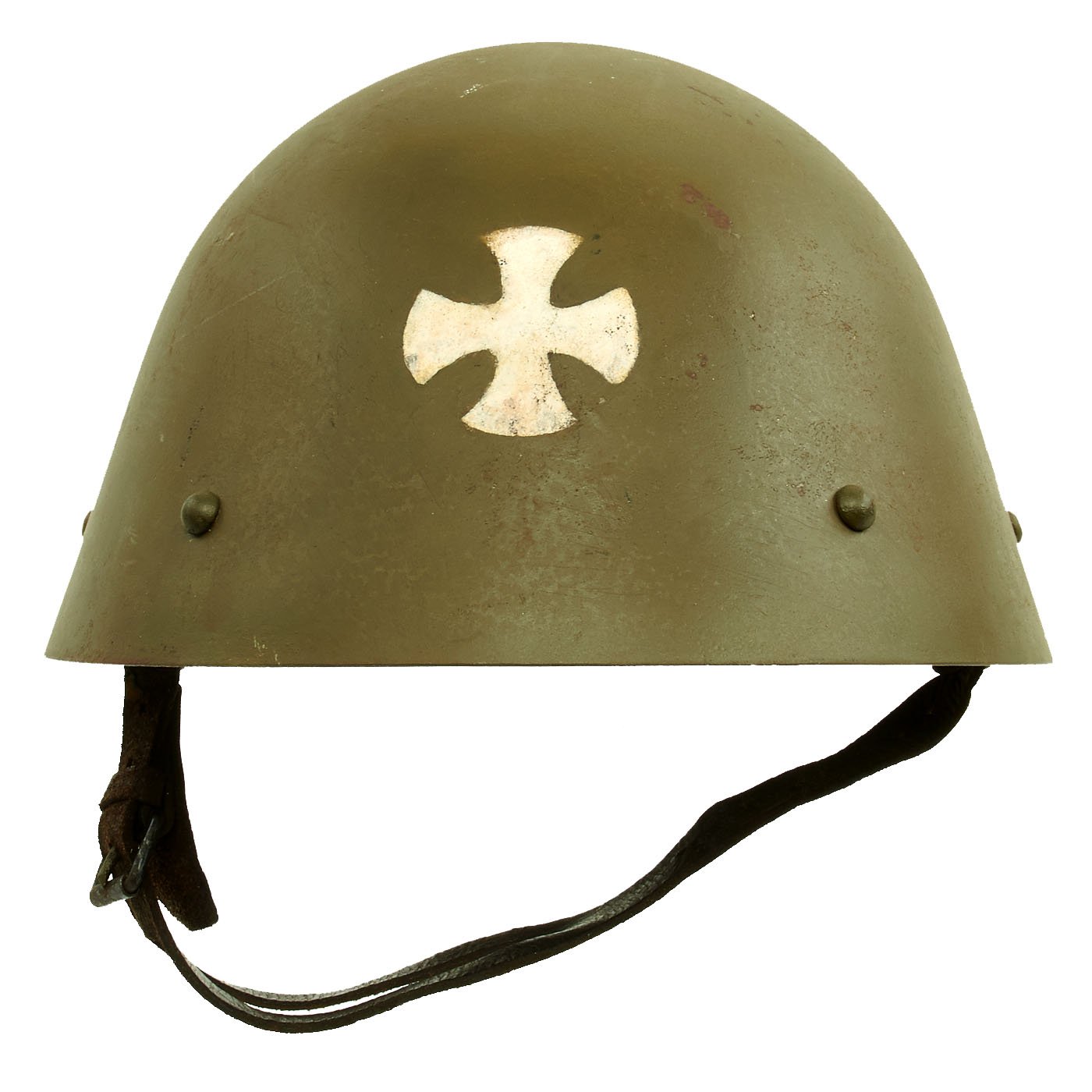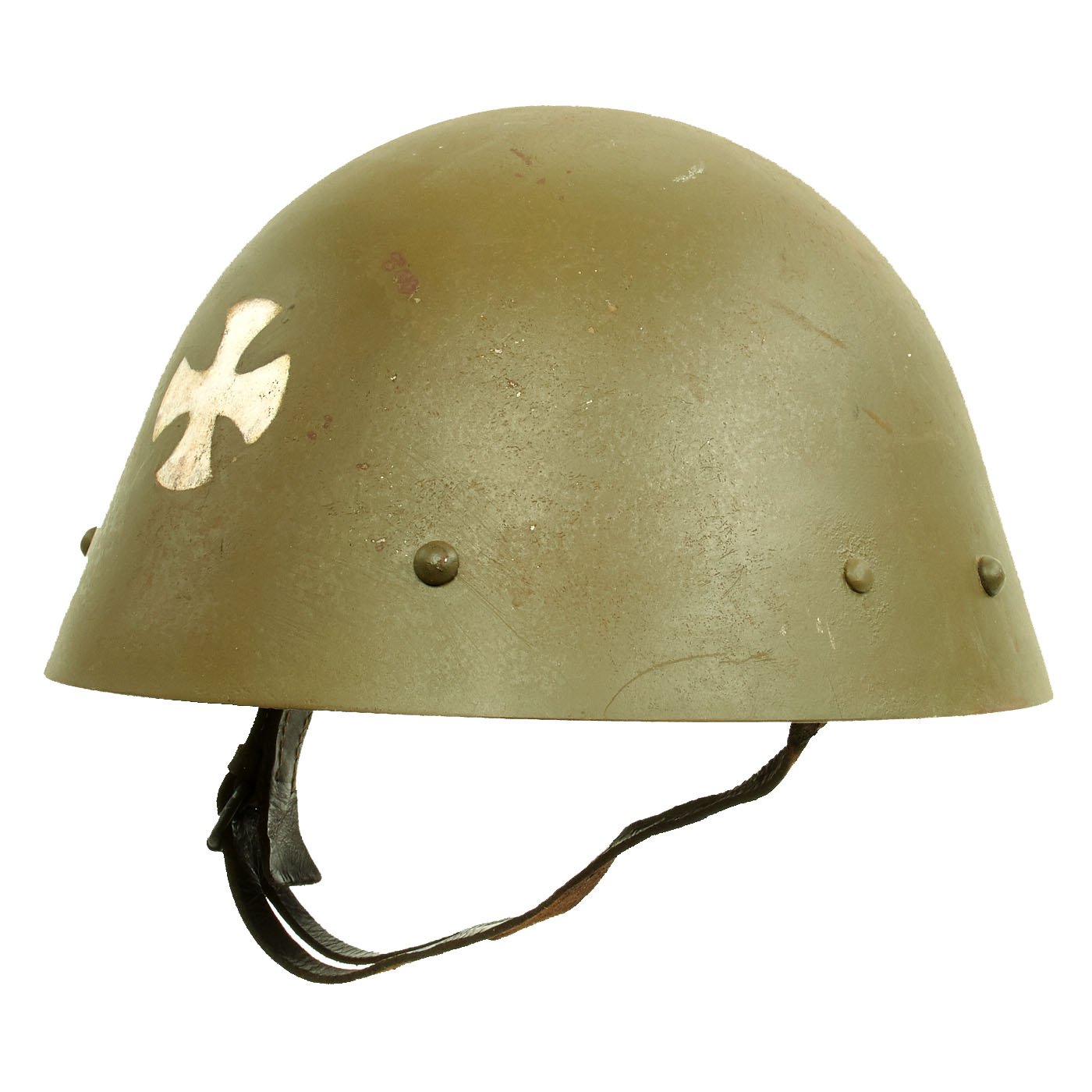 During WWII, this helmet was issued to the Russian Protective Corps of Serbia, as indicated by the OD green color, and the Cross on the front of the helmet. This was a Pro-Germany force raised in German Occupied Serbia, mainly for the protection of factories and other important industrial locations against Communist-Allied Partisans. This is the first time we have had a helmet used by this unit, and they seem to be relatively rare.