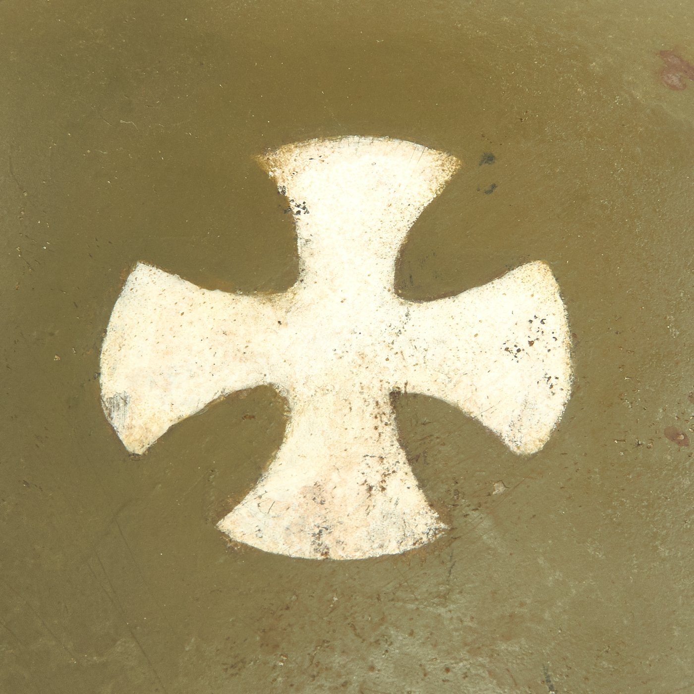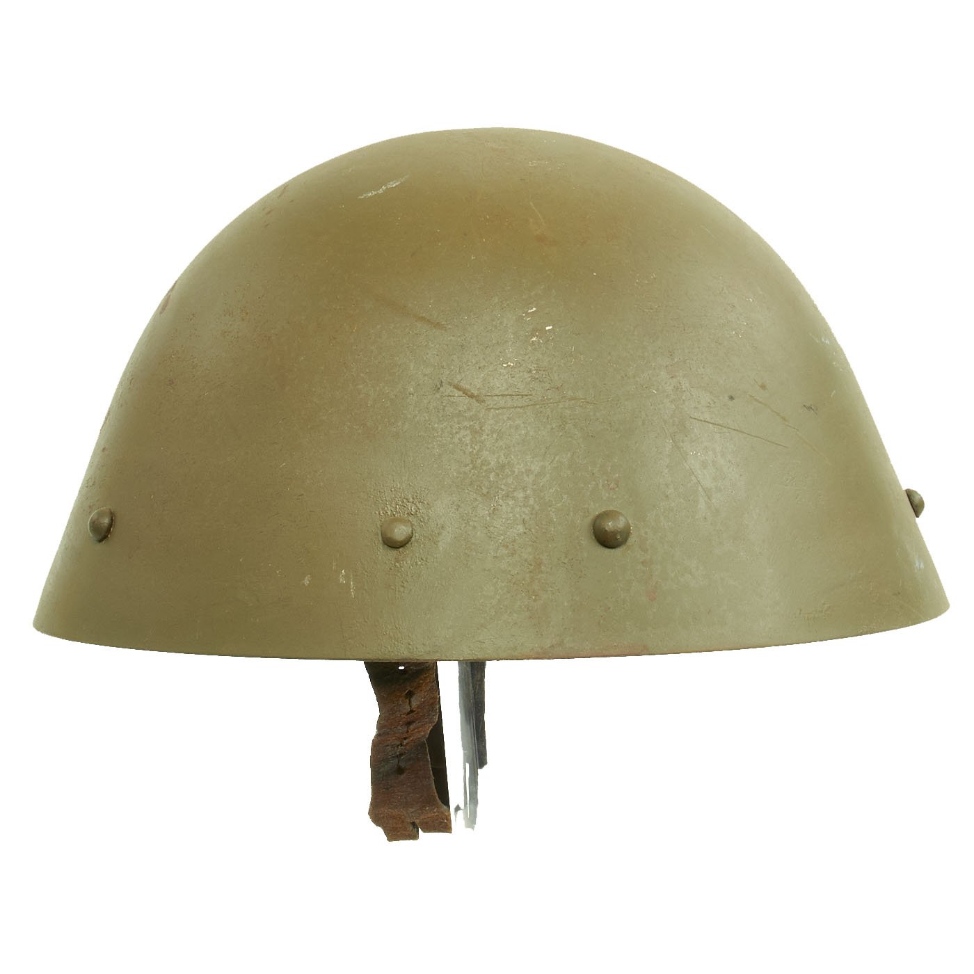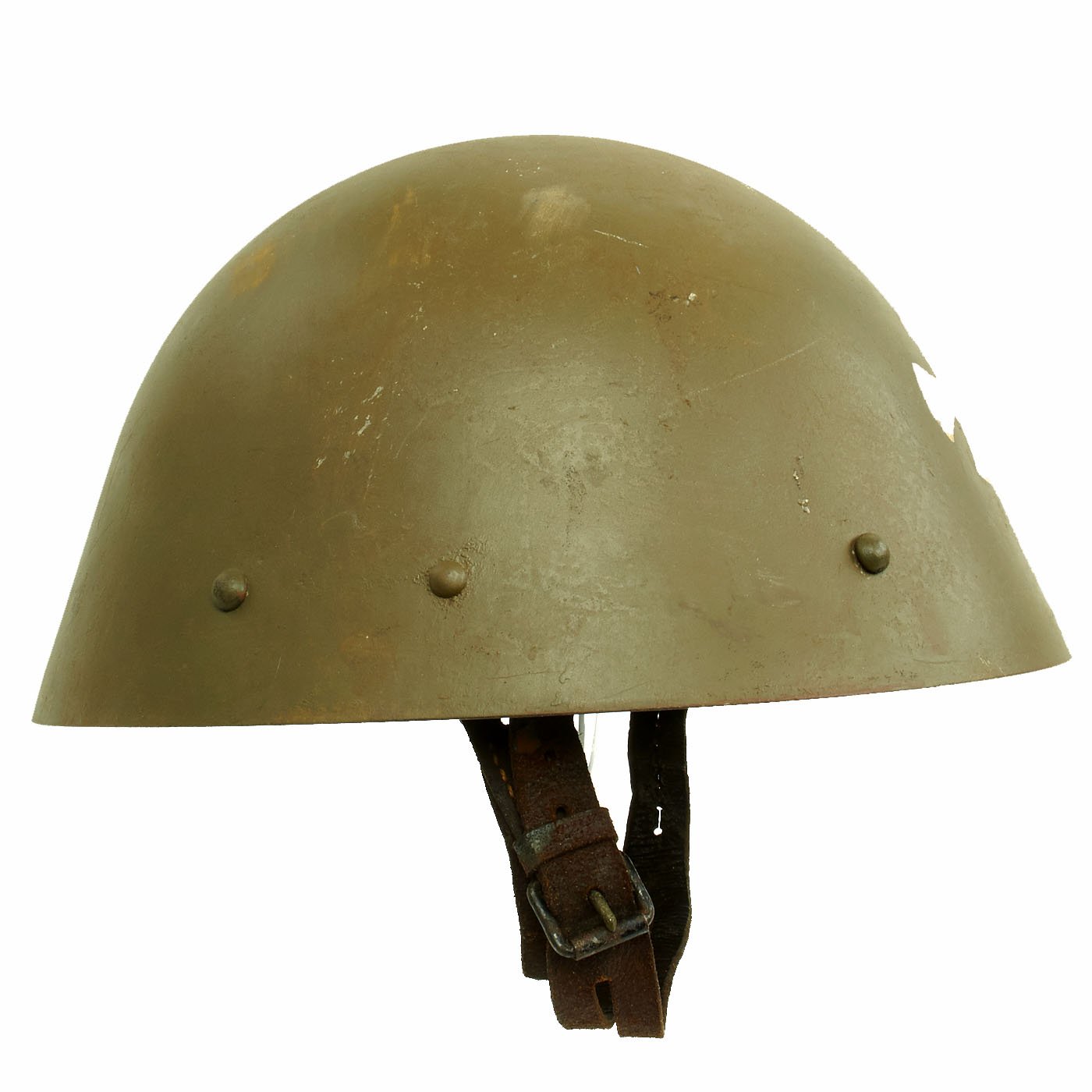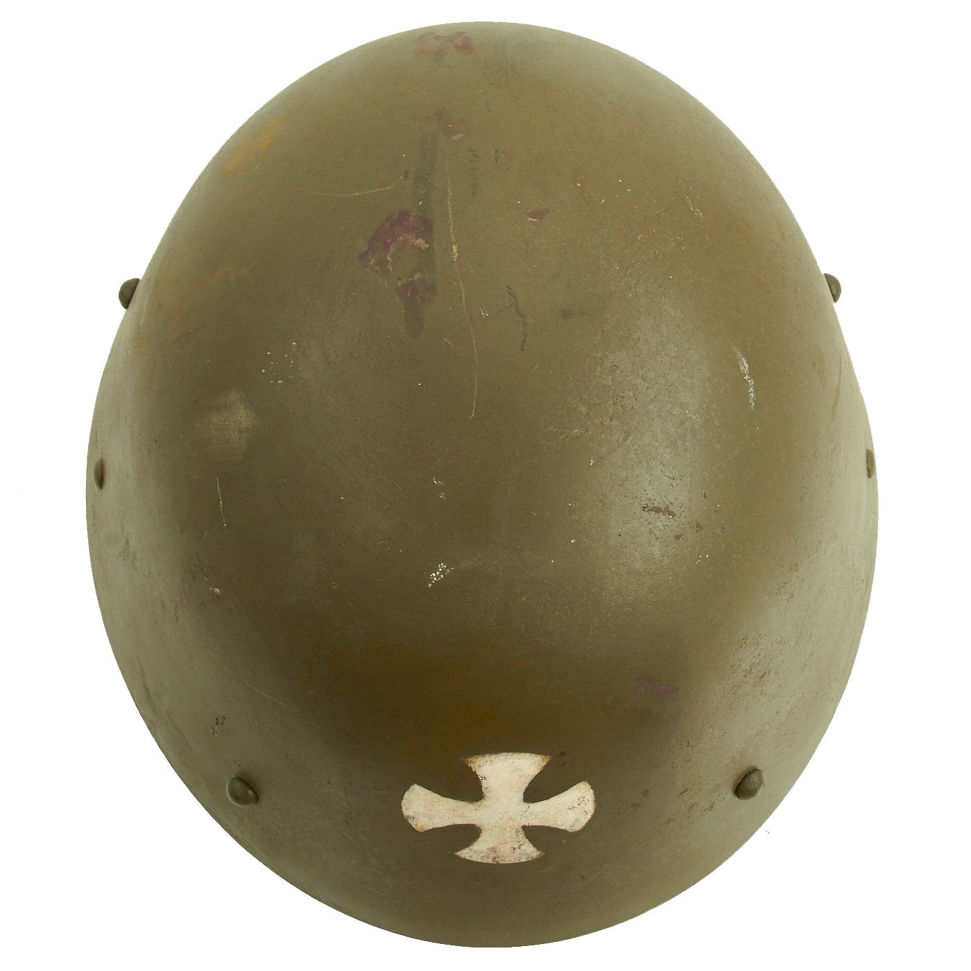During WWII, this helmet was issued to the Russian Protective Corps of Serbia, as indicated by the OD green color, and the Cross on the front of the helmet. This was a Pro-Germany force raised in German Occupied Serbia, mainly for the protection of factories and other important industrial locations against Communist-Allied Partisans. This is the first time we have had a helmet used by this unit, and they seem to be relatively rare.