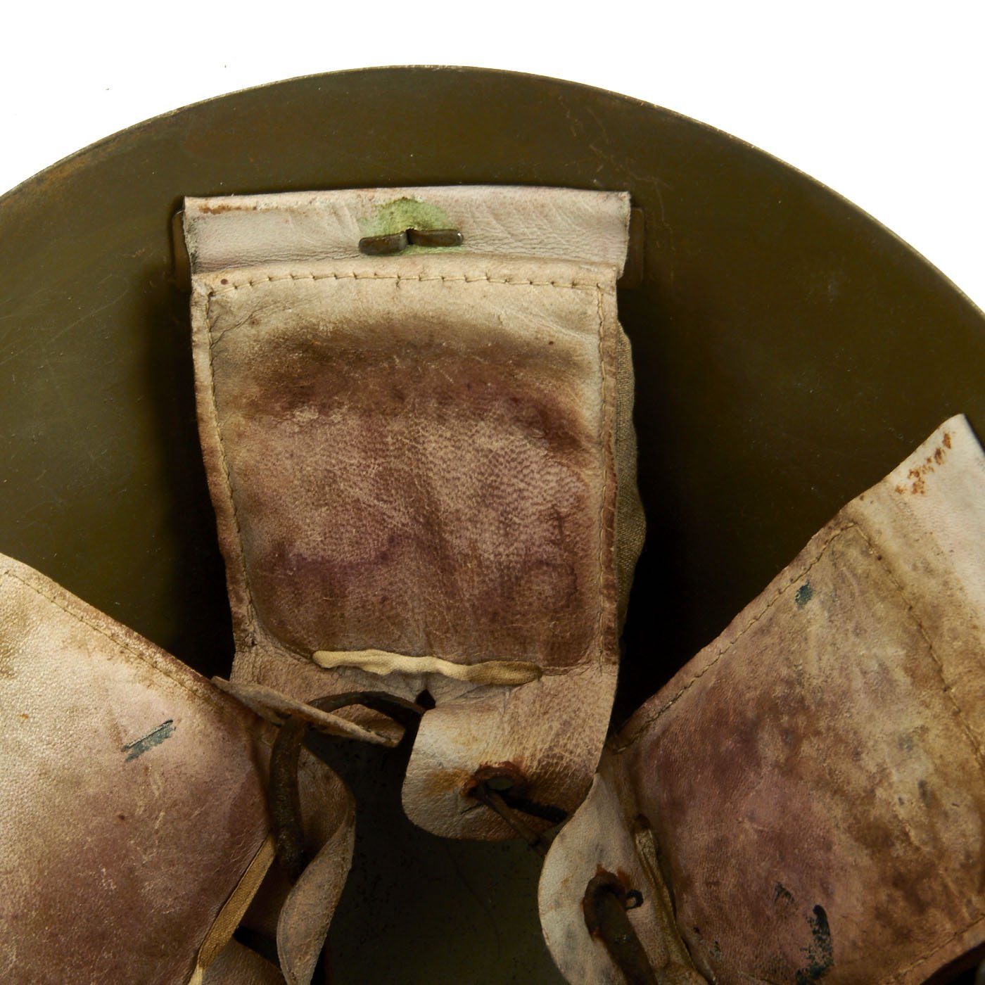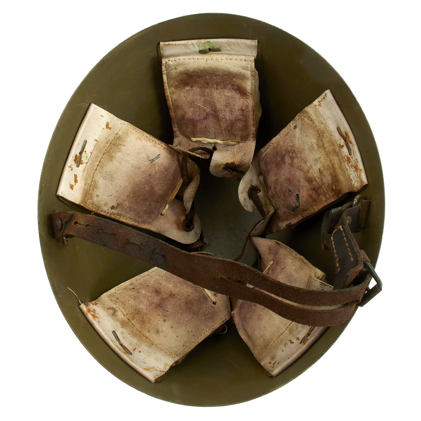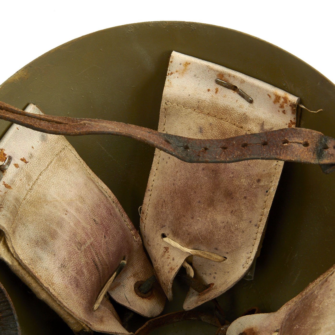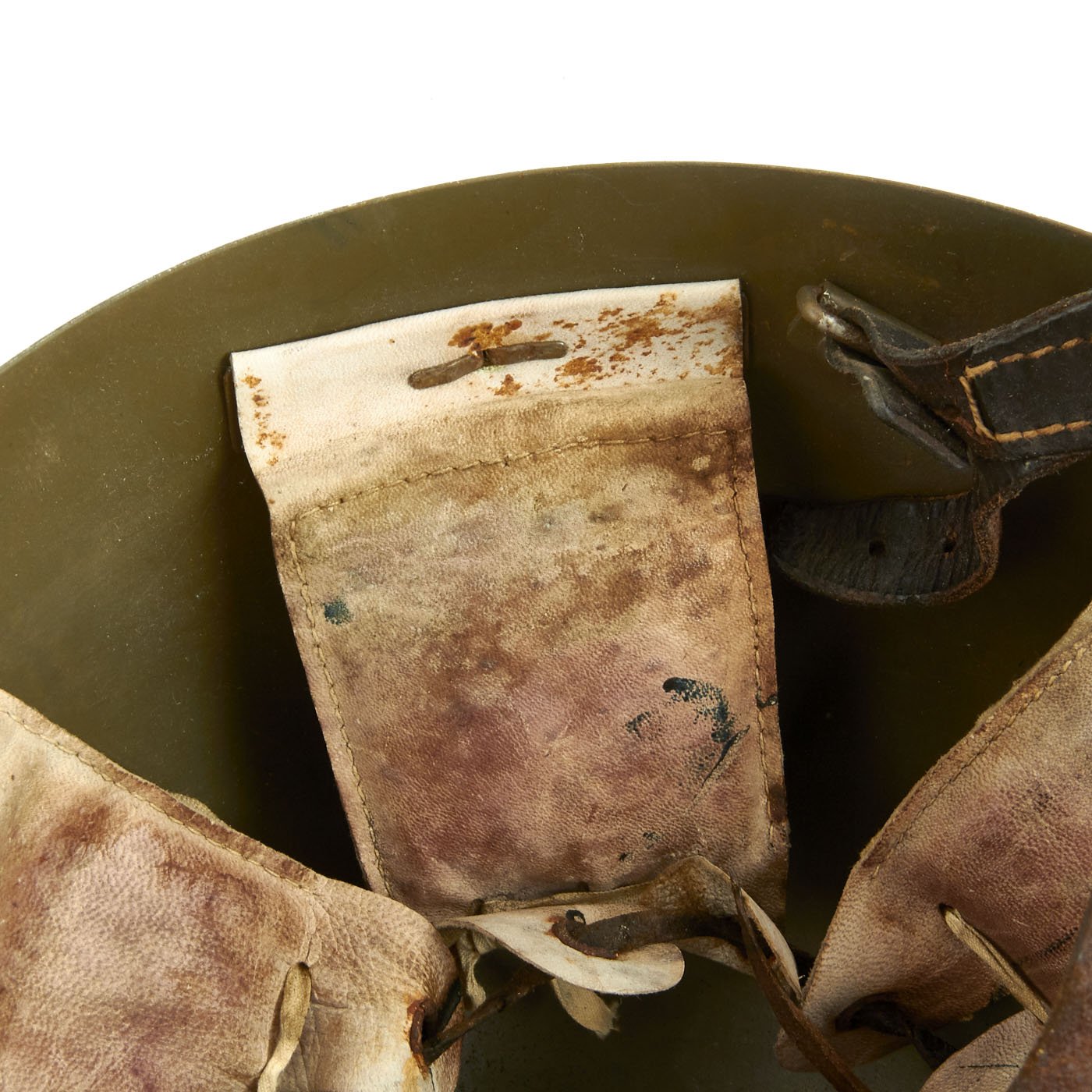 The liner and chin strap are in good condition, but due show wear and age. The chin strap has some stains and cracks, and looks like it was exposed to water at some point. The six liner pads still have their original padding, wrapped in plastic, installed behind each pad. The original maker markings that are usually on the rear of the pads are unfortunately absent.