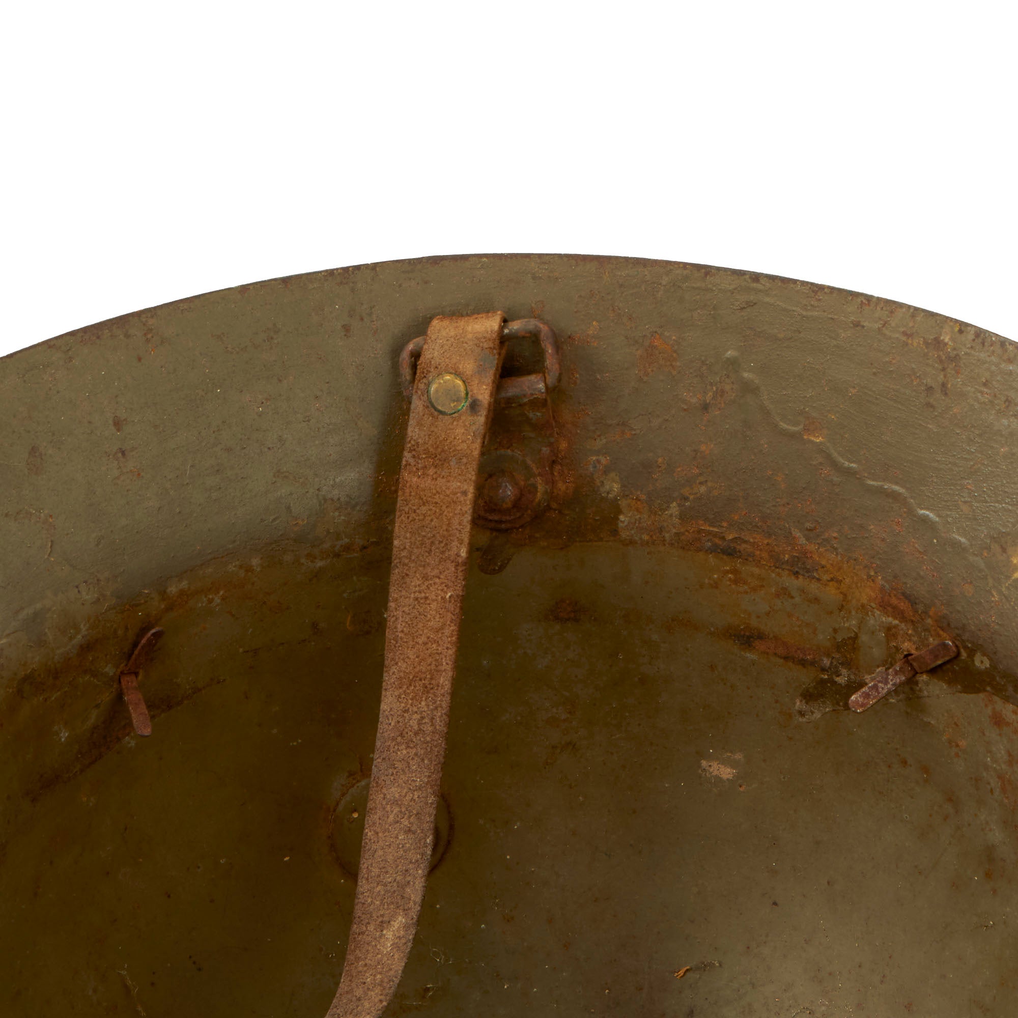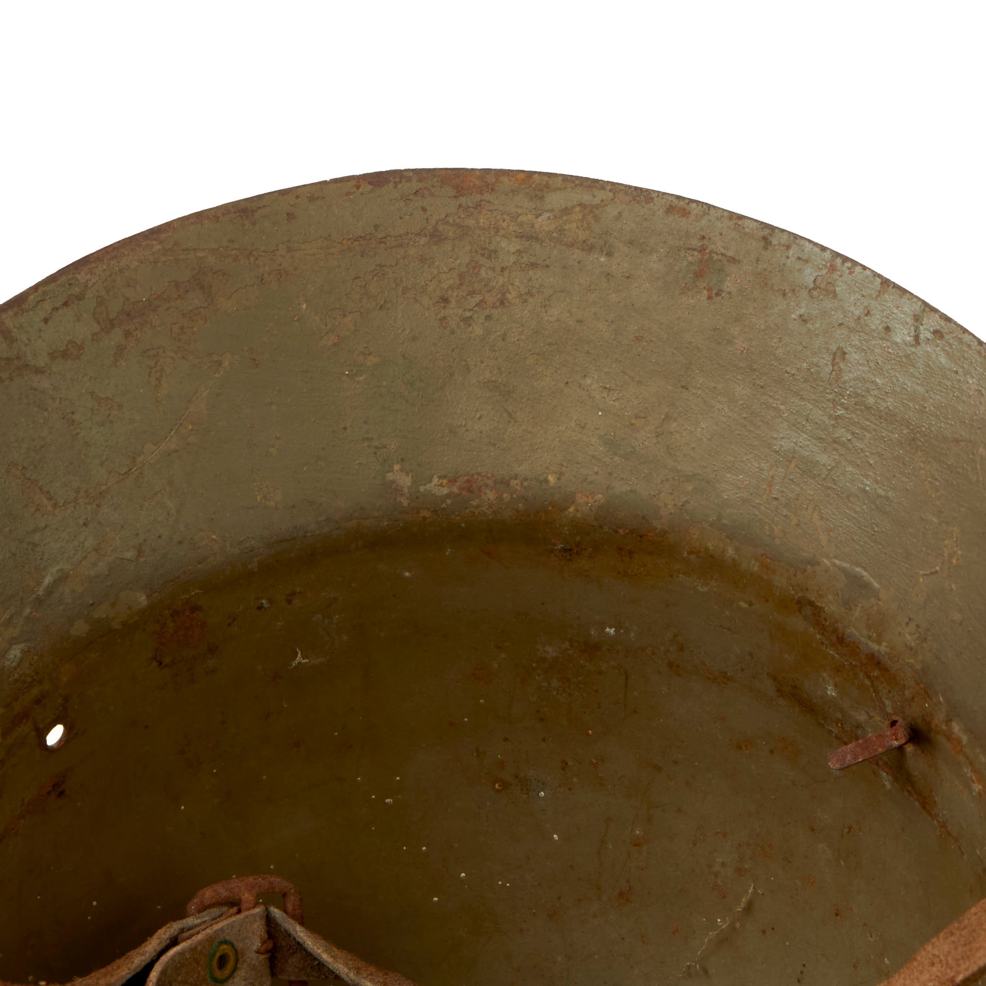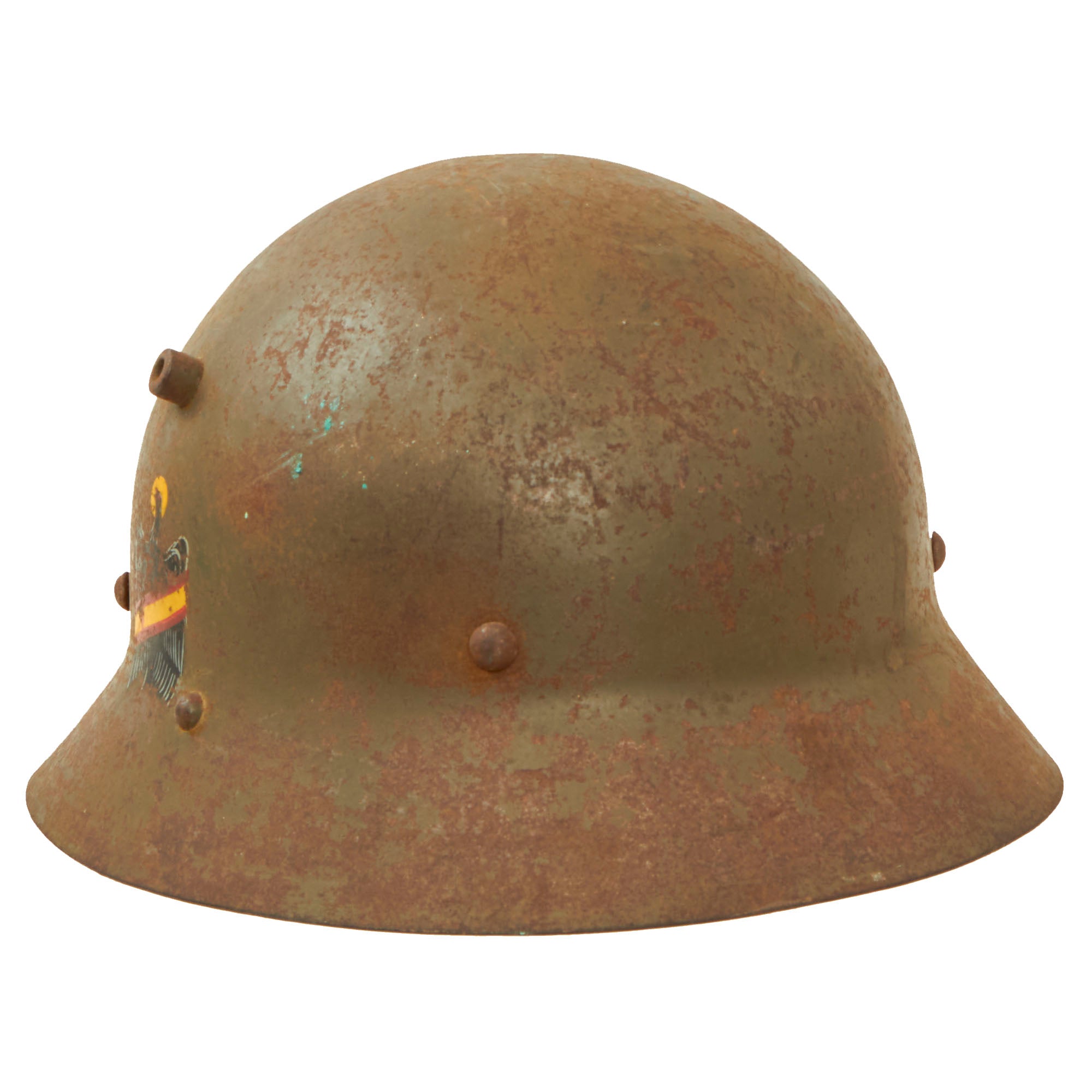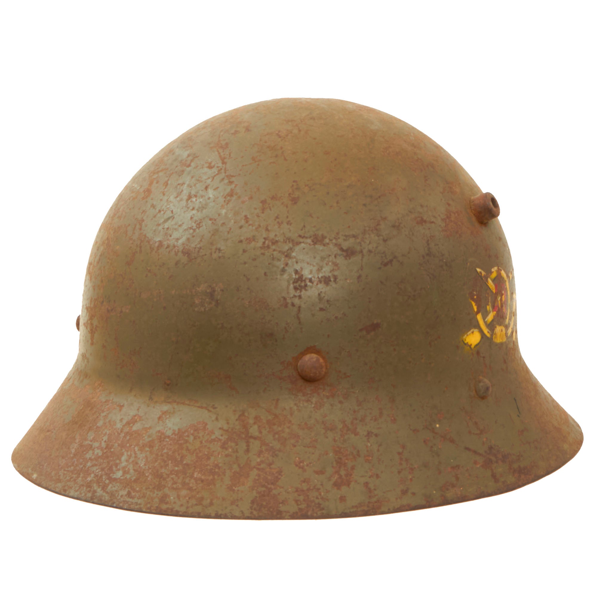 This example was utilized by the Fascists, with the insignia for the Franco’s Fascist 40th Infantry Regiment stenciled on one side, and the Fascist eagle painted on the other. These are extremely difficult to find with this insignia. The helmet retains its chinstrap but the liner is gone. The helmet still retains the three liner pins, however.