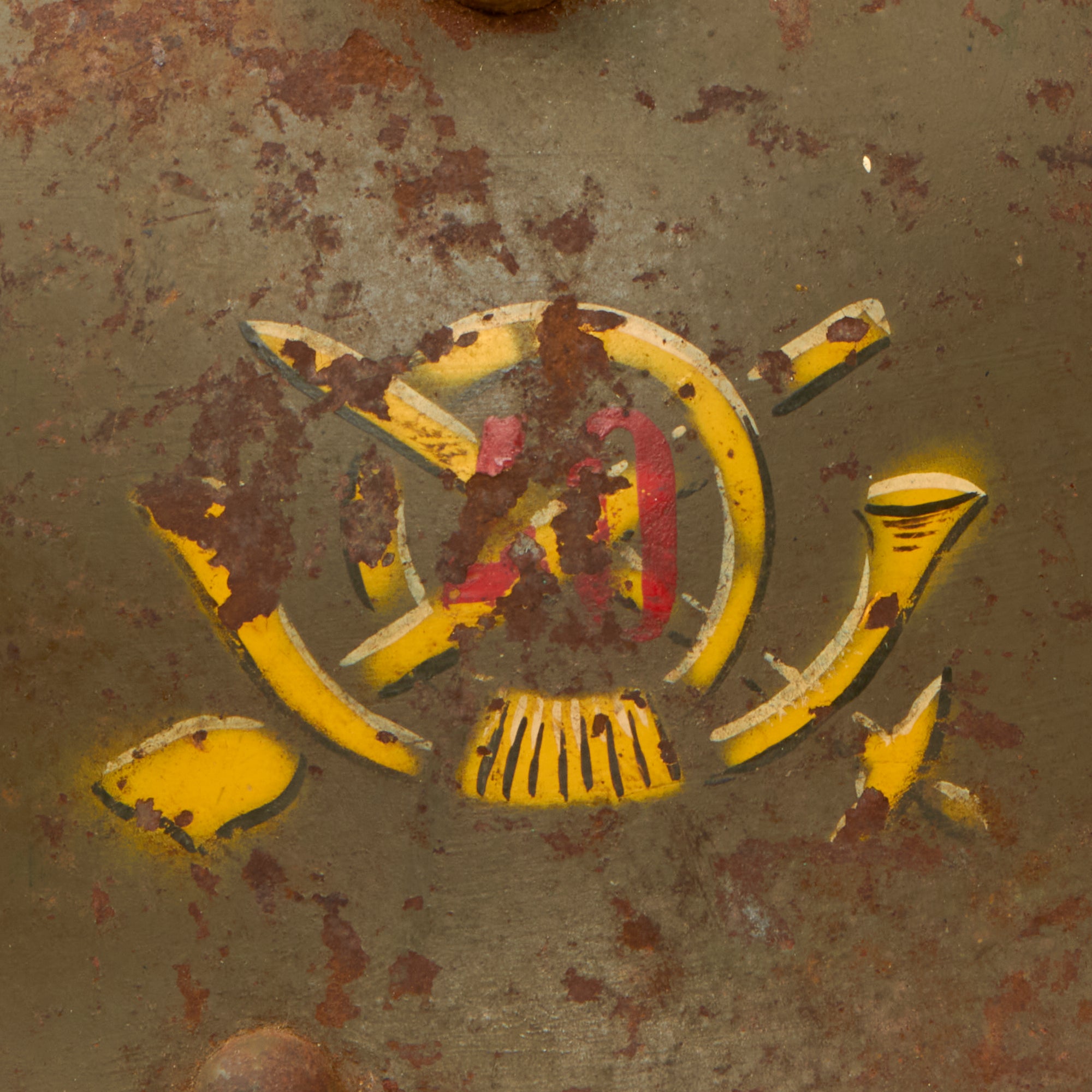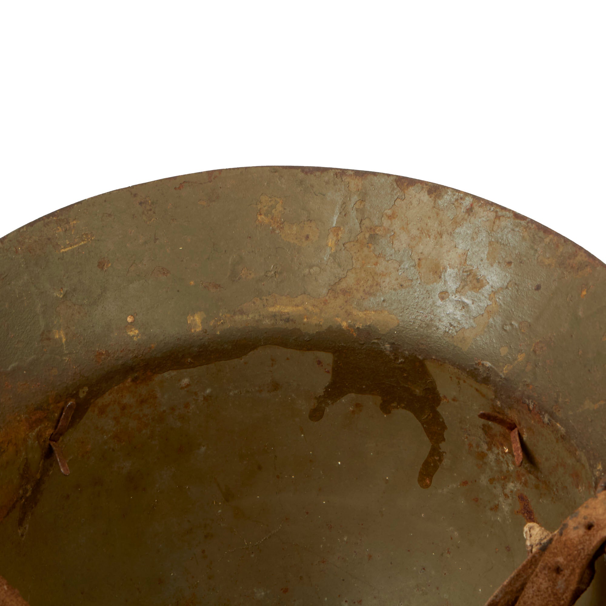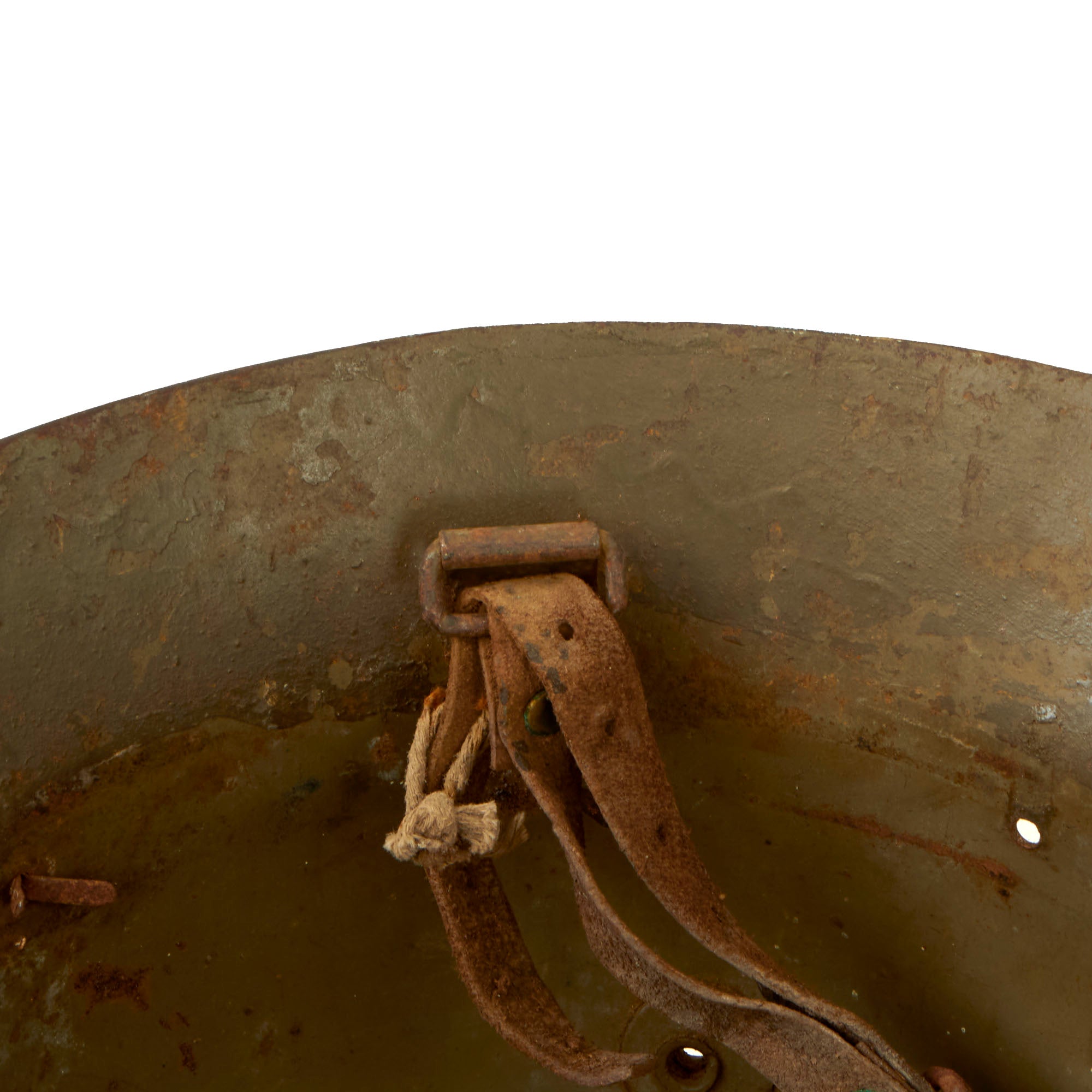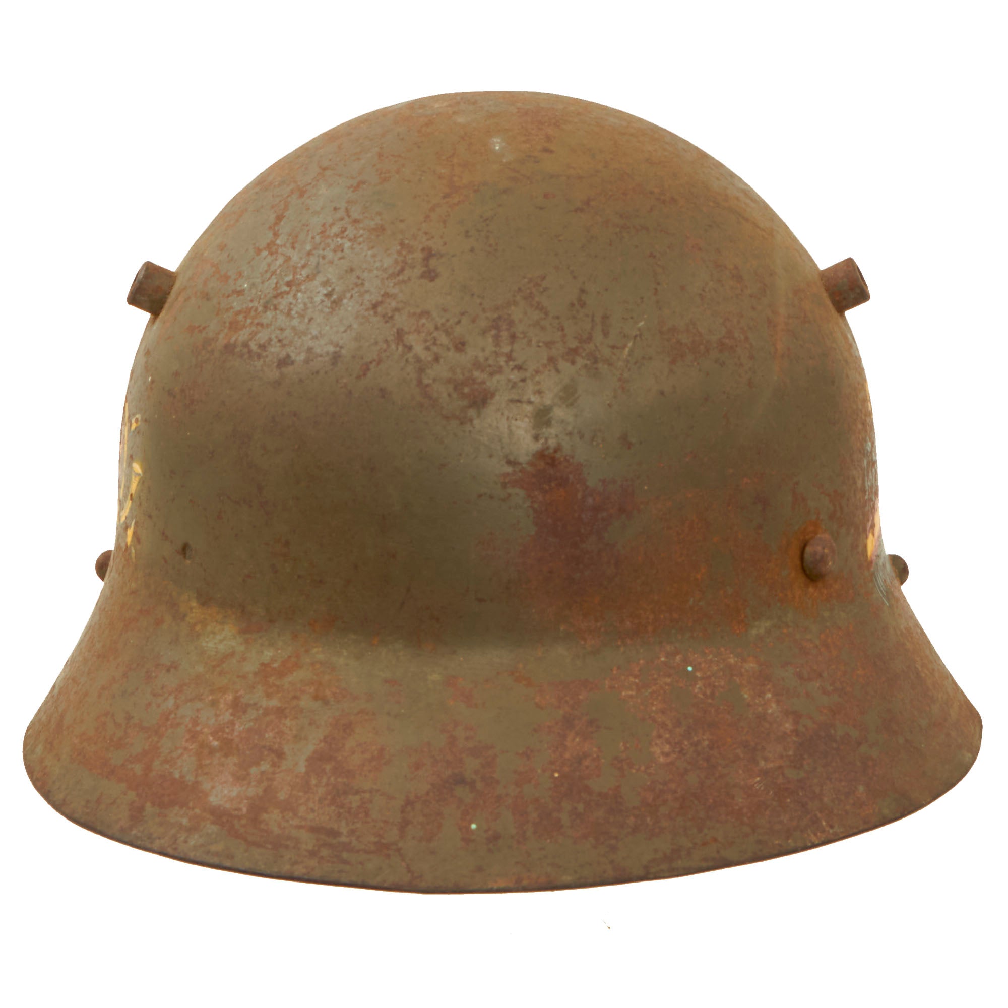 This example was utilized by the Fascists, with the insignia for the Franco’s Fascist 40th Infantry Regiment stenciled on one side, and the Fascist eagle painted on the other. These are extremely difficult to find with this insignia. The helmet retains its chinstrap but the liner is gone. The helmet still retains the three liner pins, however.