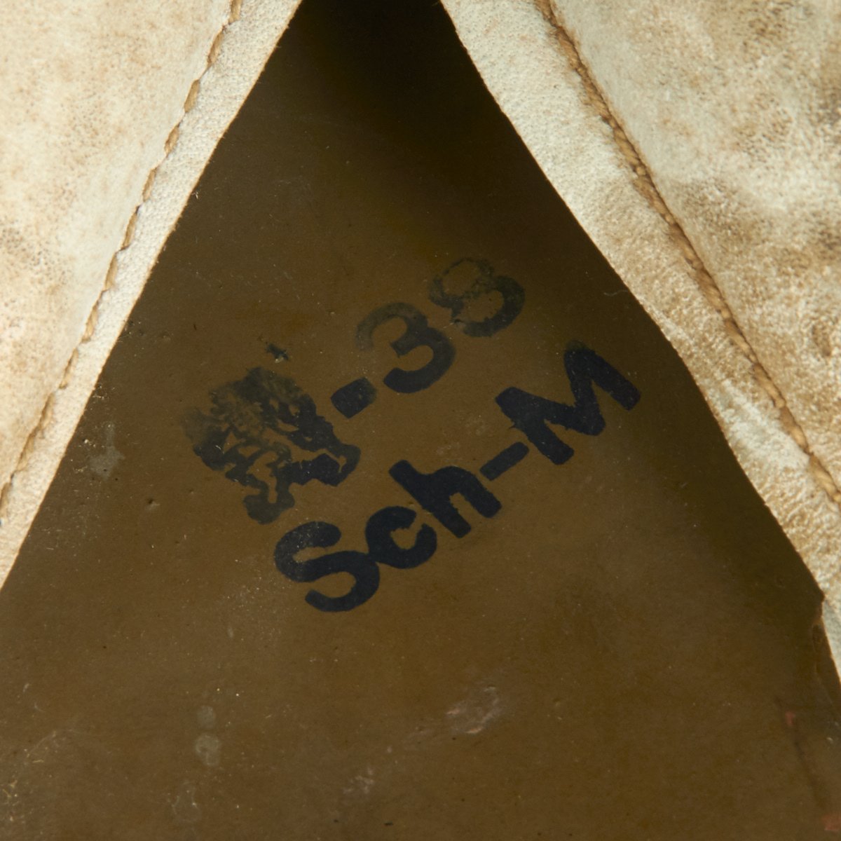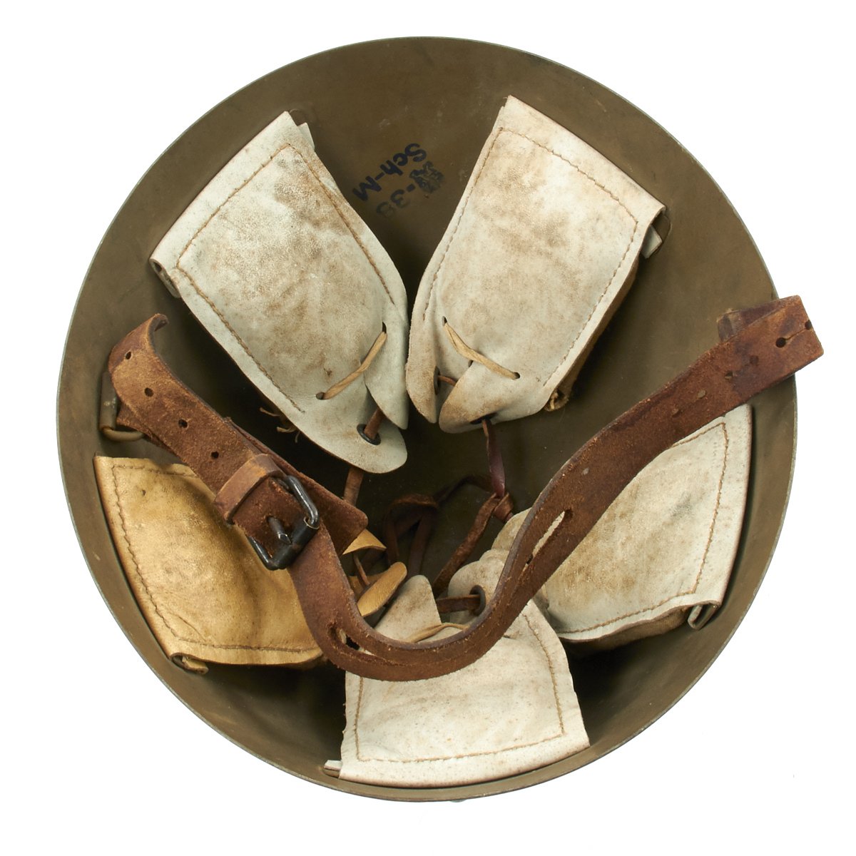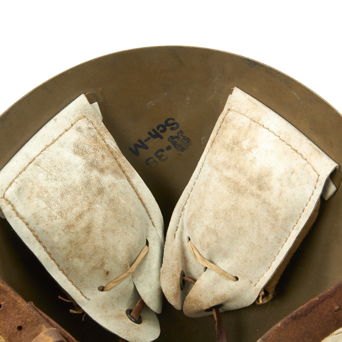 This helmet is still in the original Pre-War configuration, with olive paint and the original liner. The shell has ink-stamped markings on the inside of the shell: Sch-M, which denotes manufacture by C.A. Scholtz in Matejovce, which is today located in Slovakia. Below that is the insignia of a Lion, which is the acceptance stamp of the Czech Army. The two digit number to the right is the date of issue, in this case 1938. All pads still have the original horsehair stuffing, and each is also stamped Sch-M (LION) 38 on the underside.