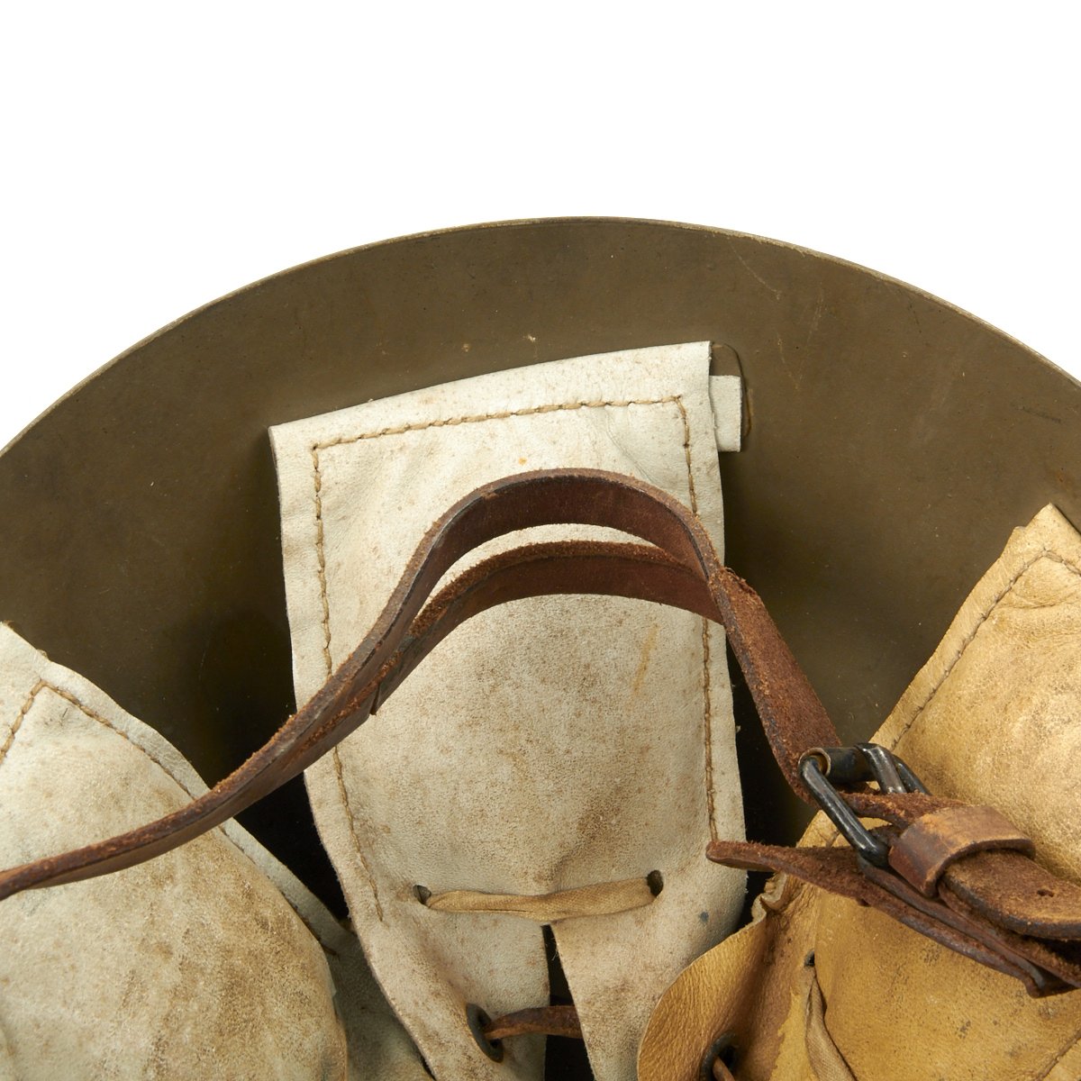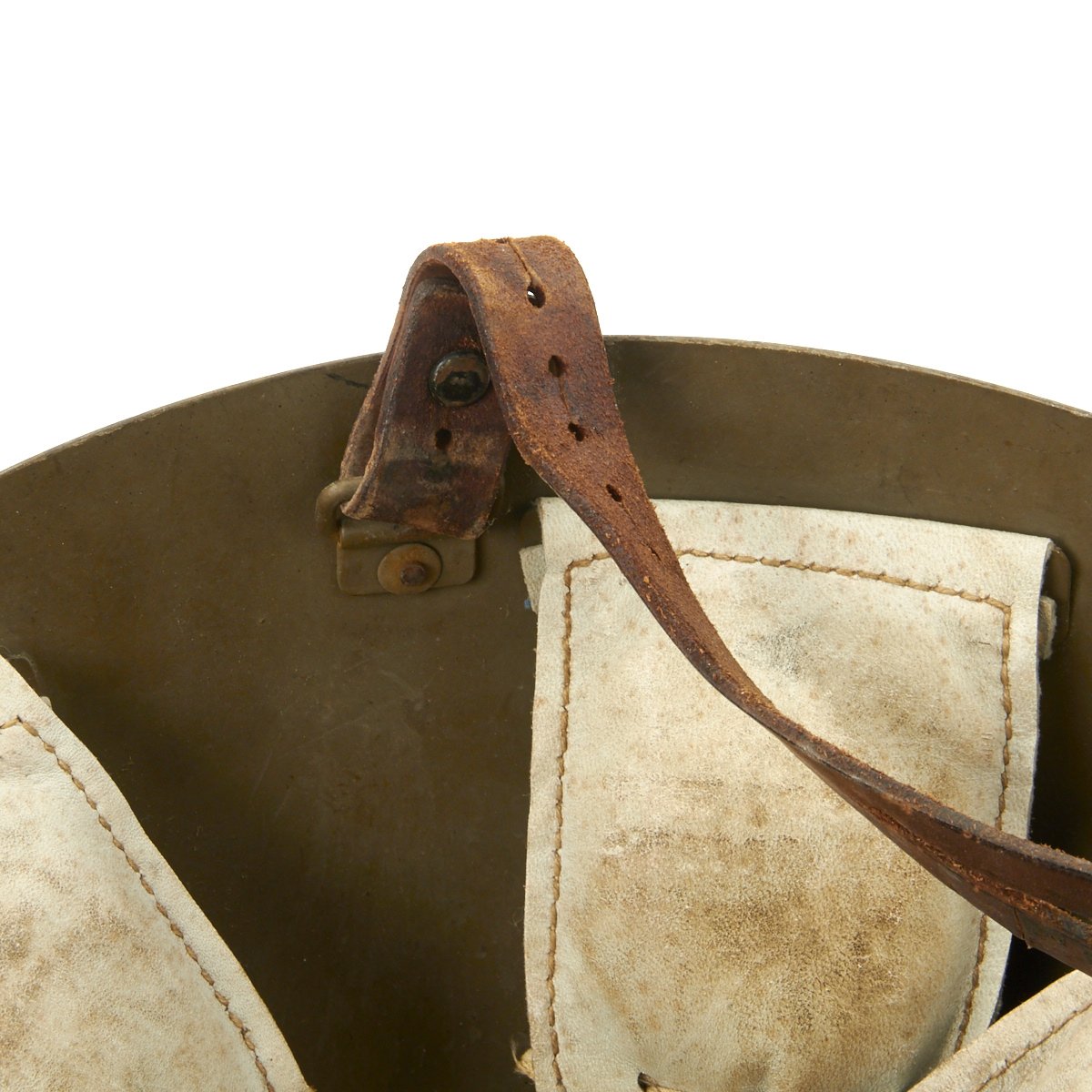 Most Vz32 helmets were refurbished post war, making this a rare find. There is however some black paint in areas on the outside, so it may have had some type of repairs made. The exterior shell retains almost all of the original paint, with a nice patina of age. The chin strap and liner are also in very good condition, with just a bit of staining from age on both. The leather is a bit dry after years of storage.