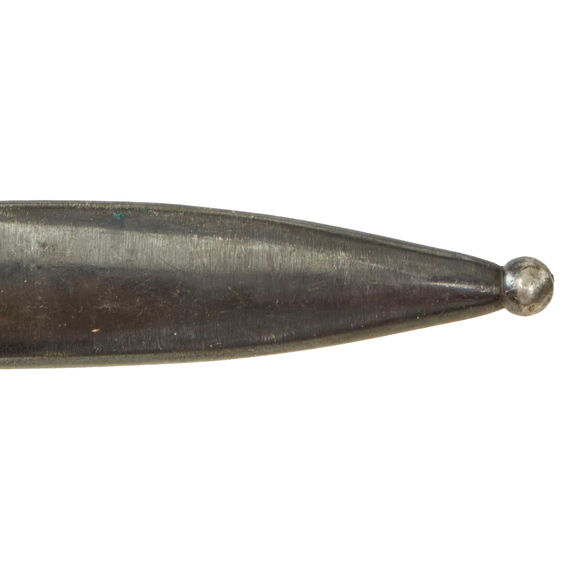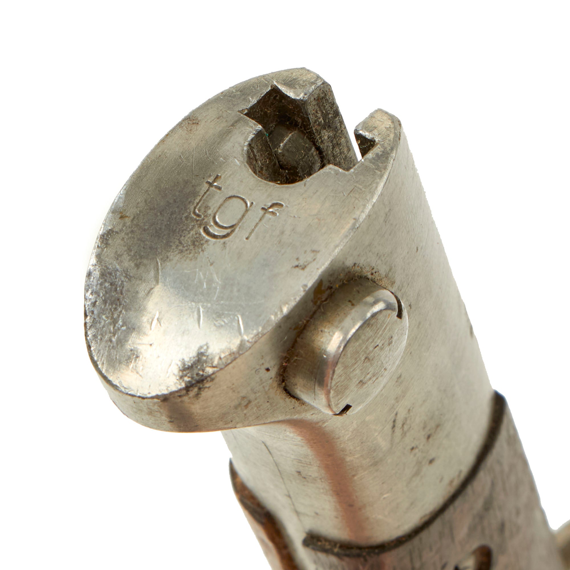 The pommel of the bayonet is marked with ordnance code tgf, and on the spine of the hilt E3 (CZECH PROOF) 48, for a date of 1948. The scabbard is marked similarly csz E (CZECH PROOF) 26 for a date of 1926.
