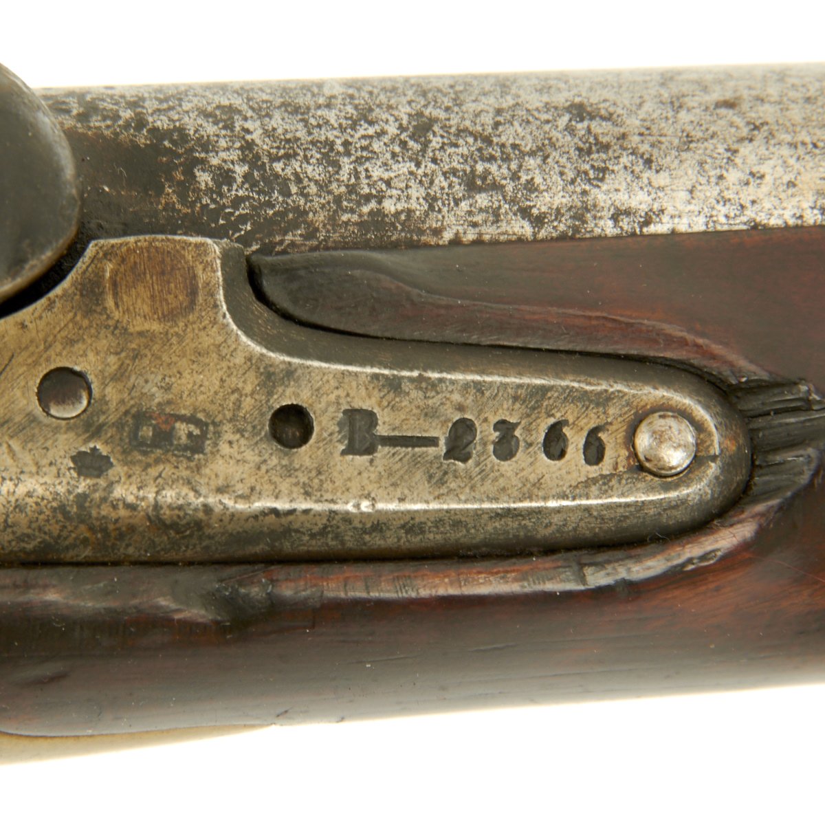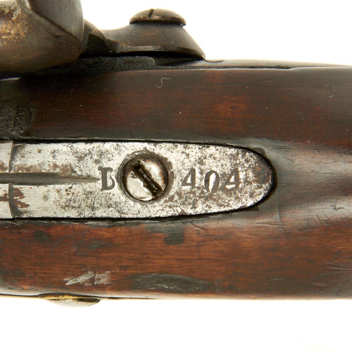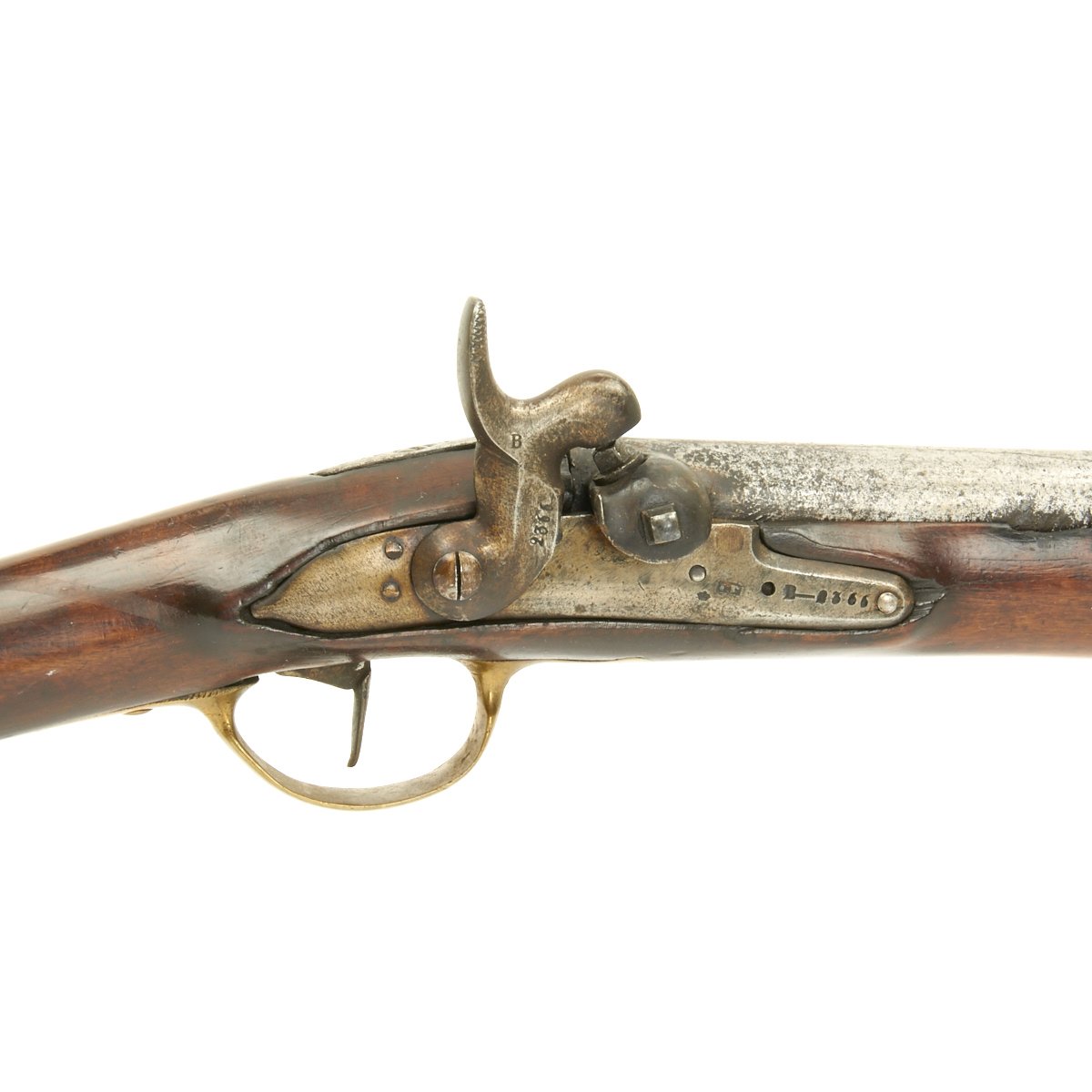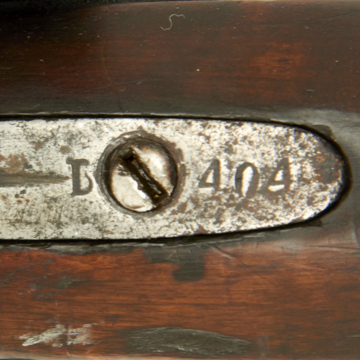 The barrel bears the serial number of L - 404 which is repeated on the tang. There is a Regimental marking on the butt plate of N 75. This musket was converted to percussion in 1843 and renumbered 2366 on the lock plate and the percussion hammer. It has the typical HUGE buttstock plate retaining bolts, intended to protect the delicate brass when the stock was rested on the ground. Cap lock nipple is intact but has been been work down quite a bit. In a nice collectible condition, ready to display.