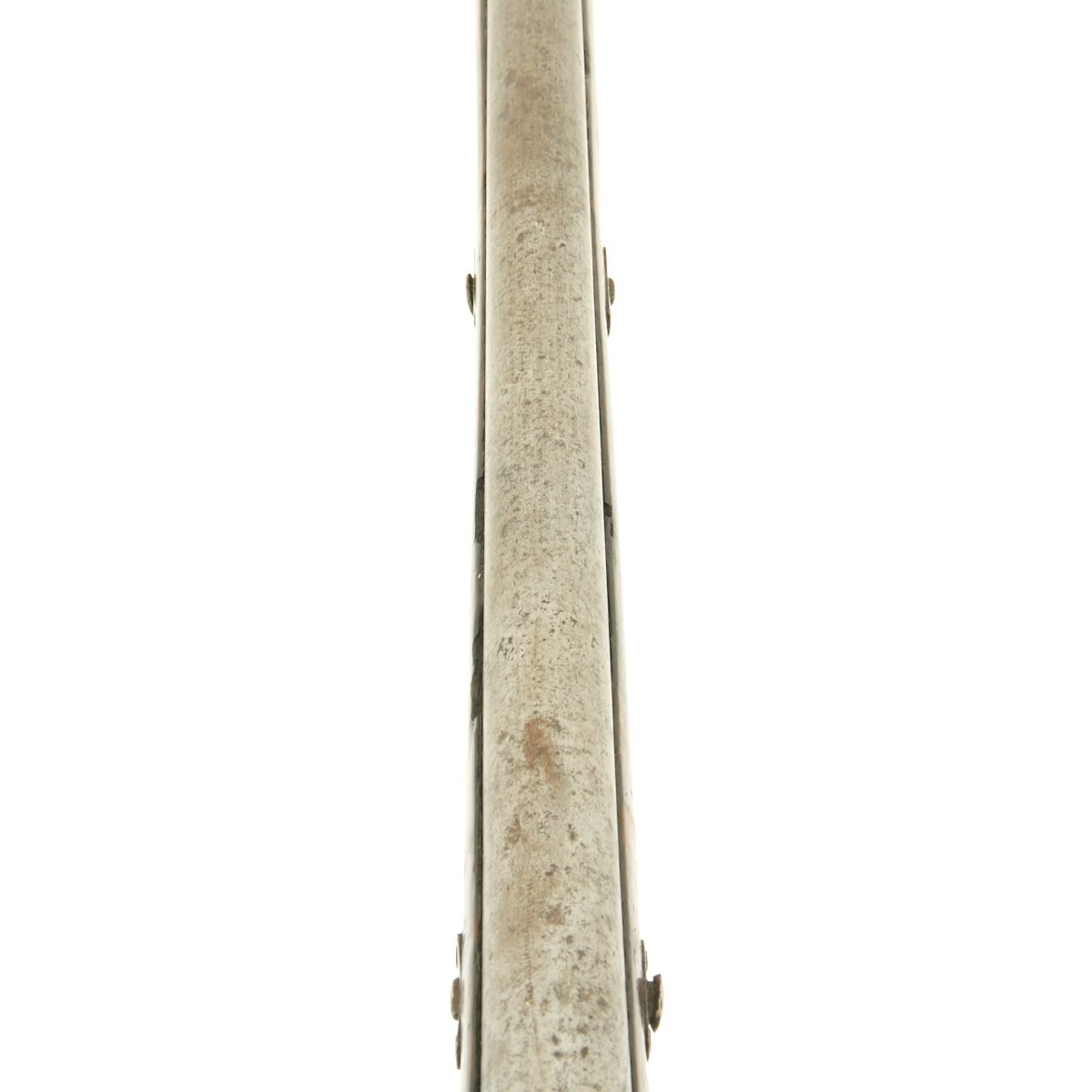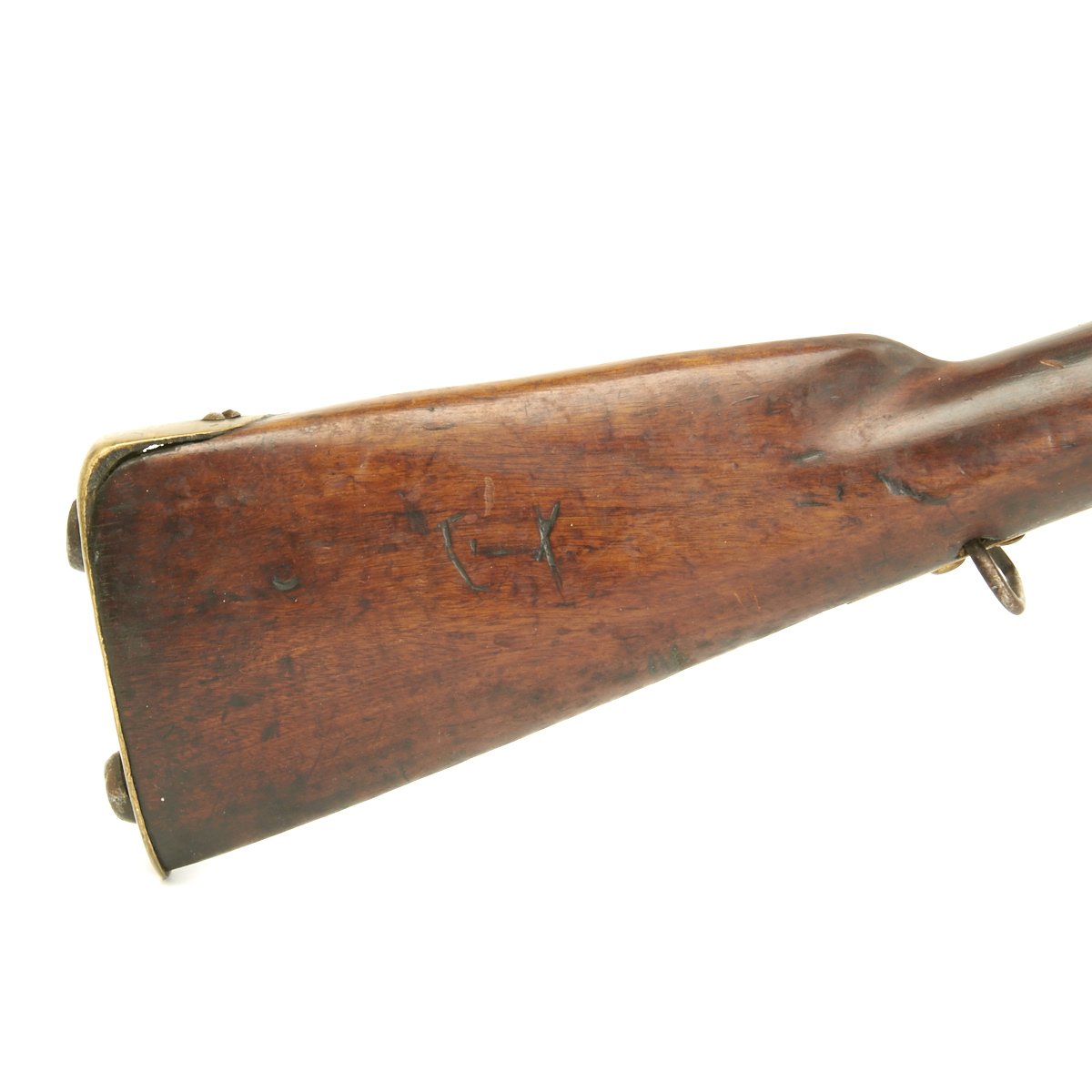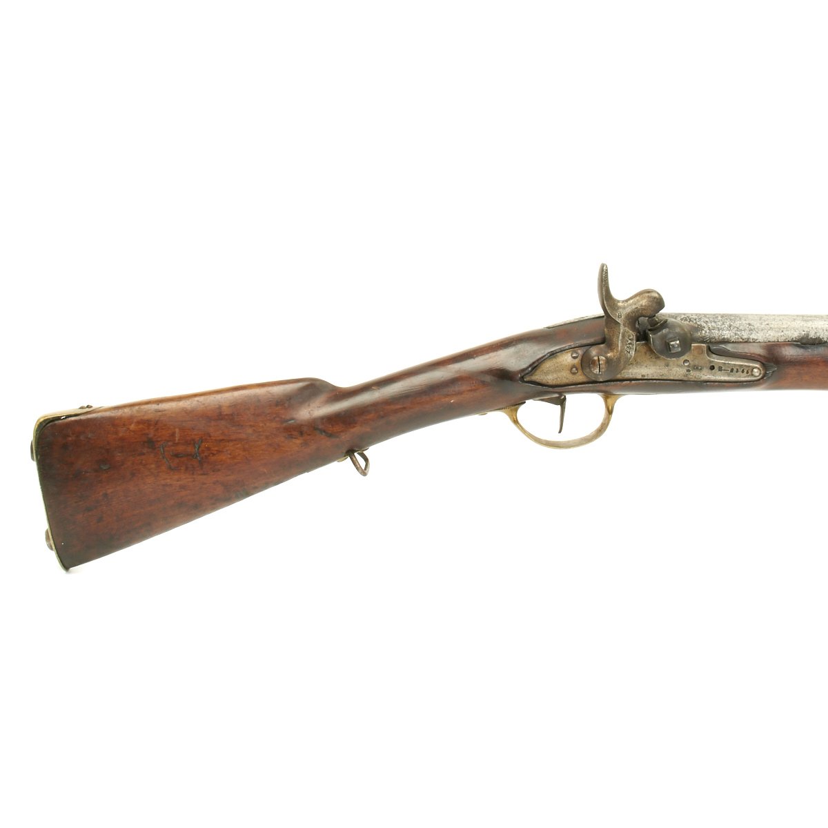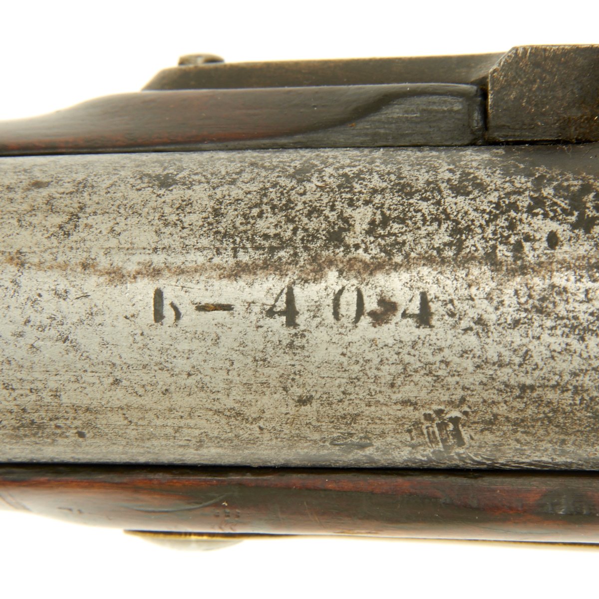 The barrel bears the serial number of L - 404 which is repeated on the tang. There is a Regimental marking on the butt plate of N 75. This musket was converted to percussion in 1843 and renumbered 2366 on the lock plate and the percussion hammer. It has the typical HUGE buttstock plate retaining bolts, intended to protect the delicate brass when the stock was rested on the ground. Cap lock nipple is intact but has been been work down quite a bit. In a nice collectible condition, ready to display.