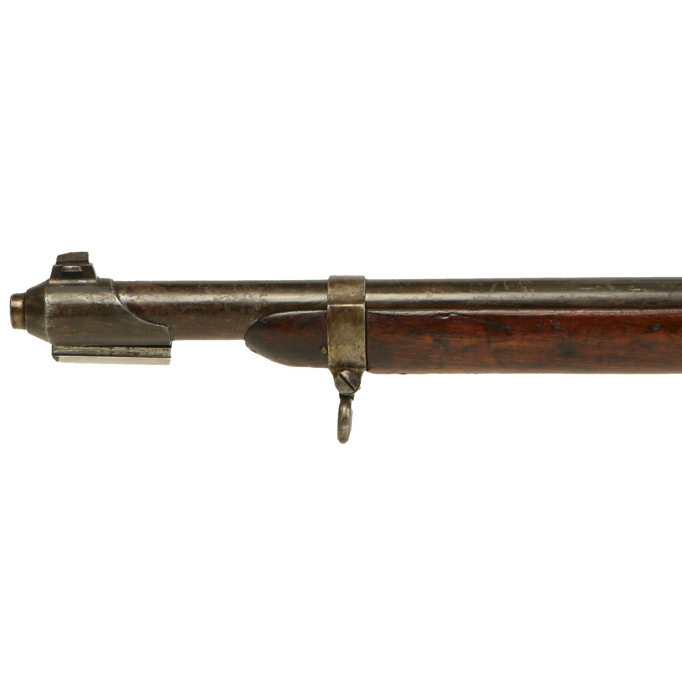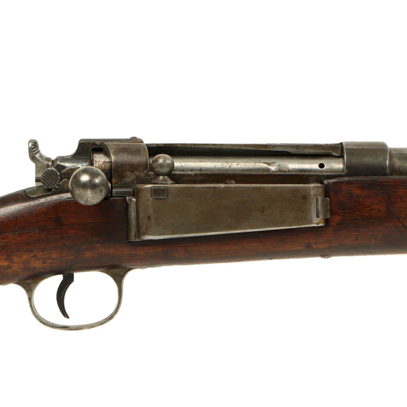 It was made in several variants, and this one is the Rifle M/89 (Gevær M/89): it is full stocked almost to the muzzle, has no top hand guard, a features a straight bolt handle and an outer steel liner for the barrel. This weapon is typical of the period in having a long barrel and stock without pistol grip. Was originally issued without a safety catch; instead, a half-cock notch on the cocking piece/firing pin assembly served this purpose. In 1910, this weapon was modified by the addition of a manual safety, which was placed on the right side of the receiver just behind the closed bolt handle.