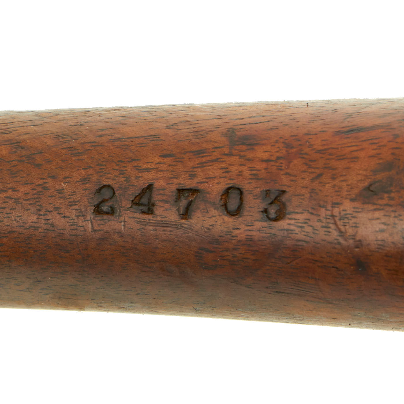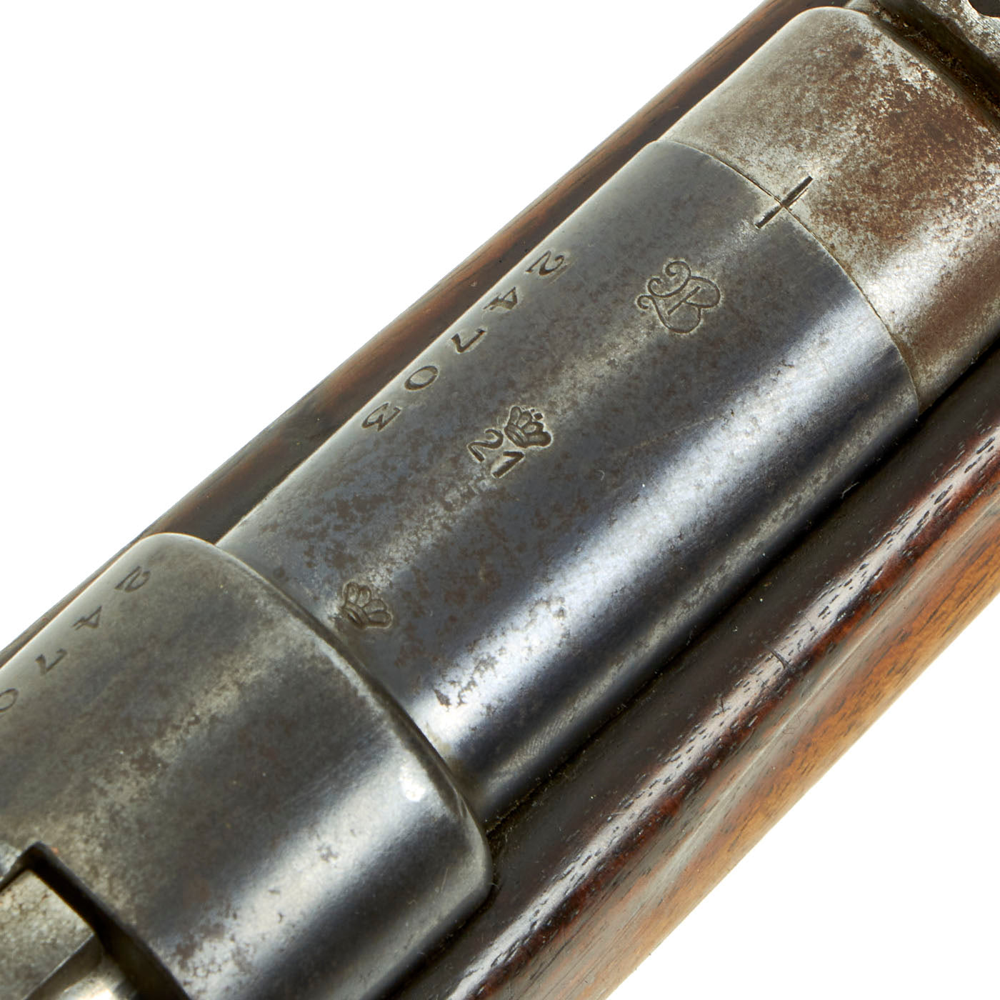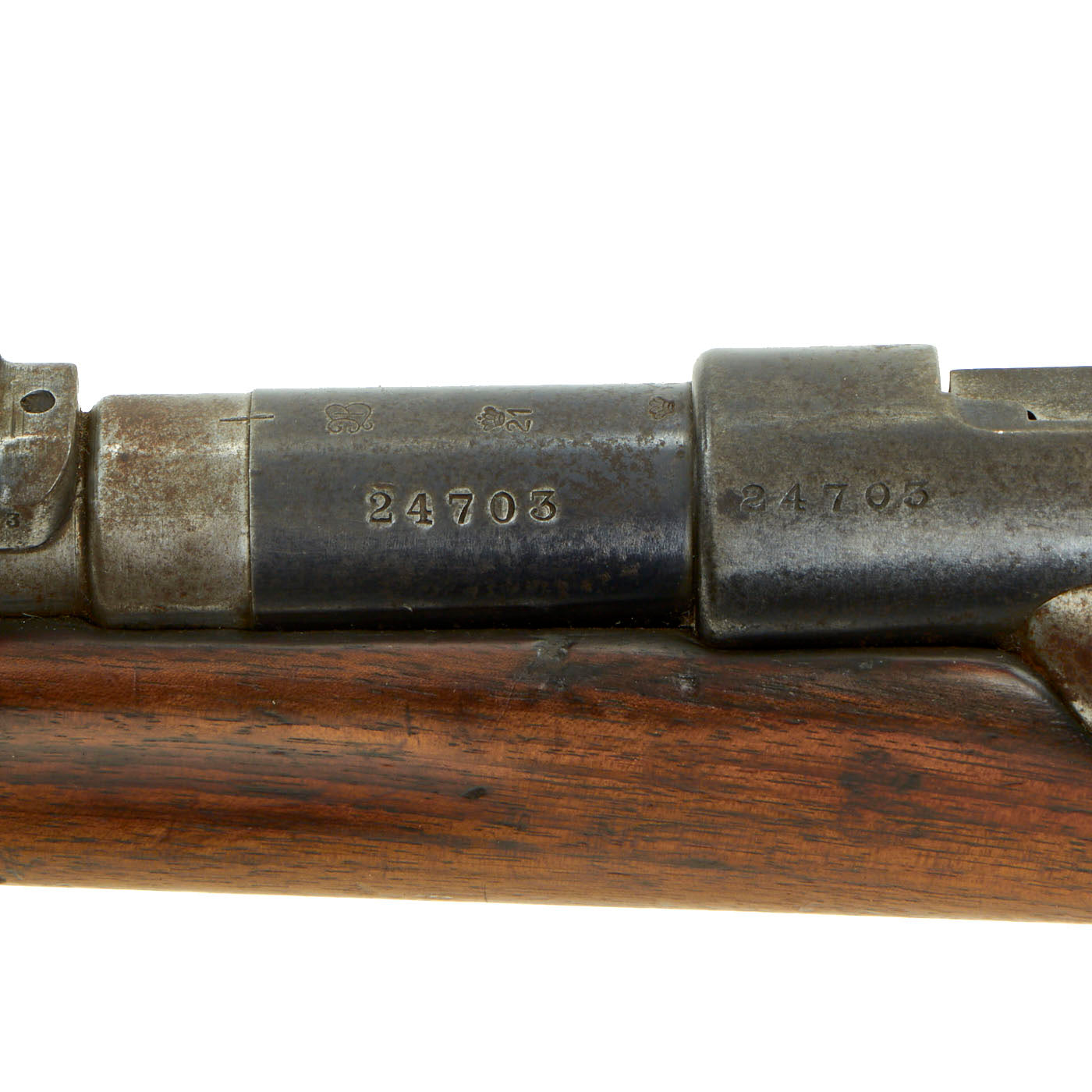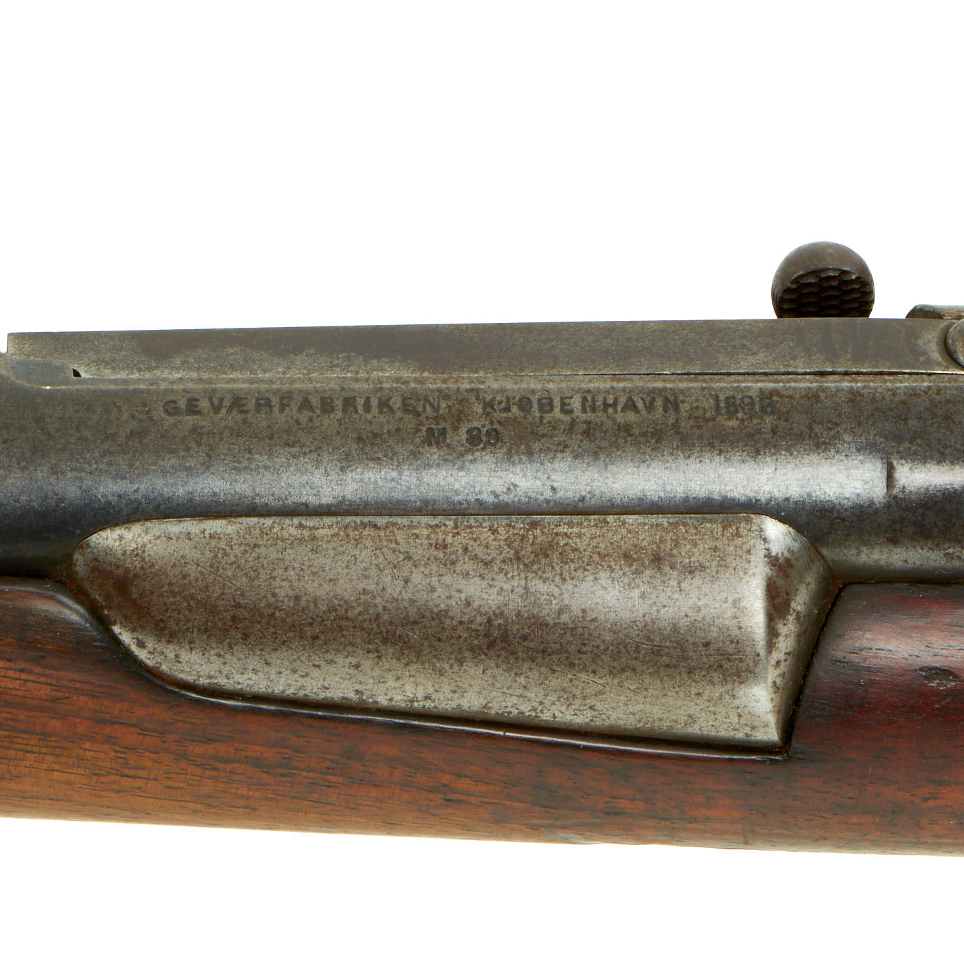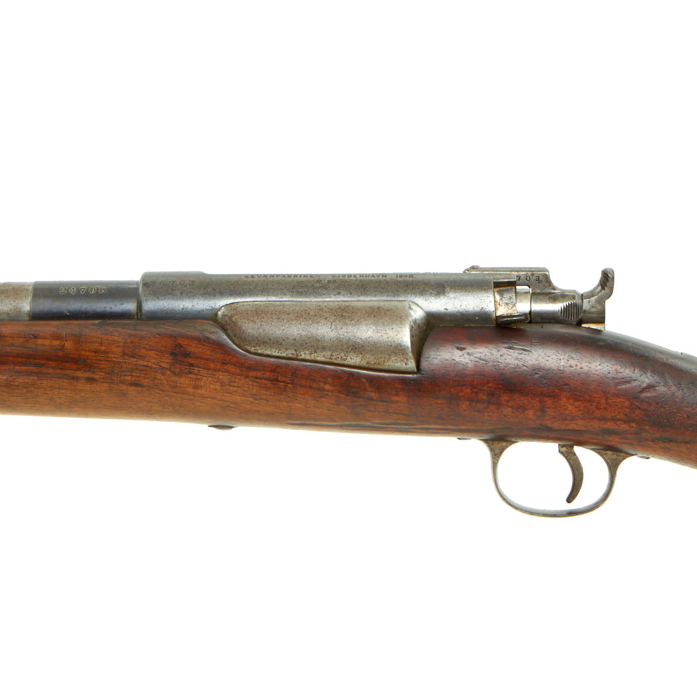 This indicates manufacture at the Danish Rifle Factory in Copenhagen, which manufactured almost all of their small arms. The rifle features all matching serial numbers of 24703 on the barrel, receiver, stock, bolt, and bayonet lug. Shortened serial number 703 is present on the bolt components, magazine components, and some other small parts. The rifle is in fine working condition, and has a great patina of age. It has a CROWN / 96 inspection proof over the chamber on the barrel.