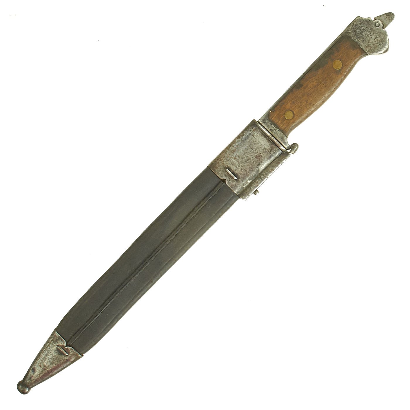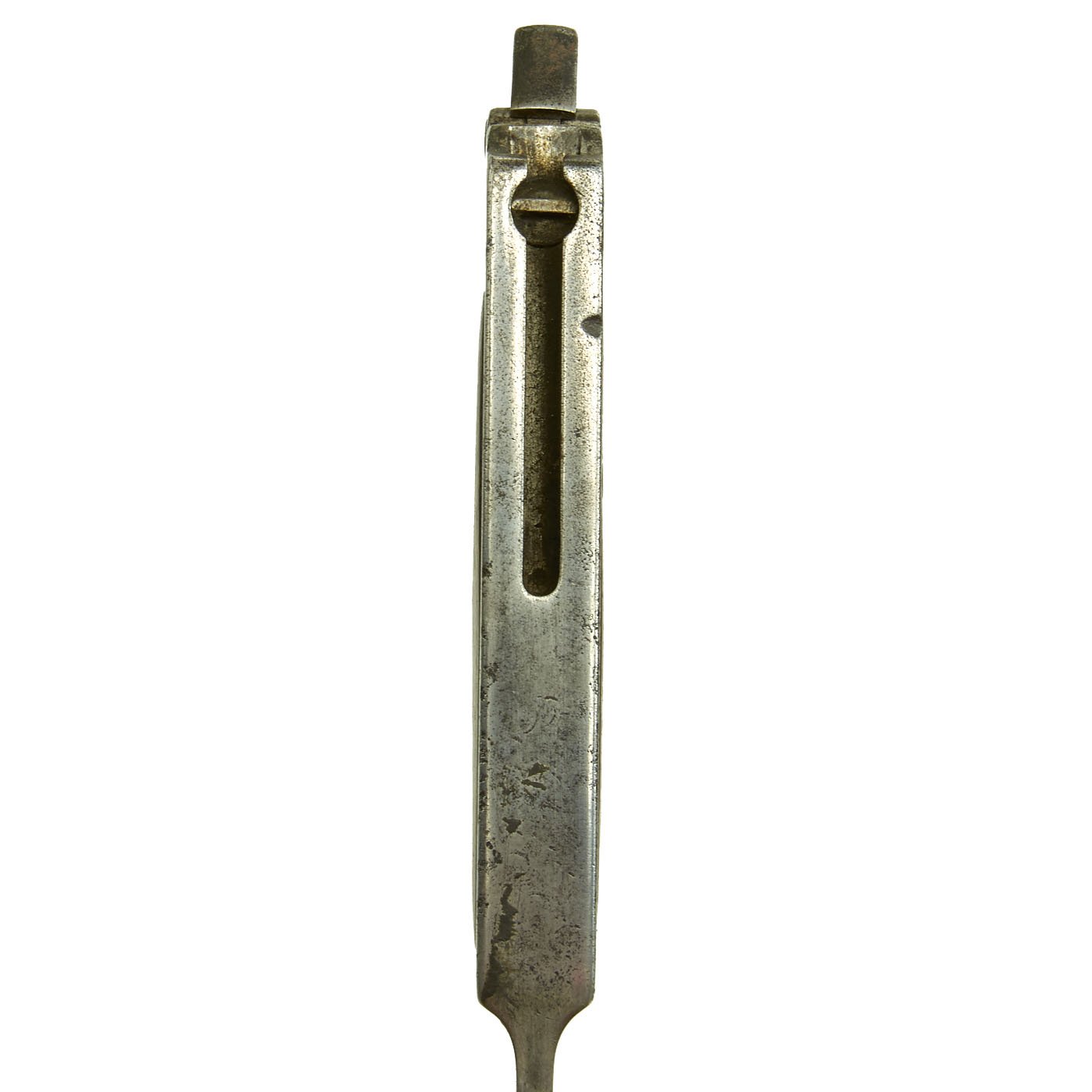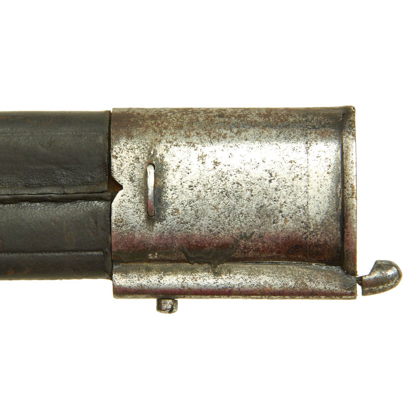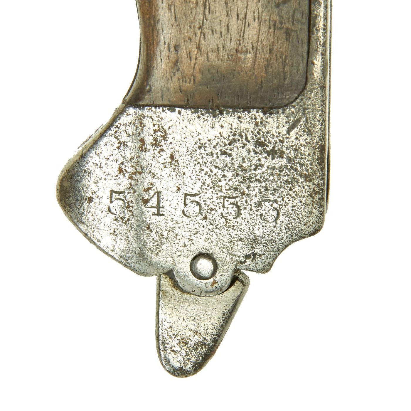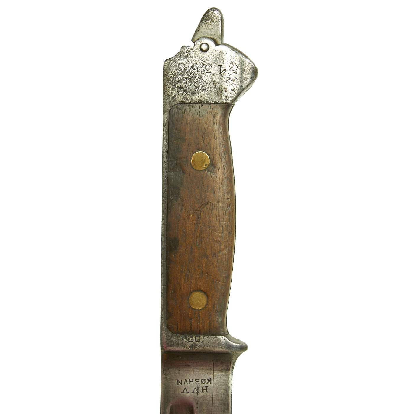 Original Item. Only One available. This is quite rare, and is a very nice example of a Danish Model 1889/93 Bayonet, intended for use on the Krag–Jørgensen Gevær M/1889 Rifle. The original Model 1889 bayonet featured a checkered leather grip but was improved in 1893 with this version having a wood grips secured by brass rivets. The bayonet is 13 3/4 inches overall, with a 9 inches long single edged fullered blade. The design is somewhat interesting, with a a triangular lever on the pommel of the bayonet moving the bayonet lock.
