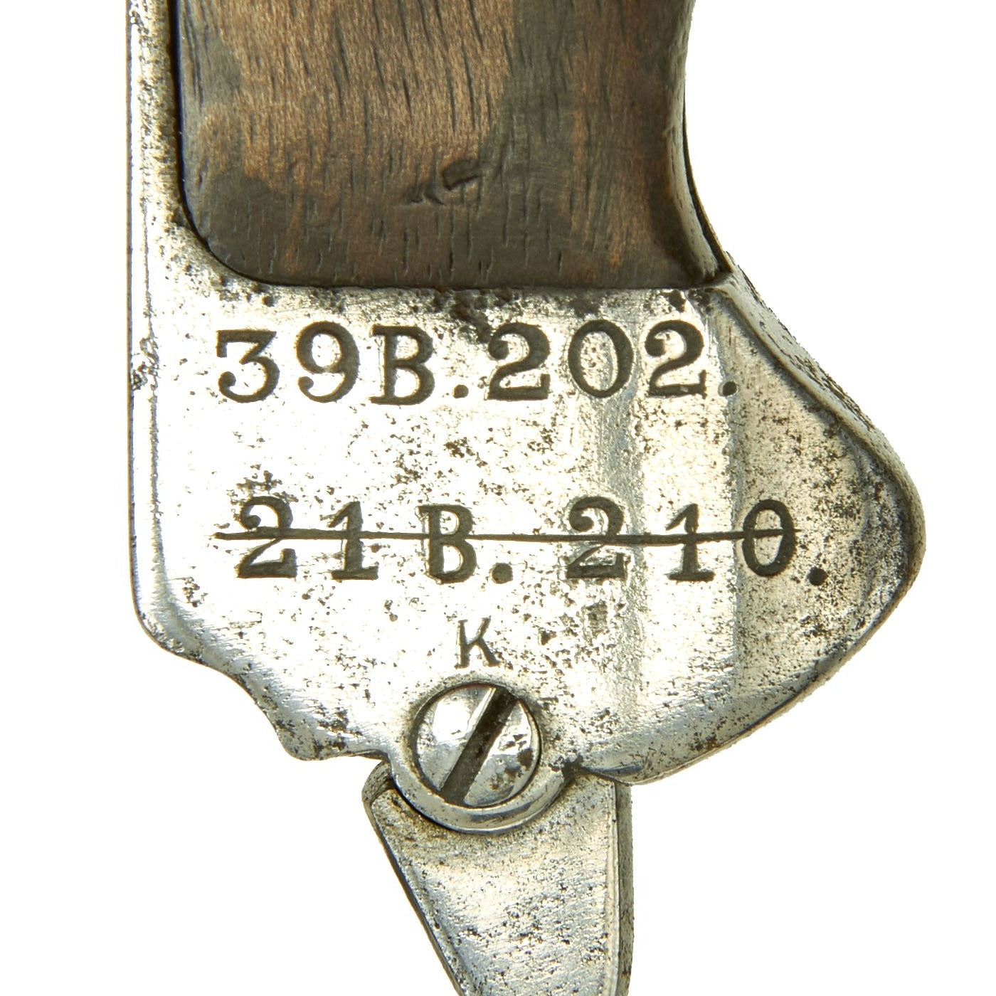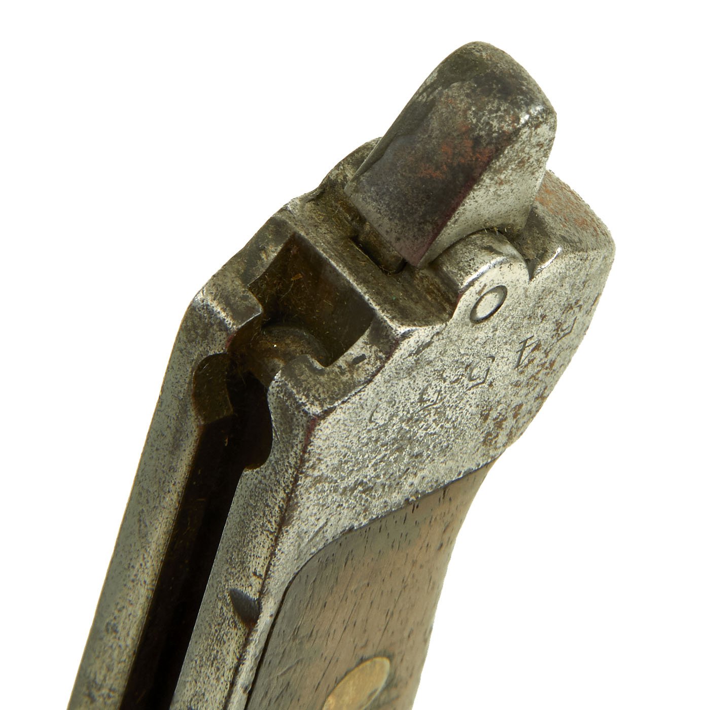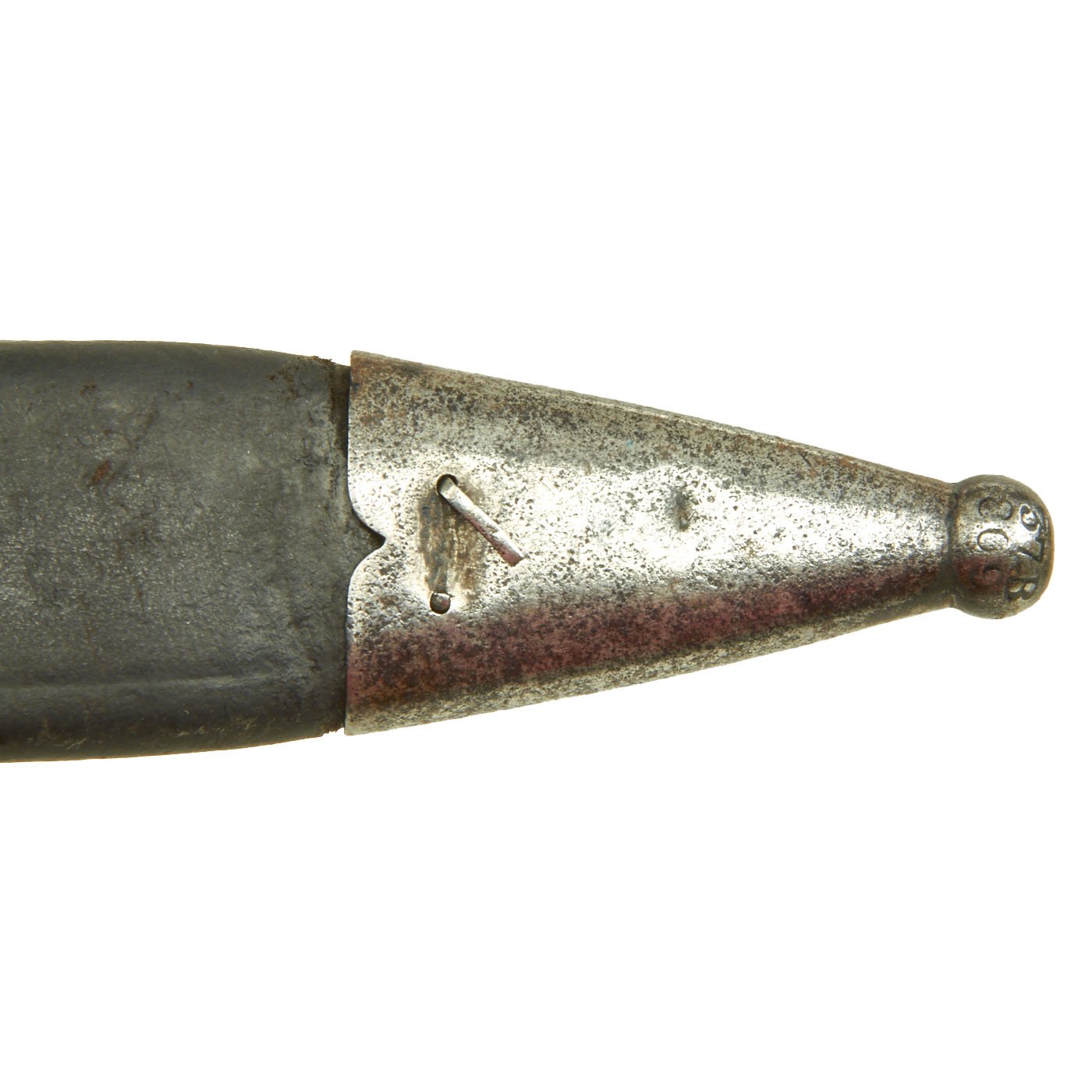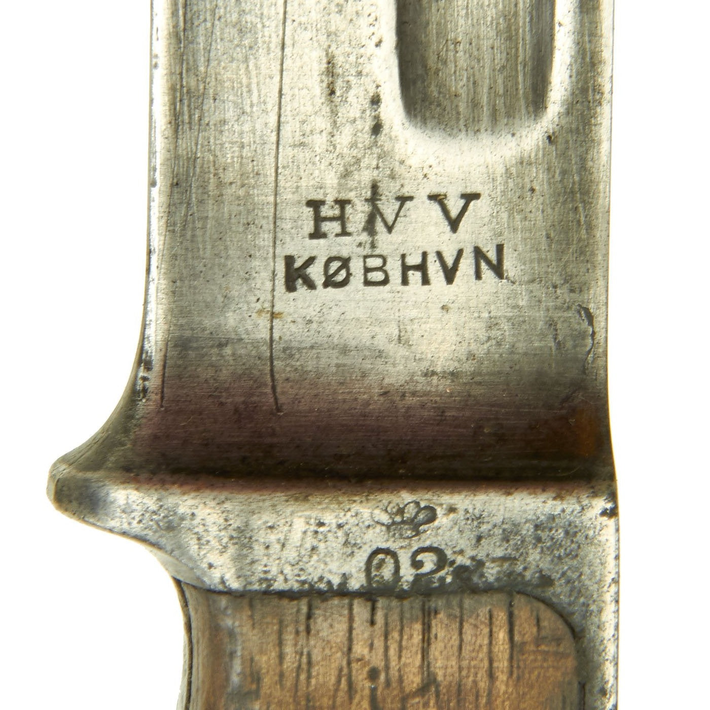 This very nice example is marked HVV over KØBHVN (Short for Copenhagen Arsenal), as well as CROWN / 02, probably for manufacture or acceptance in 1902. The pommel bears a serial number of 54553, which should match the rifle it was issued to. The other side has two Danish regimental markings, with one crossed out.