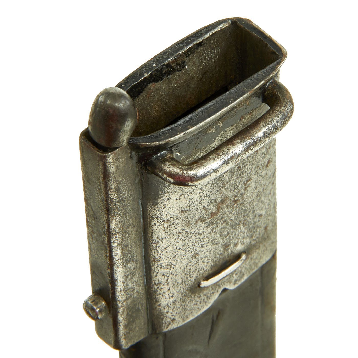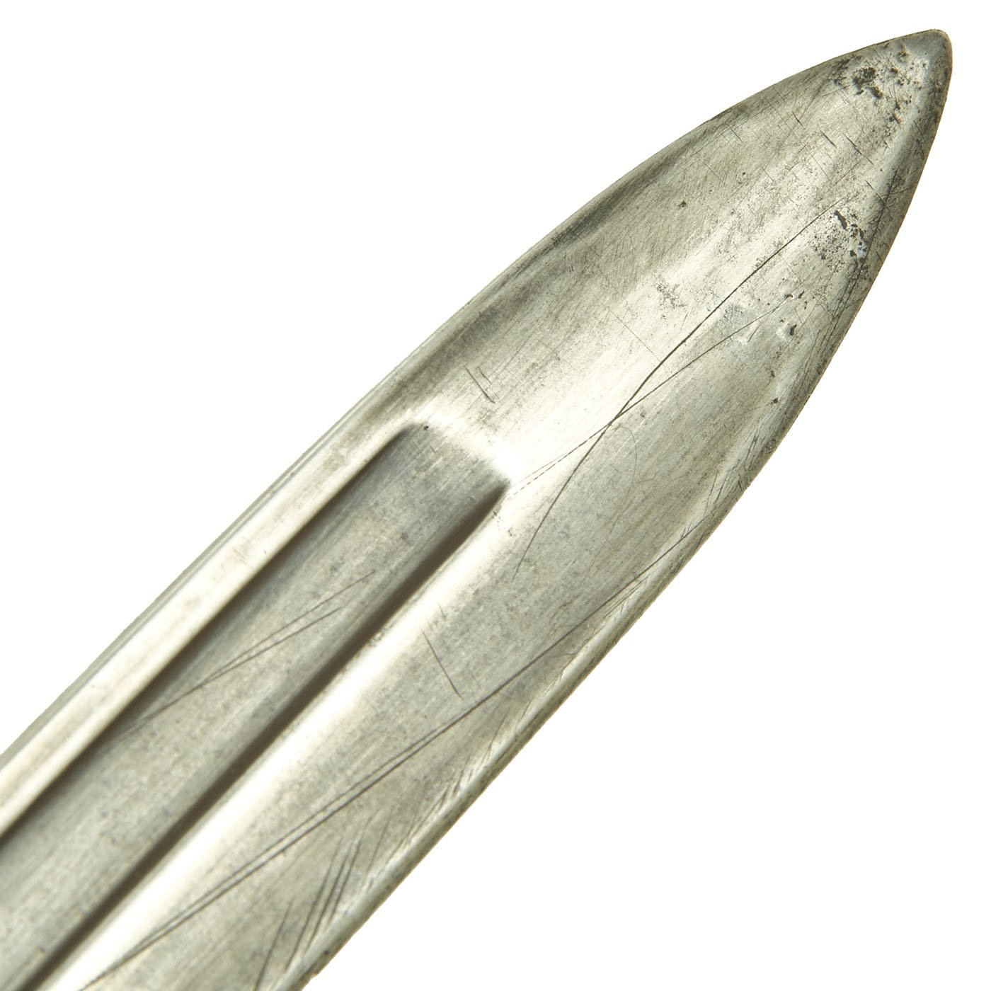 The bayonet and matching scabbard are in very good used condition, without any major issues or defects. The blade is nice, with sharpening and no major nicks or dents, and the grips are nicely broken in. The scabbard has solid leather, and locks correctly onto the crossguard of the bayonet.