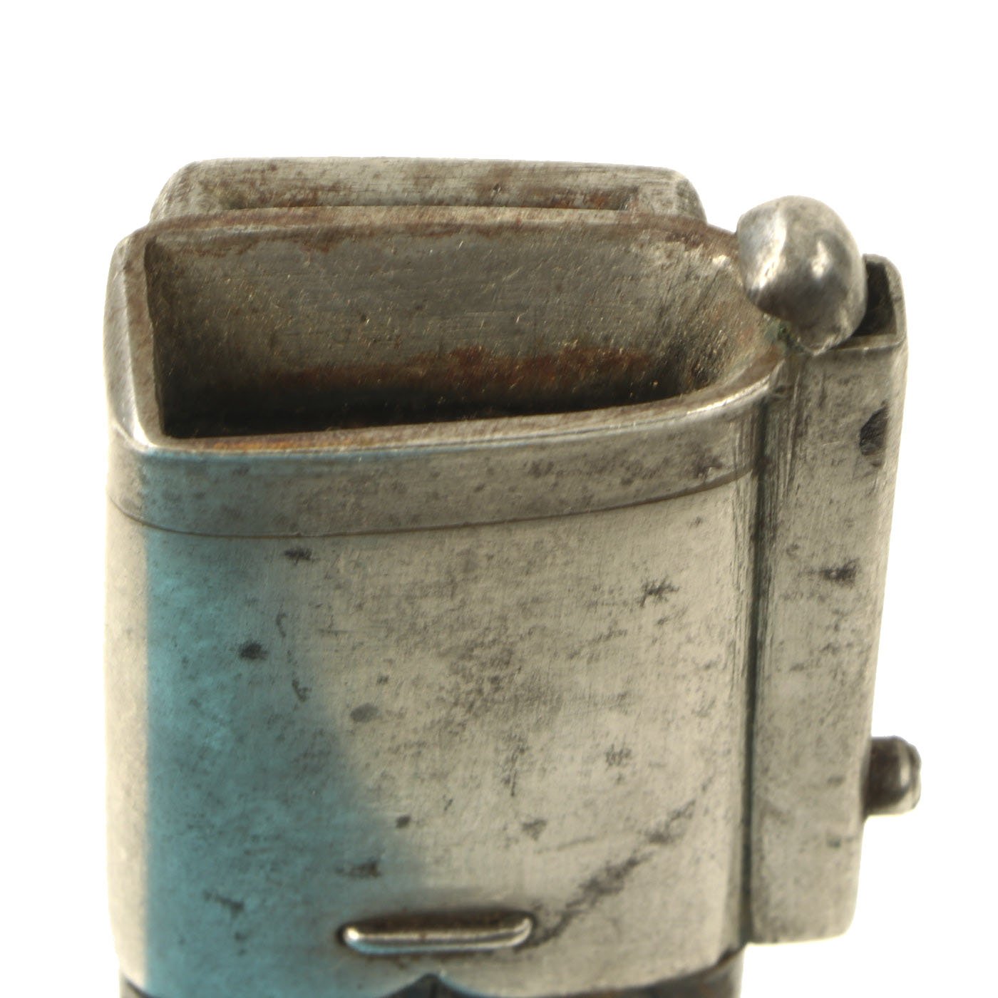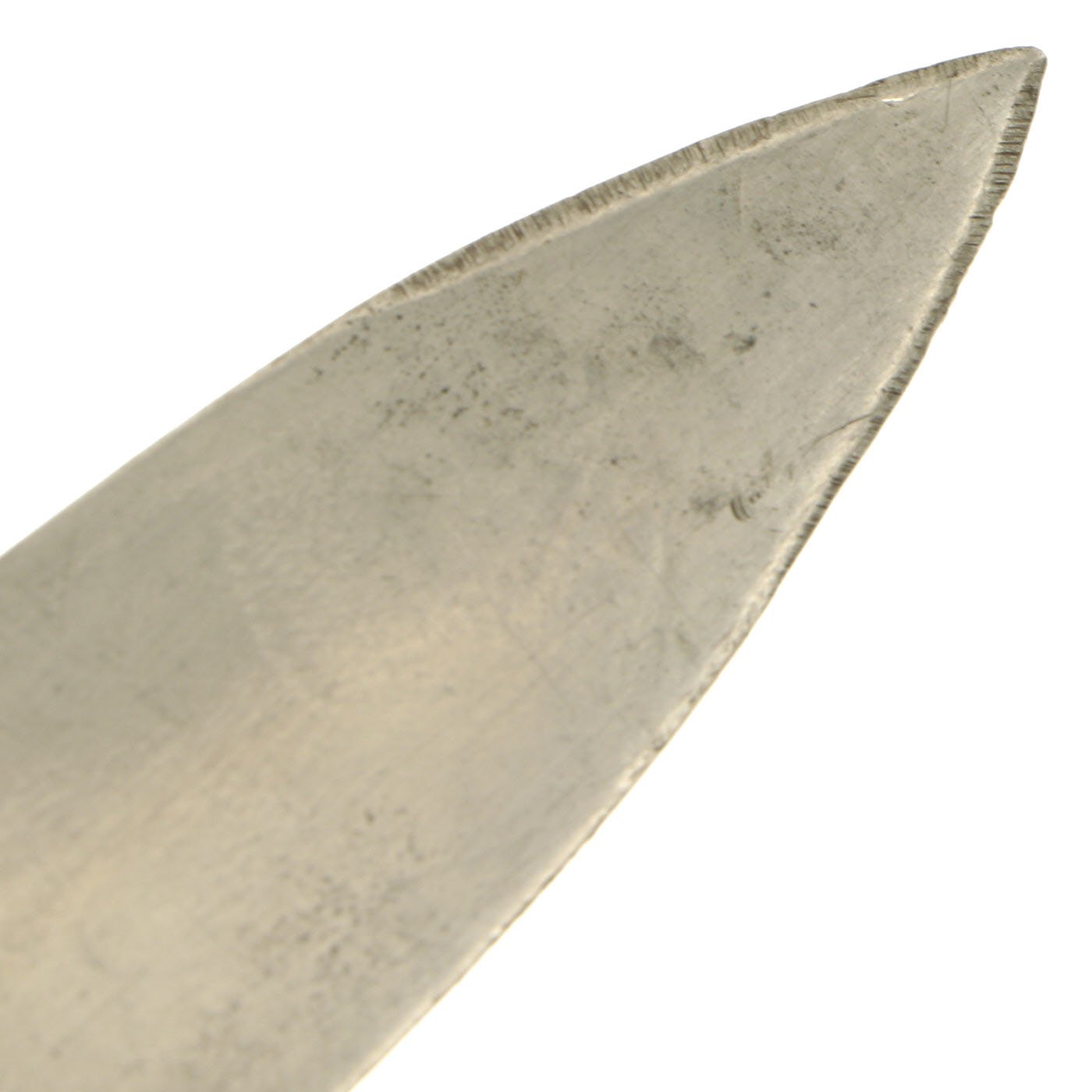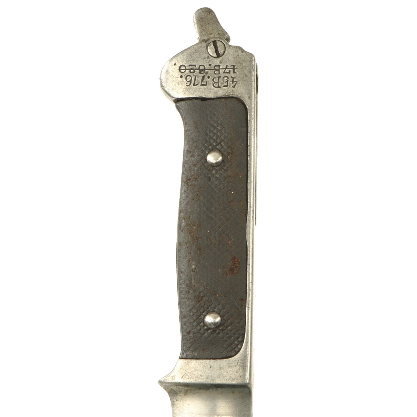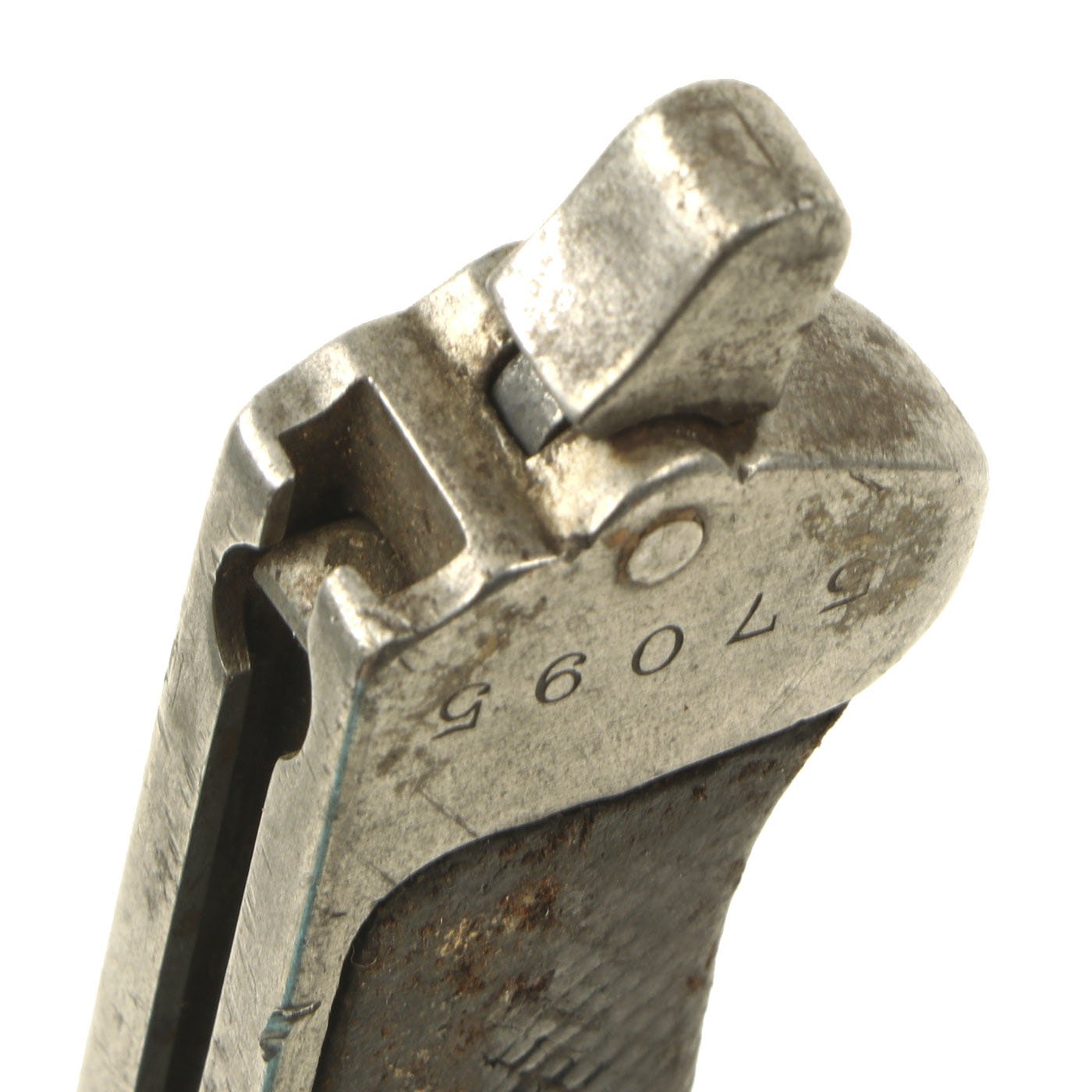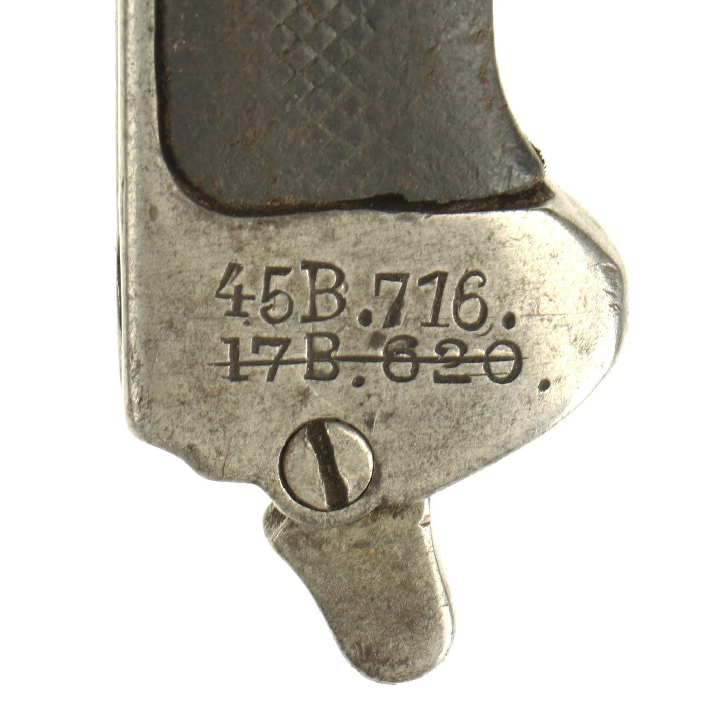 The bayonet and matching scabbard are in very good used condition, without any major issues or defects. The blade is nice, with light sharpening and no major nicks or dents, and the grips are nicely broken in, still showing intact checkering. The scabbard is still fitted leather, and locks correctly onto the minimal crossguard. The metalwork overall is still a nice bright steel, with minimal oxidation.