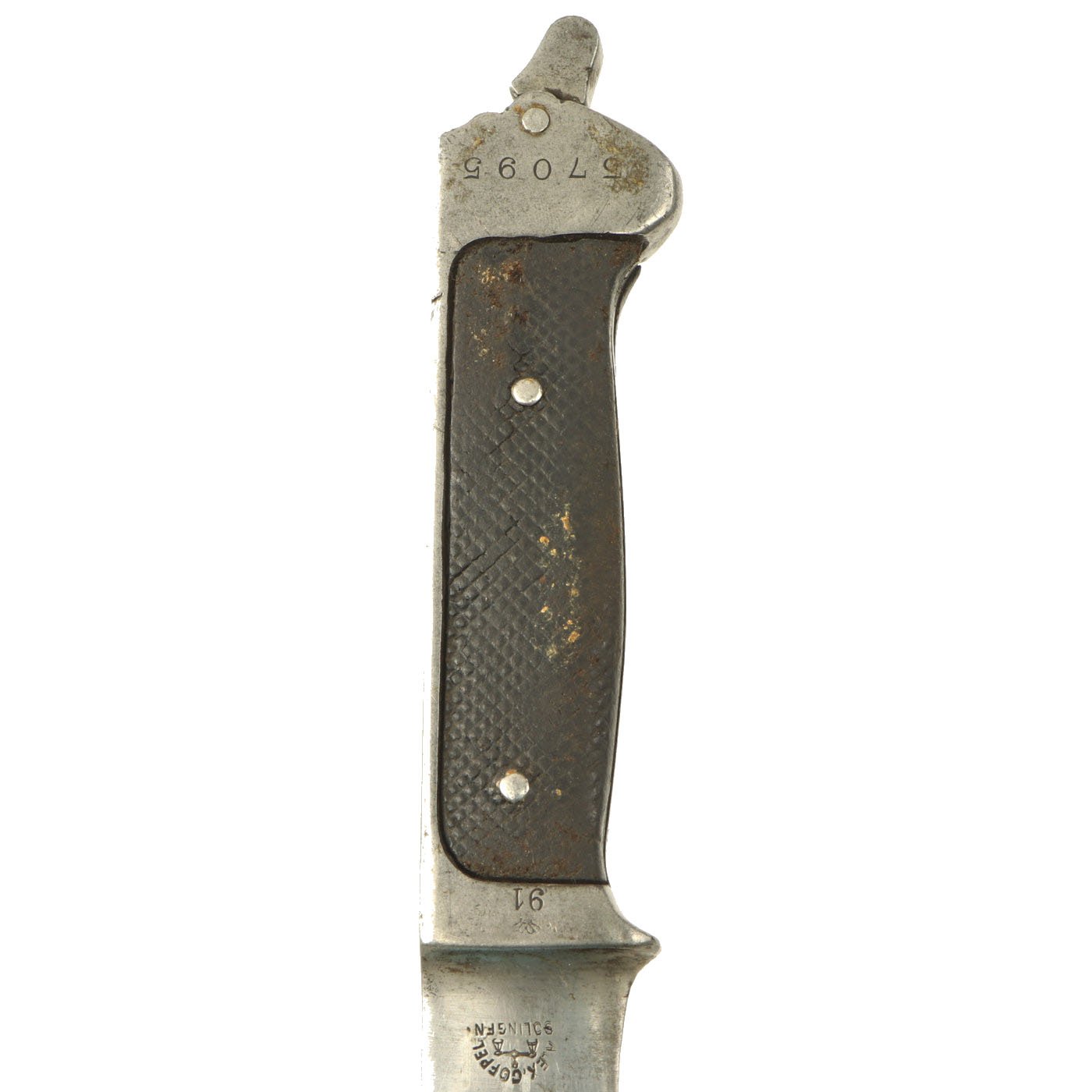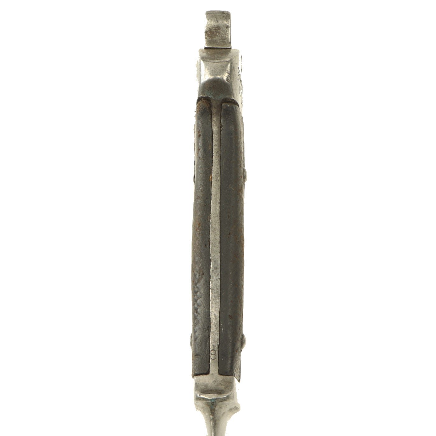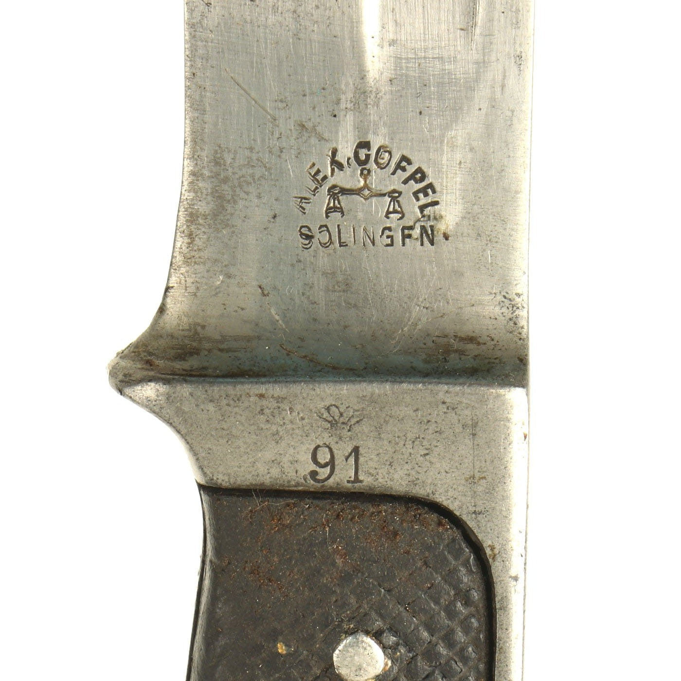 The blade ricasso of this example is maker marked ALEX. COPPEL / SOLINGEN, around the trademark "Scales" logo, indicating manufacture by Alexander Coppel & Co. located in the legendary "City of Blades", Solingen. This company made large amounts of export bayonets during the 19th century, and also manufactured bayonets for many years and up through WWII under the name Alcoso. Sadly, as the Coppel family was Jewish, they saw their company stolen from them and "Aryanized" during WWII by the NSDAP. For more information please see J. Anthony Carter’s work GERMAN KNIFE AND SWORD MAKERS. Later examples were made domestically so this is a very early example.