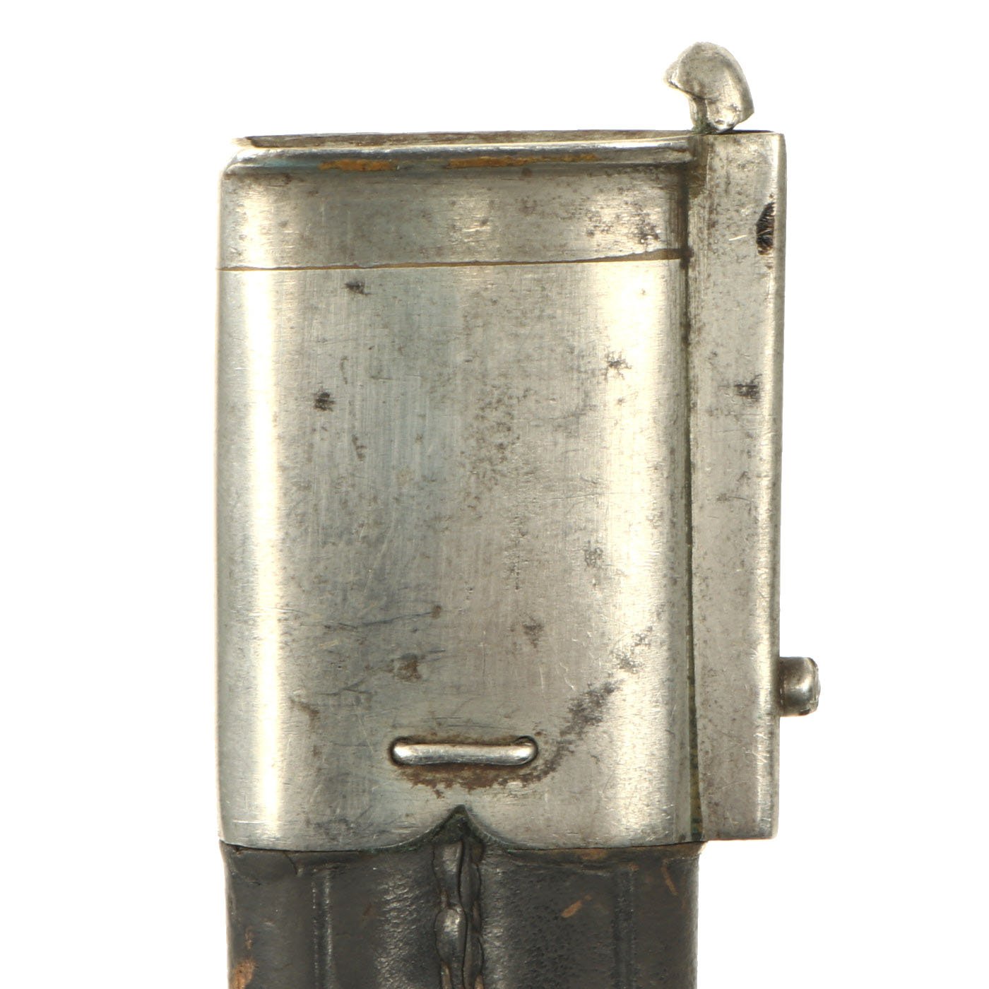 Original Item. Only One available. This is quite rare, and is a very nice example of a Danish Model 1889 Bayonet, intended for use on the Krag–Jørgensen Gevær M/1889 Rifle. This is the original Model 1889 bayonet version, with a checkered leather grip. This was later improved in 1893 with a new version having a wood grips secured by brass rivets. Many were retrofitted, so finding a bayonet with intact leather grips is quite rare.