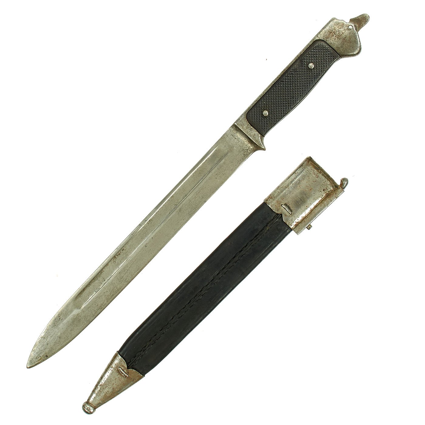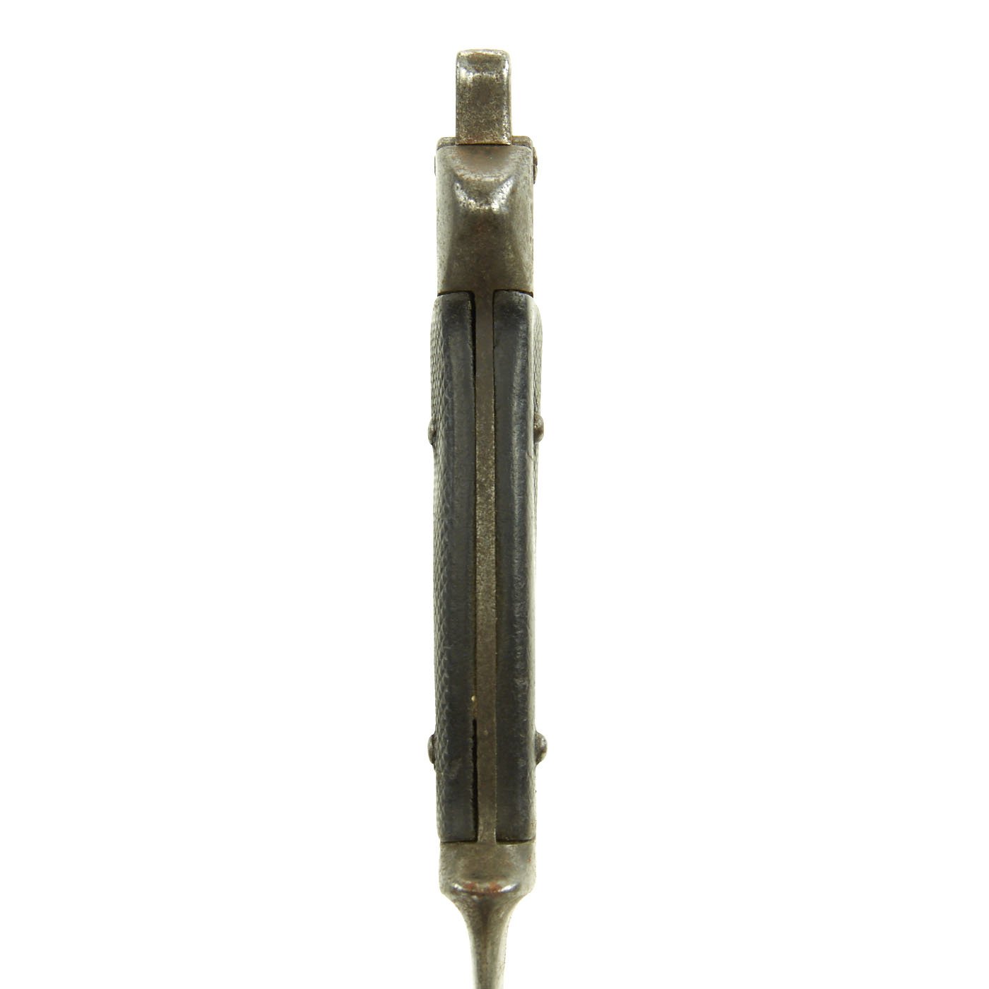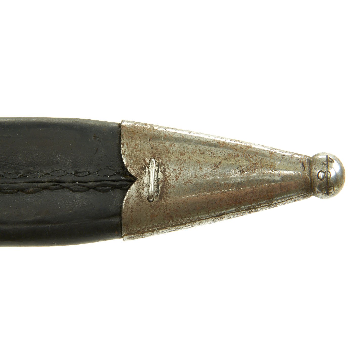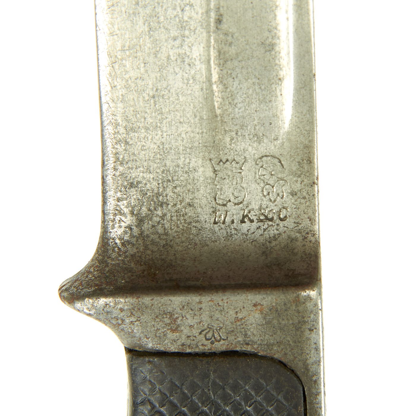 This very nice example is marked on the ricasso with the double trademark "King's Head" alongside a "Knights's Head" logo of legendary German maker Weyersberg Kirschbaum & Cie of Solingen, over the firms initials of W.K & C. This trademark is used on export blades in the late 19th and early 20th centuries, and is absolutely correct for this bayonet. For more information please see J. Anthony Carter’s work GERMAN KNIFE AND SWORD MAKERS. Later examples were made domestically so this is a very early example.