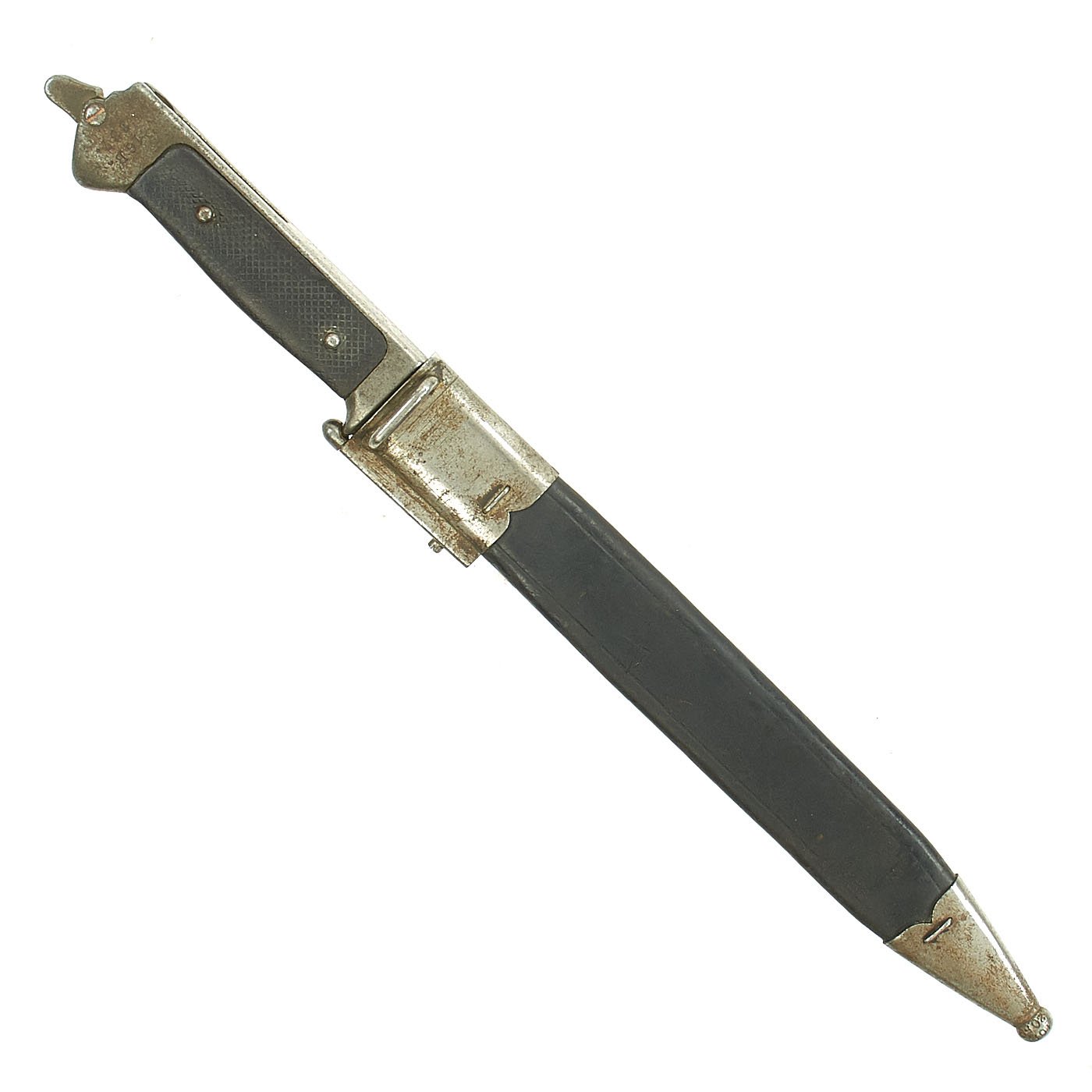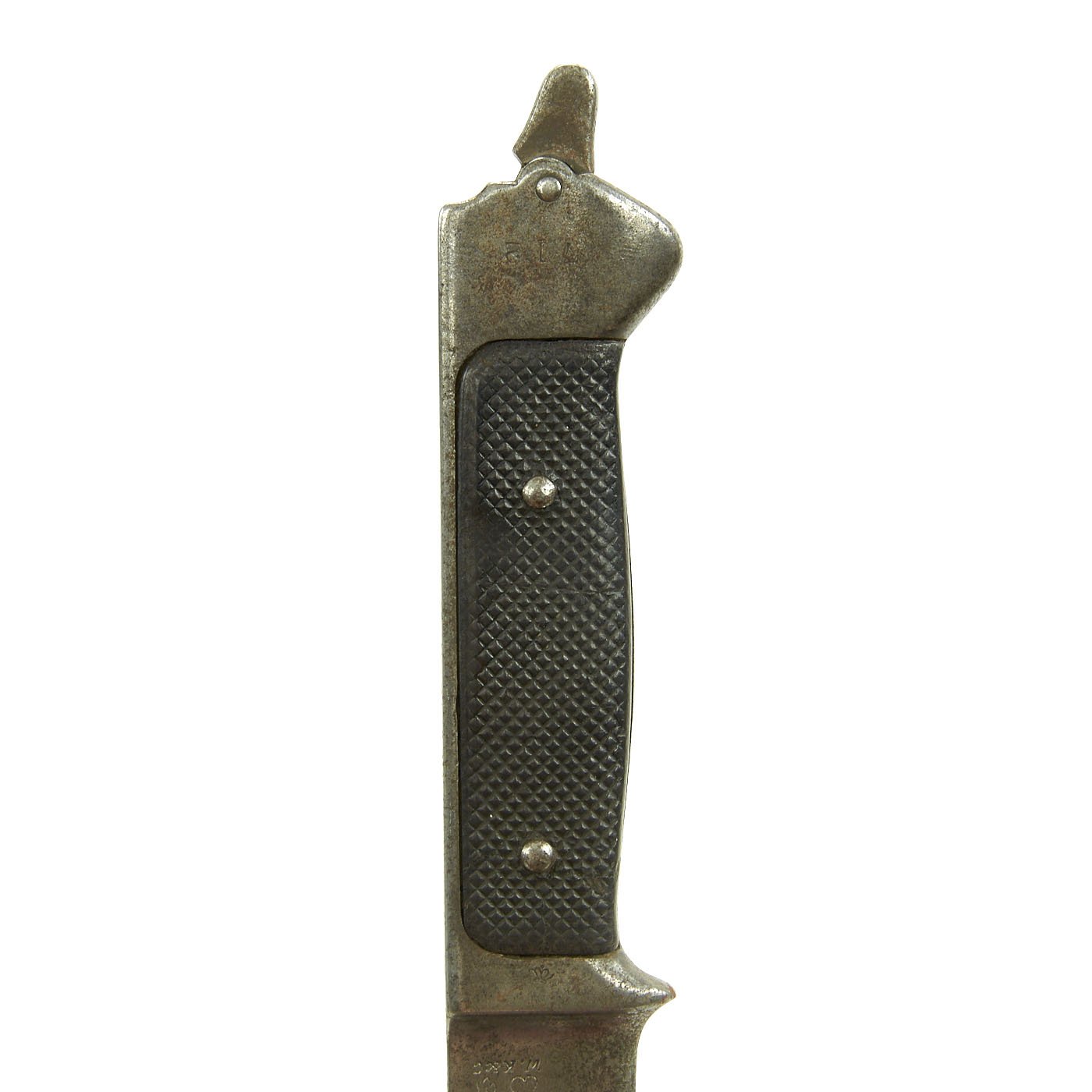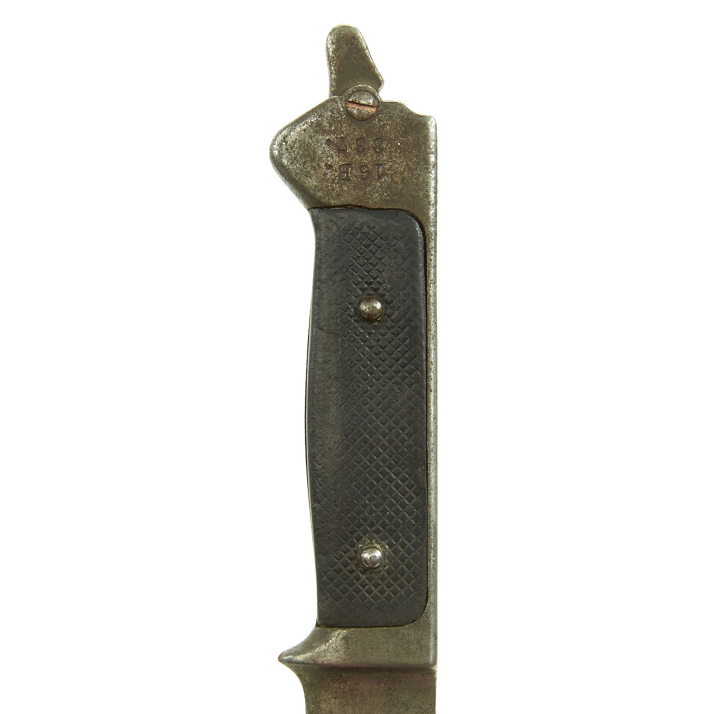The bayonet and matching scabbard are in very good used condition, without any major issues or defects. The blade is nice, with light sharpening and no major nicks or dents, and the grips are nicely broken in. The scabbard is still fitted leather, and locks correctly onto the minimal crossguard.