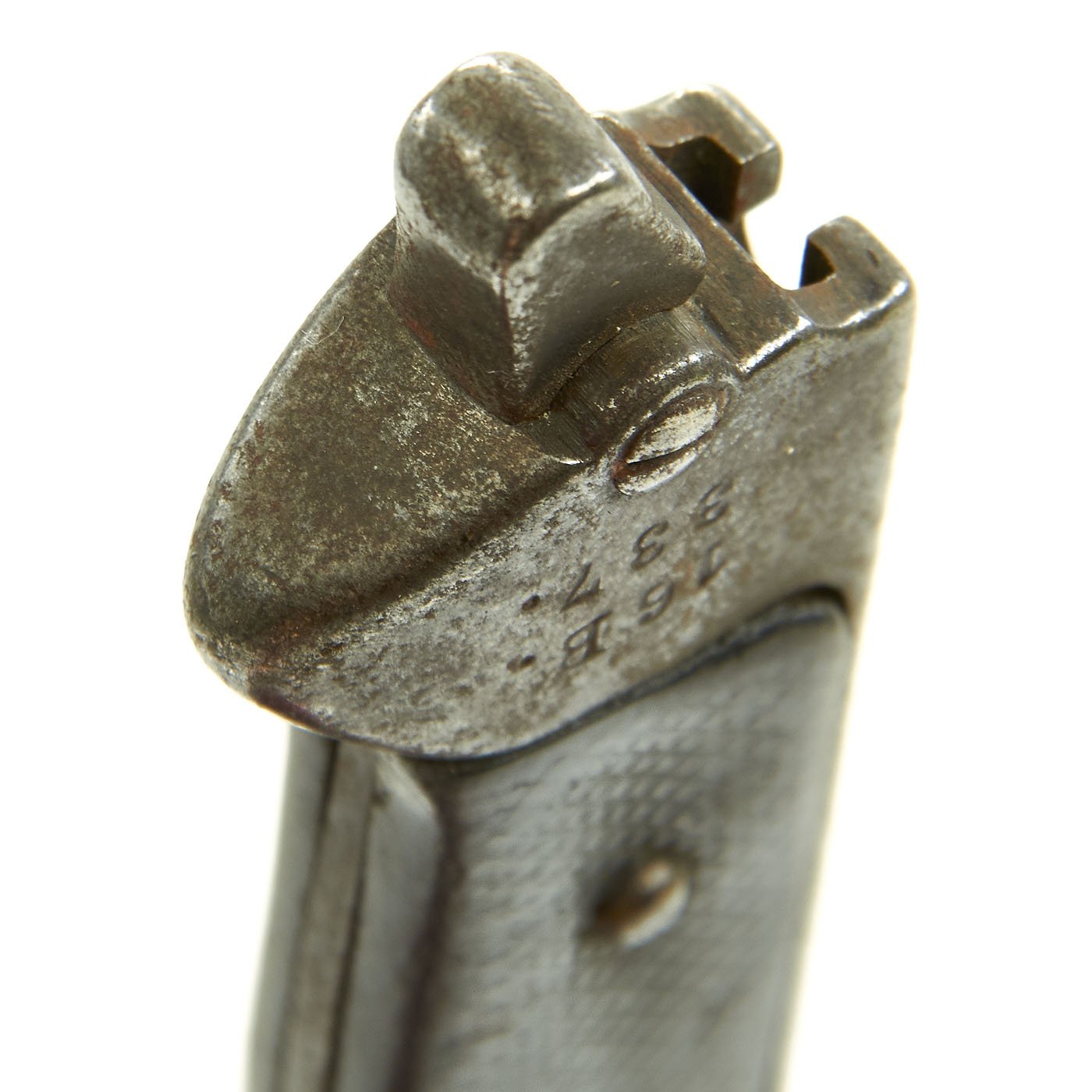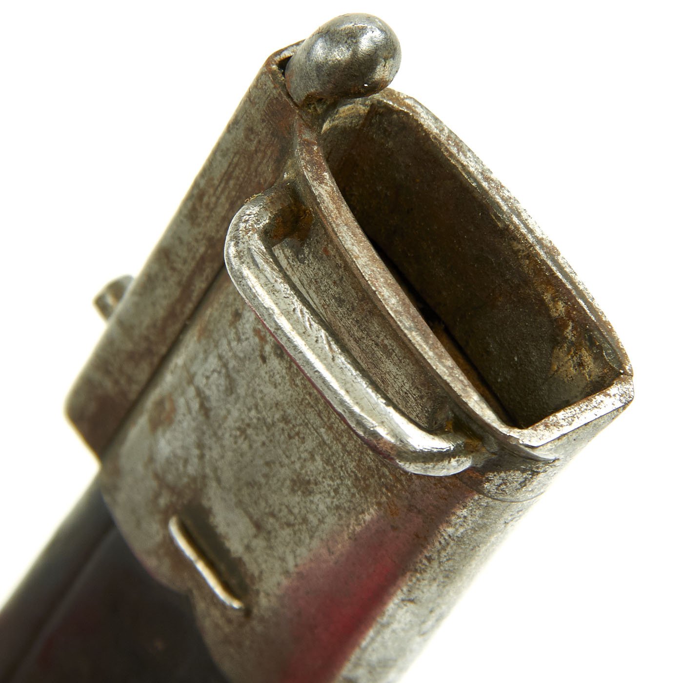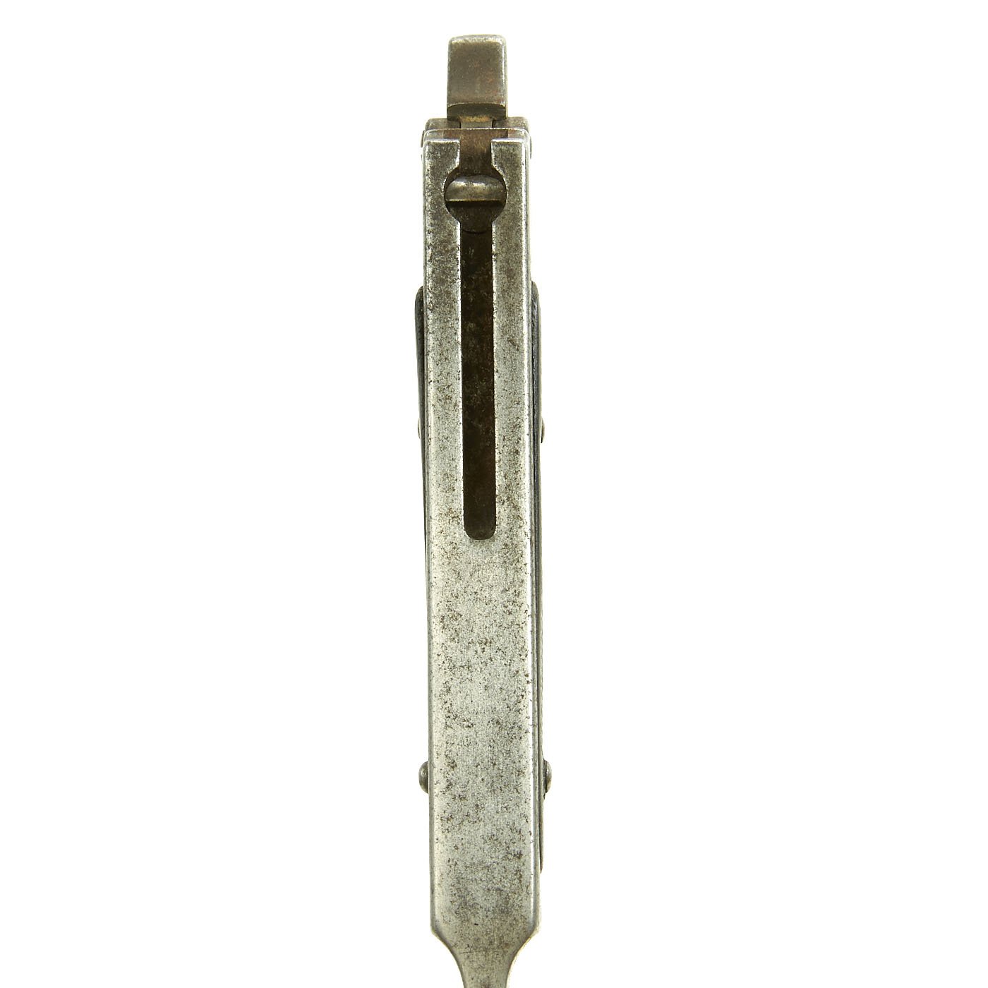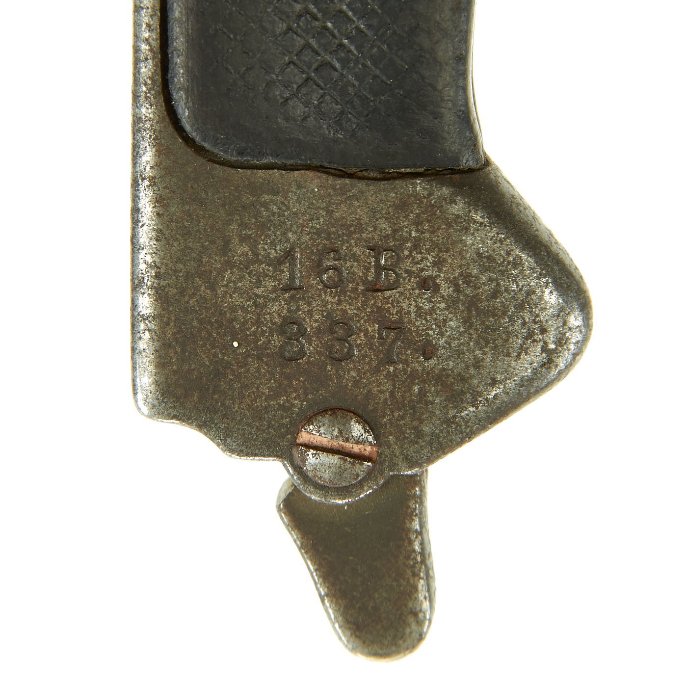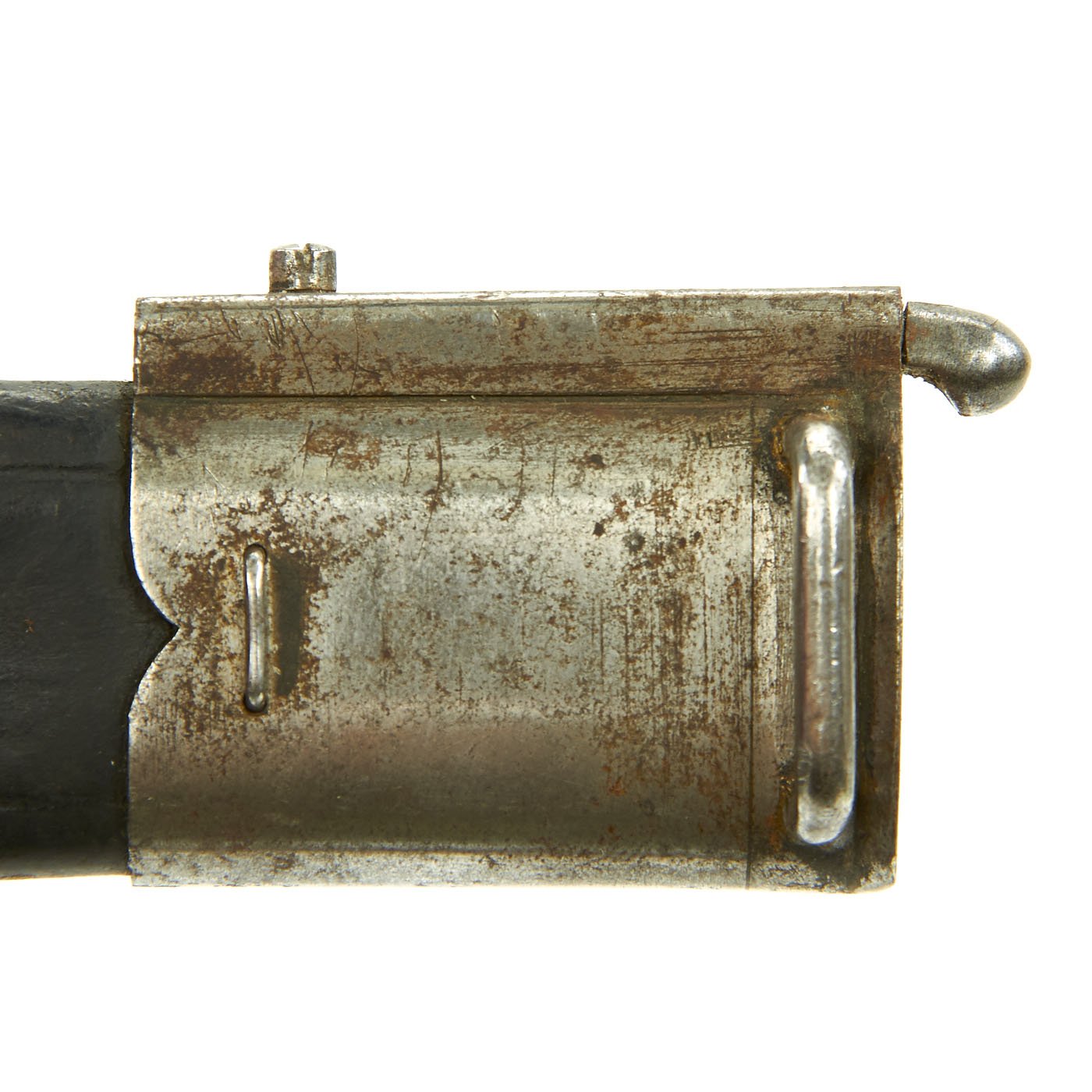 Original Item. Only One available. This is quite rare, and is a very nice example of a Danish Model 1889 Bayonet, intended for use on the Krag–Jørgensen Gevær M/1889 Rifle. This is the original Model 1889 bayonet version, with a checkered leather grip. This was later improved in 1893 with a new version having a wood grips secured by brass rivets. Many were retrofitted, so finding a bayonet with intact leather grips is quite rare.