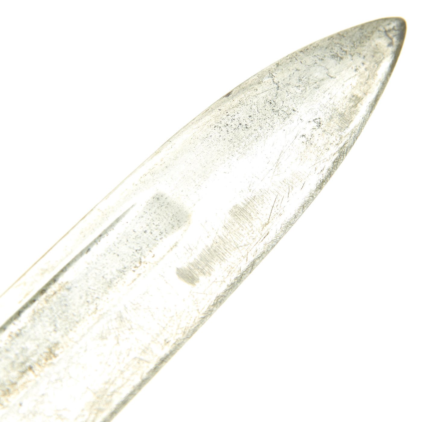The bayonet is 13 3/4 inches overall, with a 9 inch long single edged fullered blade. The design is somewhat interesting, with a a triangular lever on the pommel of the bayonet moving the bayonet lock.