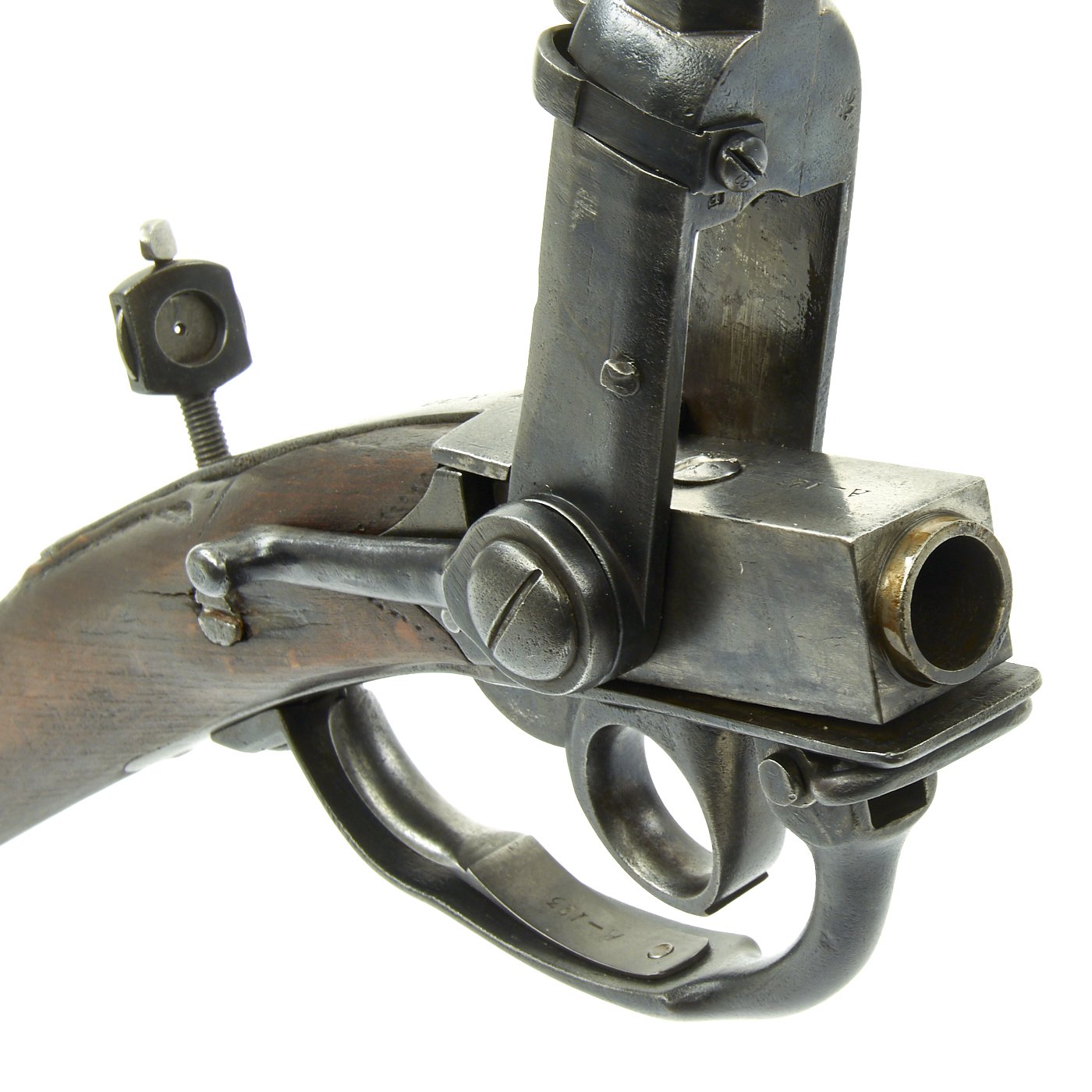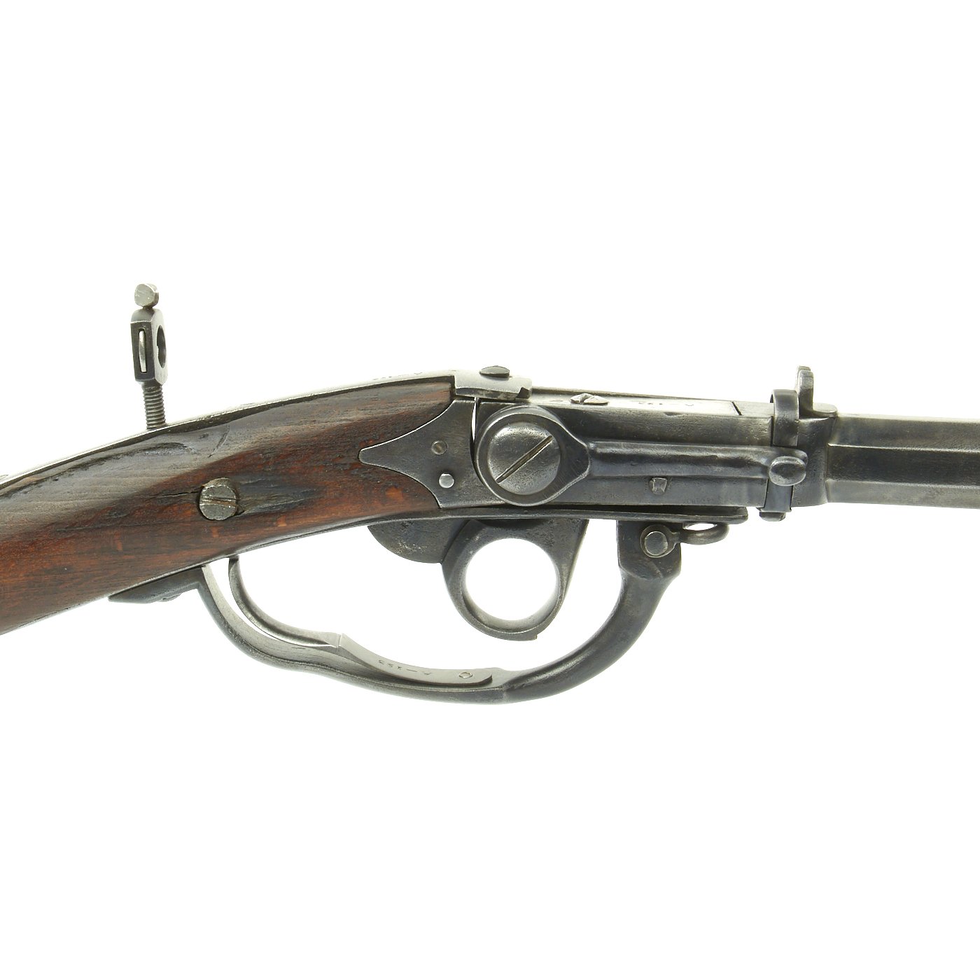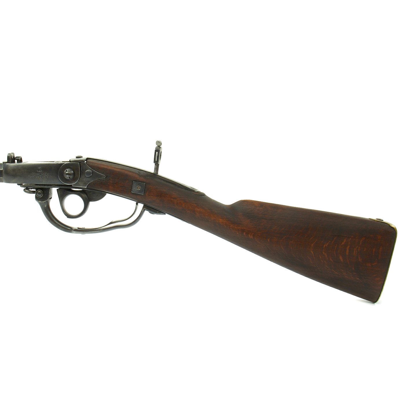 Original Item: Only One Available. These are extremely rare, adopted on July 17th 1841 for the Regiment of Hussars, this was a great leap forward in breech loading Cavalry Carbines. Designed and manufactured by N.J. Lobnitz, the chamber opens by releasing a lever on the right side, which allows the barrel to swivel upwards and the stationary breech block to become exposed for loading. The carbine has an under ring hammer, with enclosed trigger behind, which also functions as the sear to hold the hammer back.
