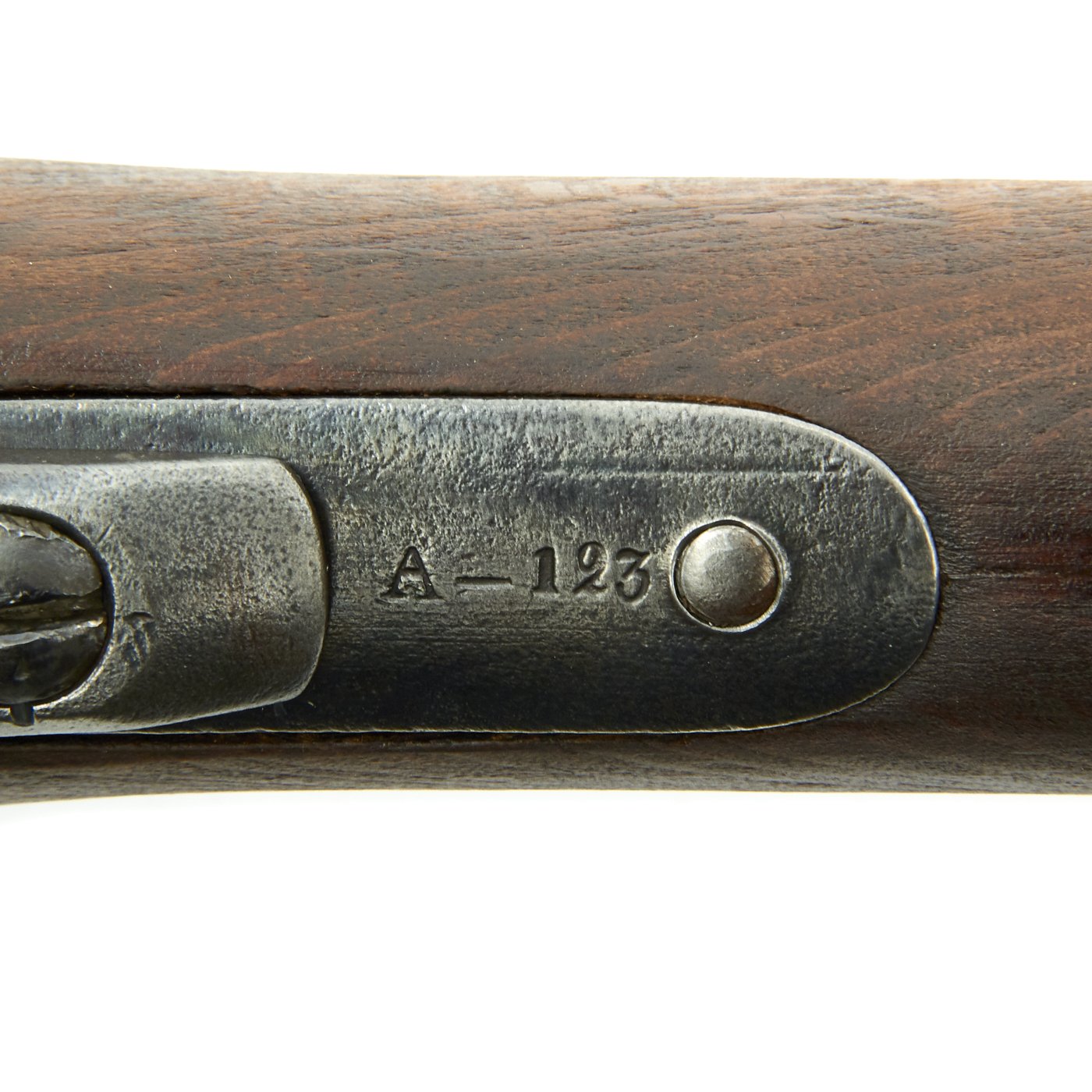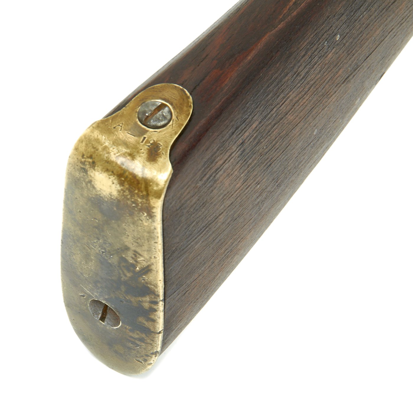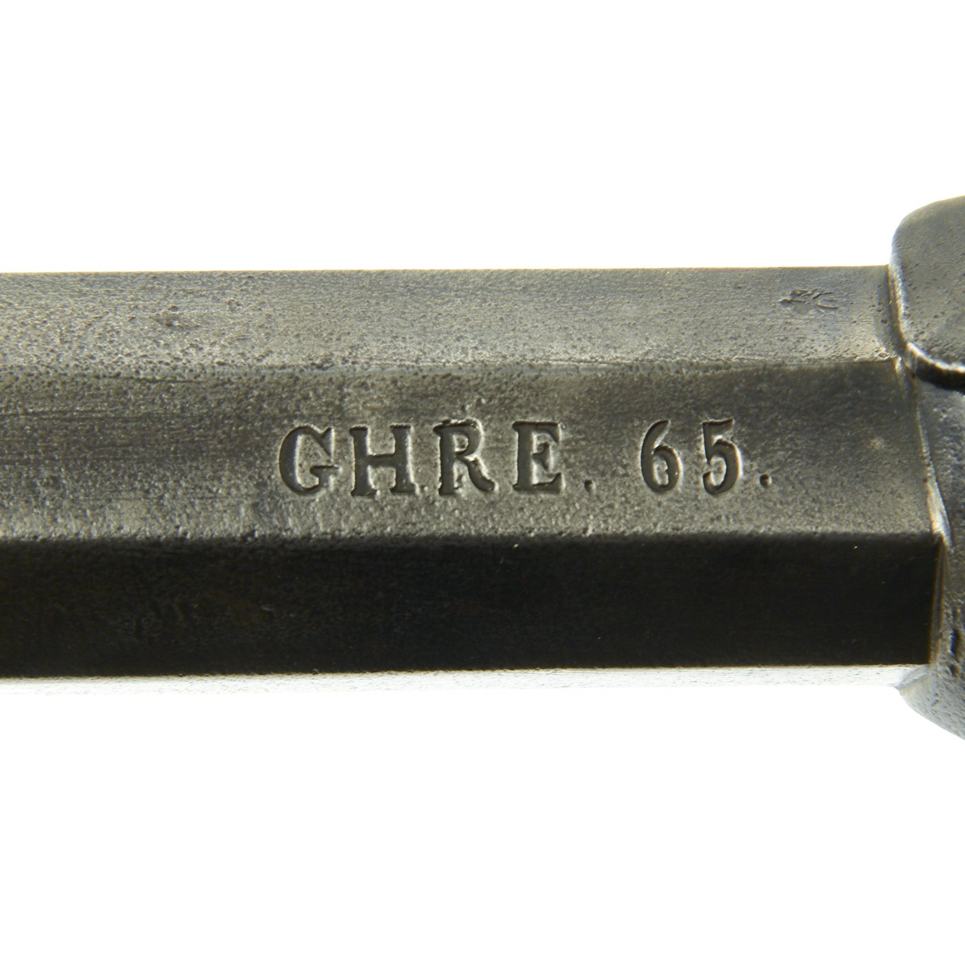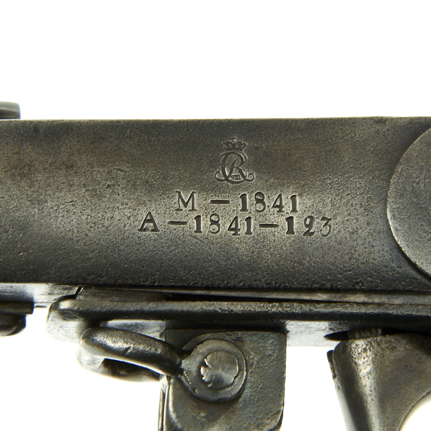 In very good condition with a blued salt and pepper finish, the left side of the receiver is marked with the Royal Cypher of Danish King Christian VIII, who reigned 1839 to 1848. Under this it is marked M - 1841 over A - 1841 - 123. Many other components of the rifle are marked with shortened serial number A - 123. The barrel is marked GHRE. 65., which would be the regimental designation.