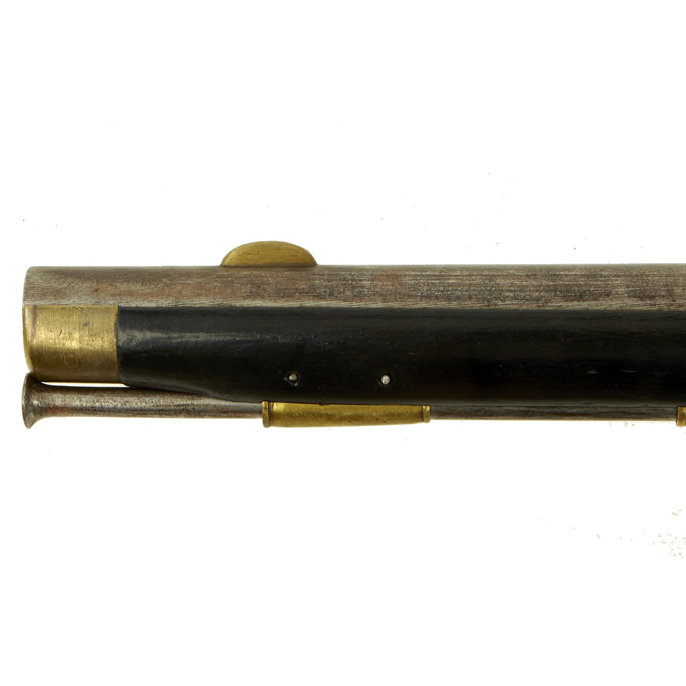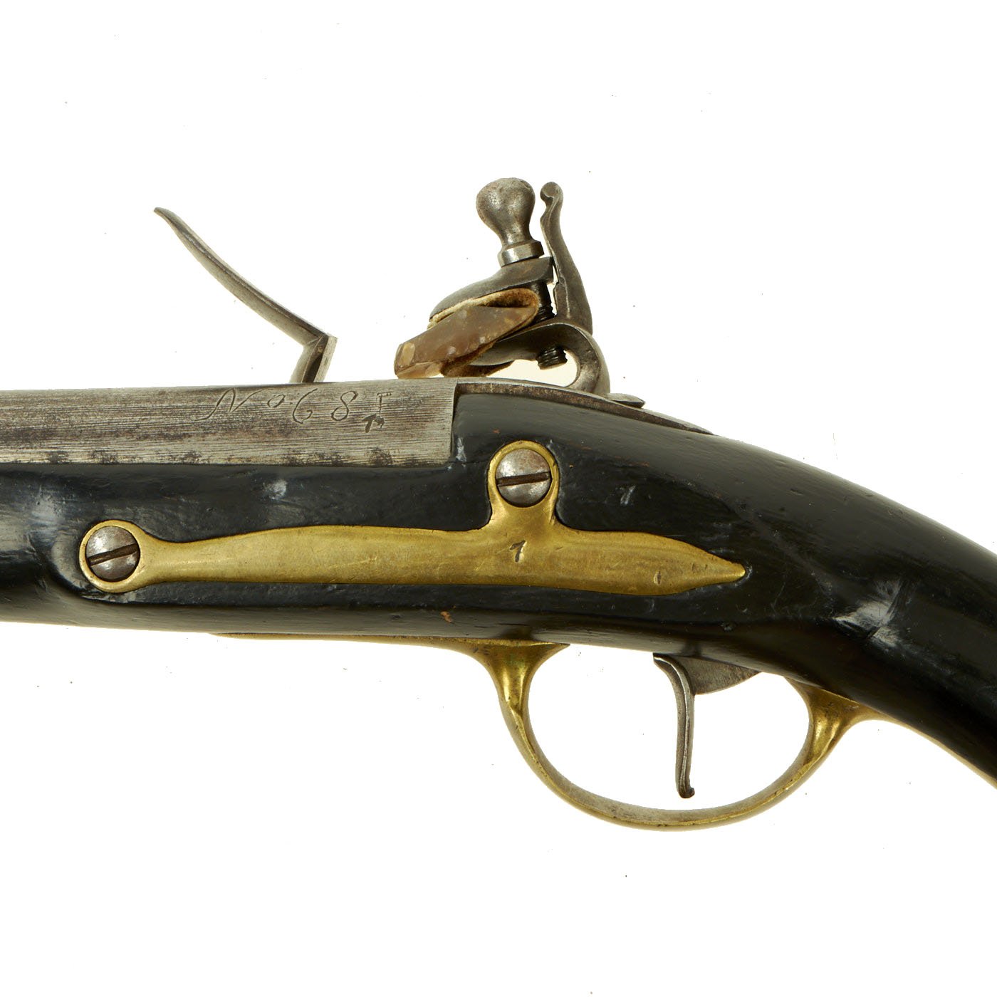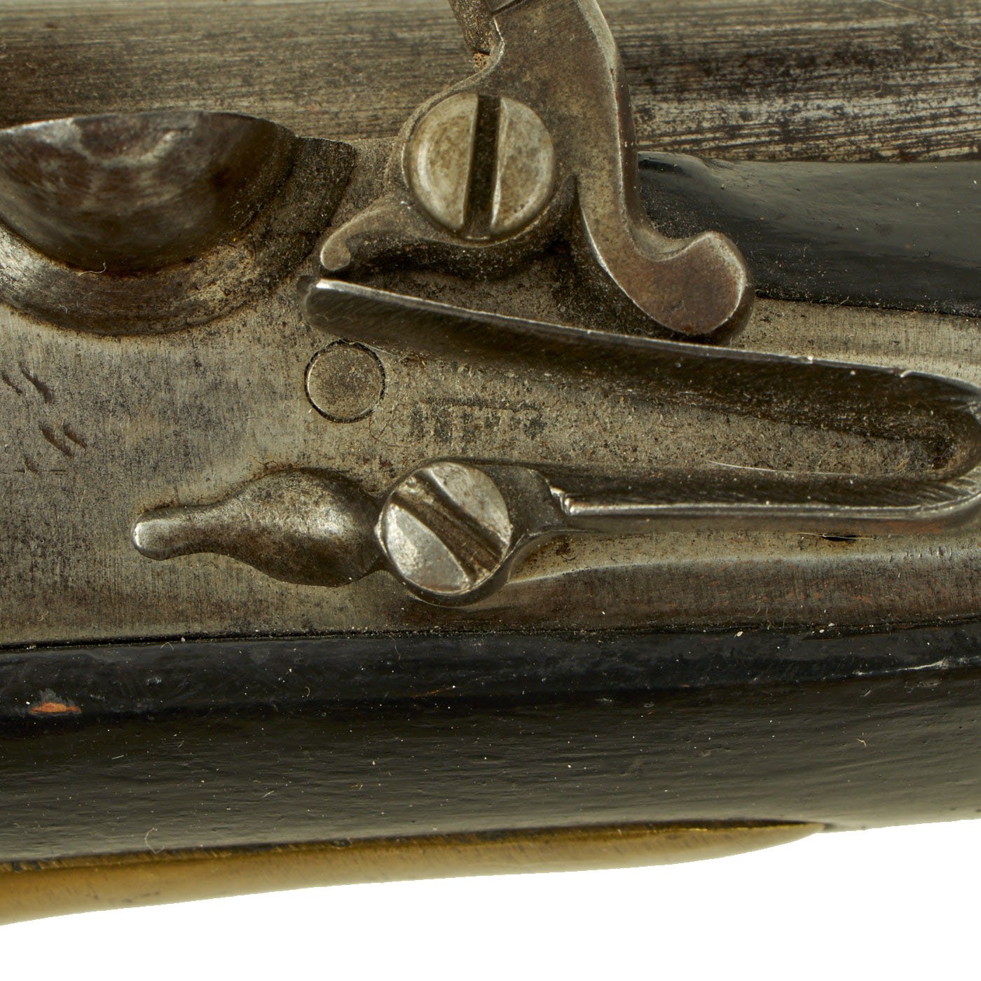 The pistol features a nice wood stock with heavy brass mounts and very substantially made. It bears number 7 stamped onto the side of the barrel and a lot of the fittings, which we assume is a matching number. There also is No.68F scratched into the left side of the barrel, most likely a regimental designation or rack number. The pistol is in overall very good condition, with a lovely patina. The lock functions correctly, holding at half cock and firing at full. However there does look to be an old brazed repair in the middle of the cock, fixed at arsenal long ago. It still has the original ramrod, with intact threads on the end.