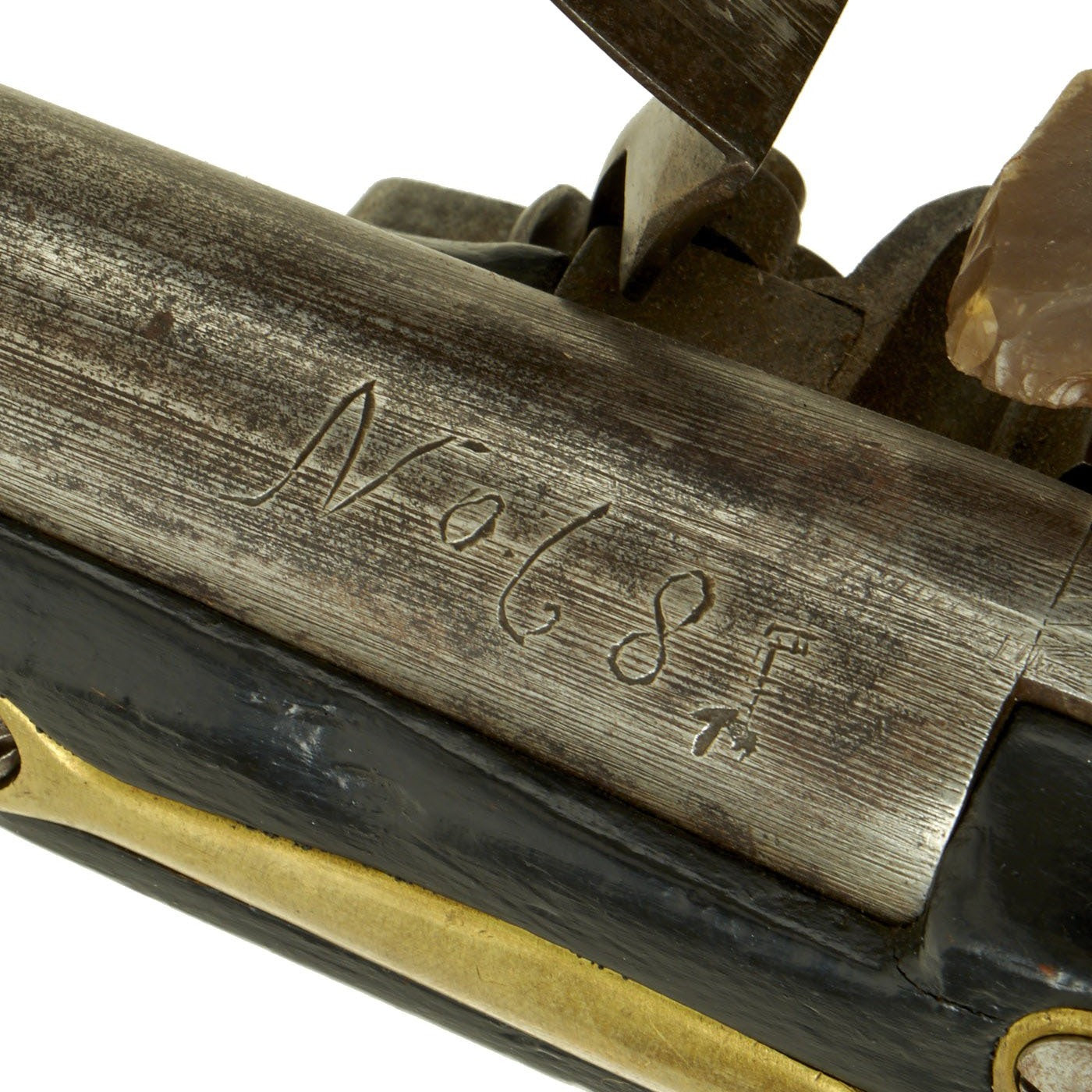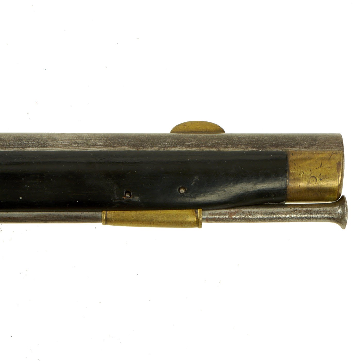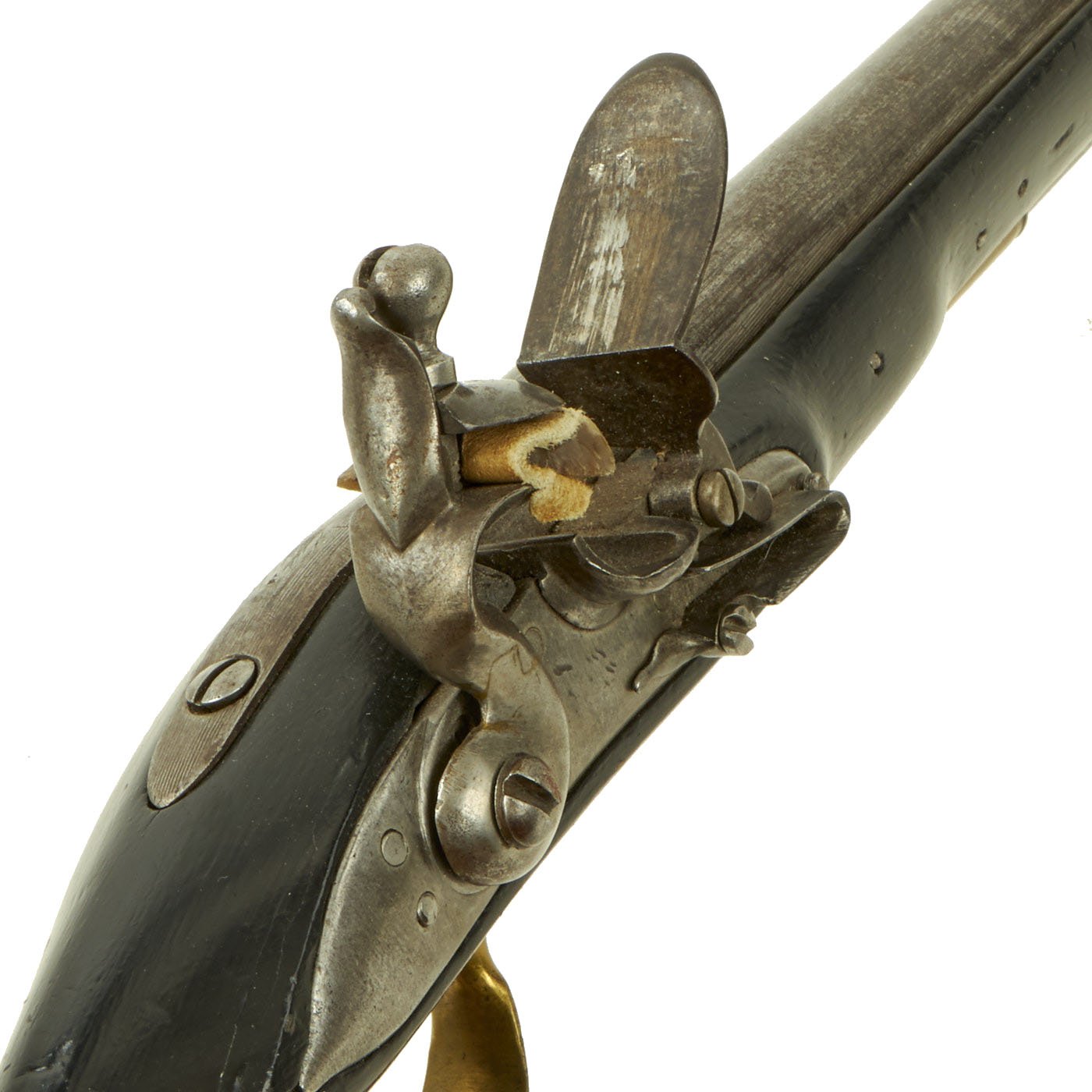 The pistol features a nice wood stock with heavy brass mounts and very substantially made. It bears number 7 stamped onto the side of the barrel and a lot of the fittings, which we assume is a matching number. There also is No.68F scratched into the left side of the barrel, most likely a regimental designation or rack number. The pistol is in overall very good condition, with a lovely patina. The lock functions correctly, holding at half cock and firing at full. However there does look to be an old brazed repair in the middle of the cock, fixed at arsenal long ago. It still has the original ramrod, with intact threads on the end.