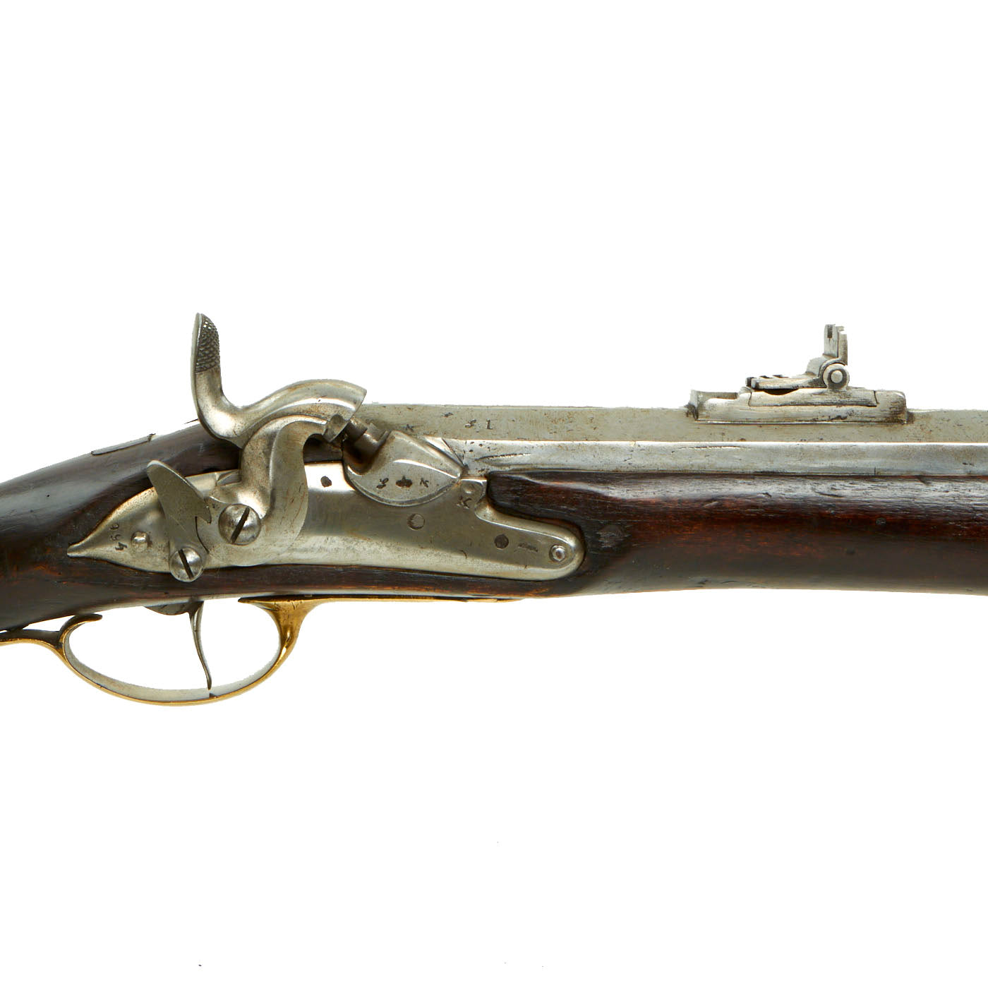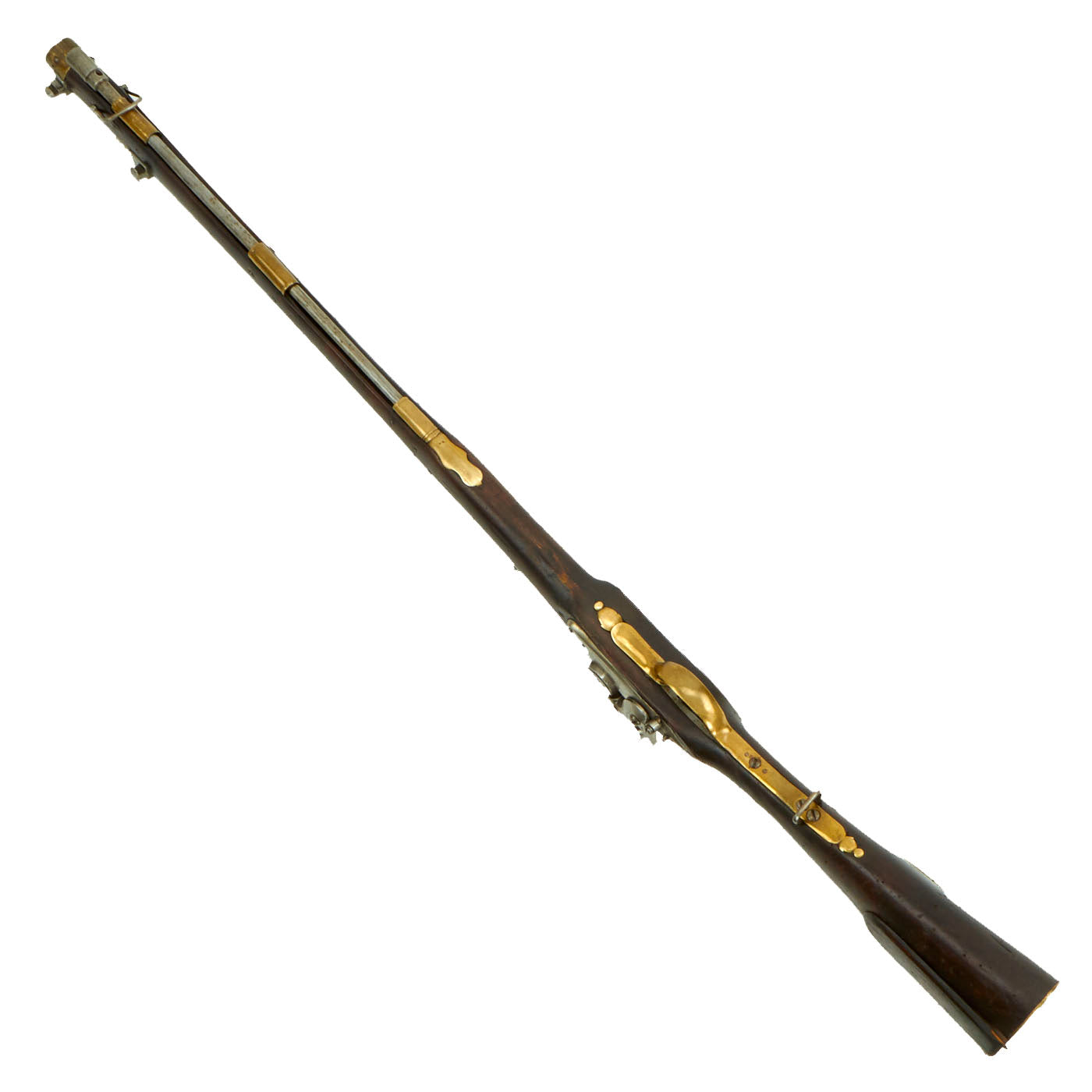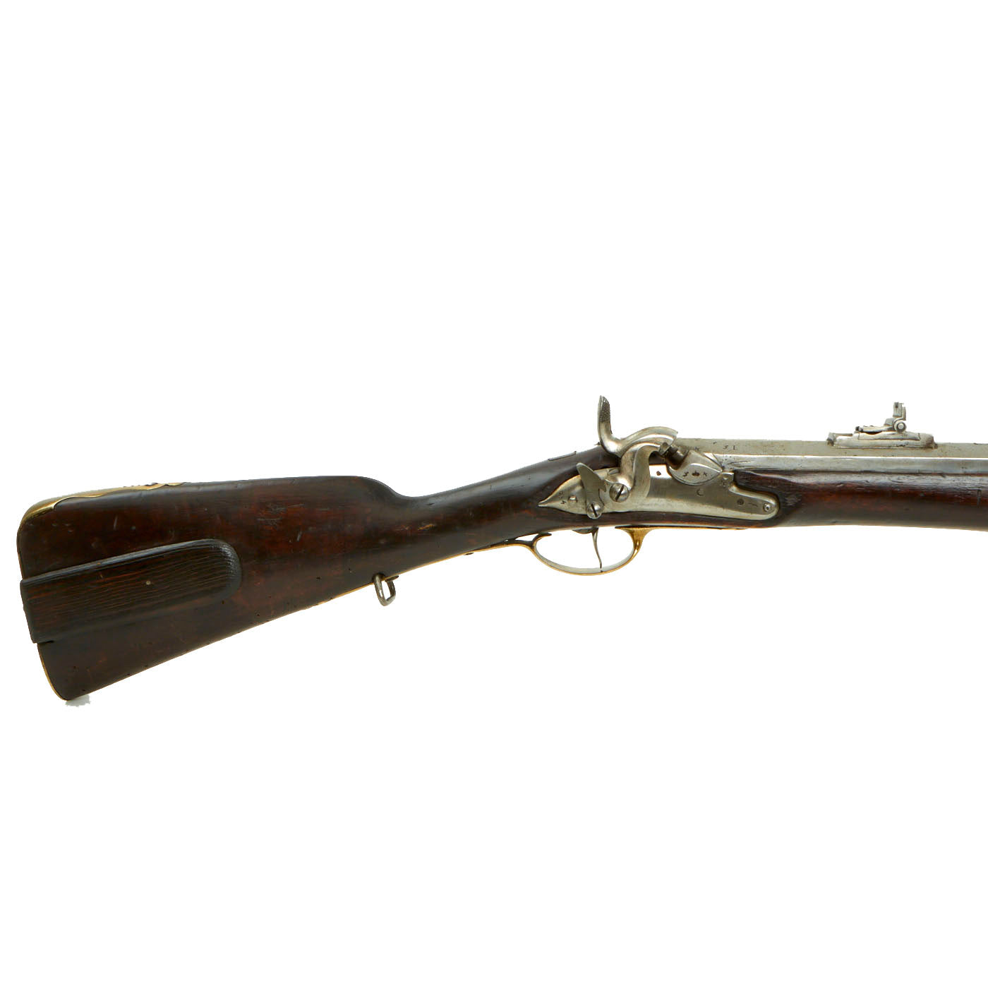 Original Item. Only One Available. This is pretty unusual, starting life as the Danish Flintlock 18mm smooth bore Jäger Musket Model of 1785/1807, fitted with an early Doglock type safety on the hammer. The lock does have a true half-cock position, which may have been added when it was later to be converted to a Percussion rifle. This conversion most likely occurred in Norway, where it was fitted with a rifled barrel of 28 inches long, complete with new sights. This features a "pillar breech", intended to push out the bottom of the bullet to engage the rifling. The overall length is 43 inches, with all brass mounts on a Beech Wood stock.