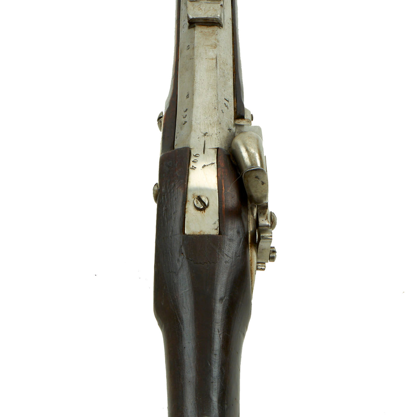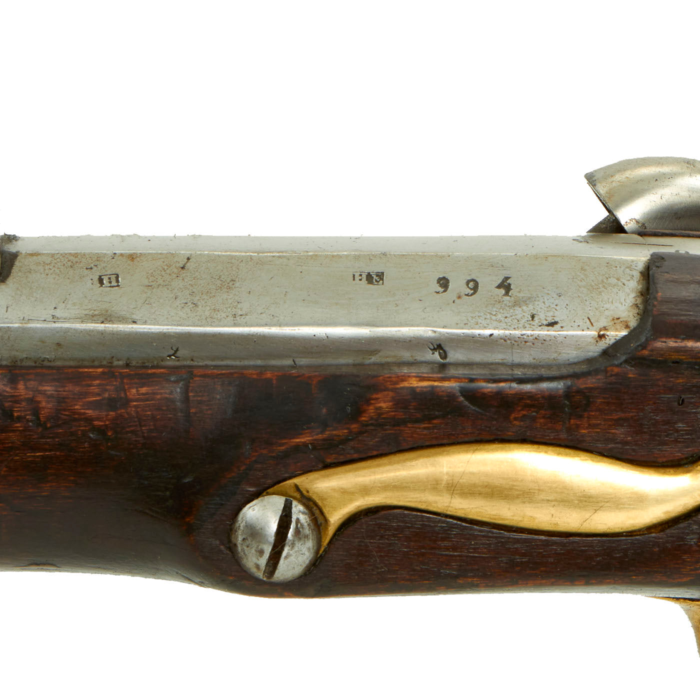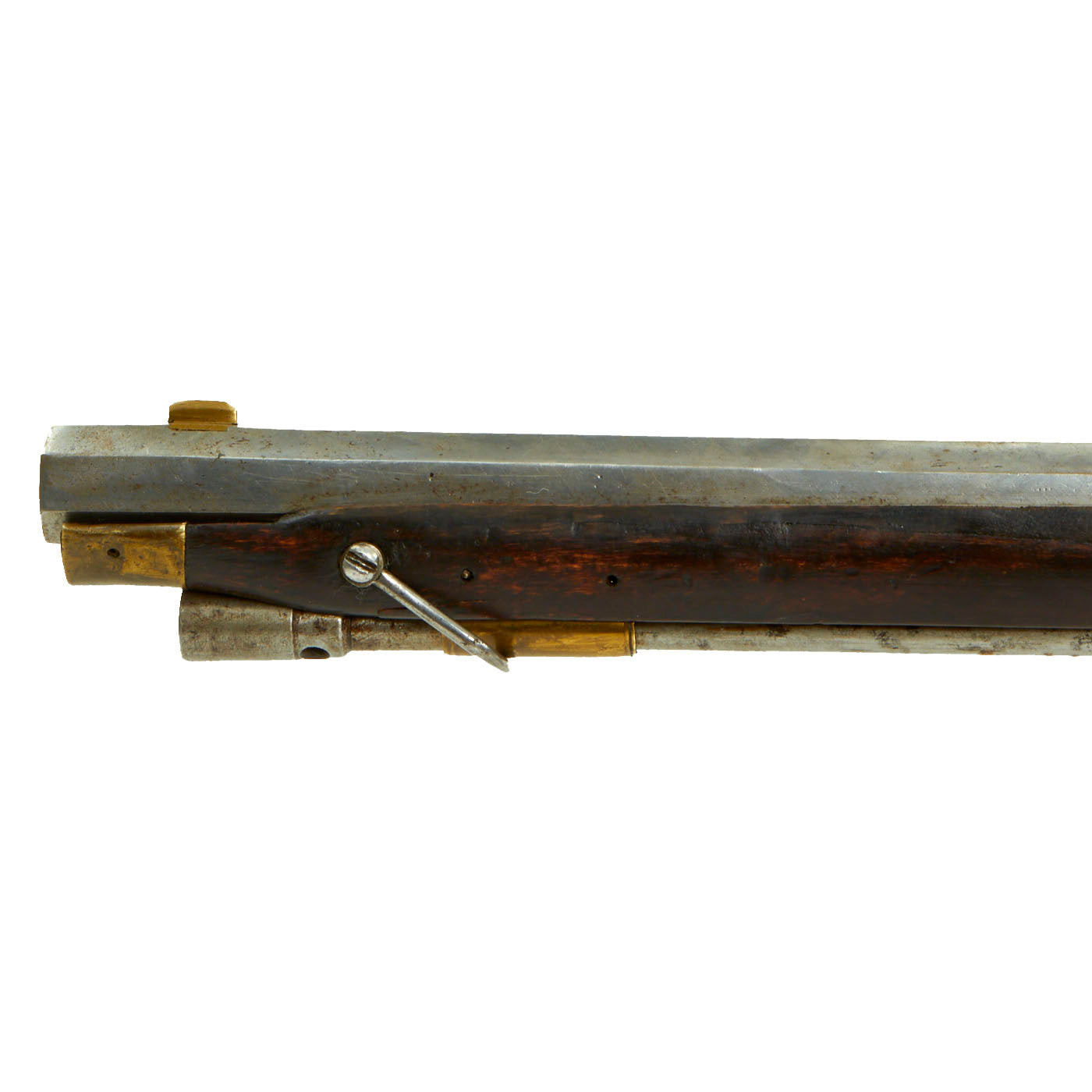 Original Item. Only One Available. This is pretty unusual, starting life as the Danish Flintlock 18mm smooth bore Jäger Musket Model of 1785/1807, fitted with an early Doglock type safety on the hammer. The lock does have a true half-cock position, which may have been added when it was later to be converted to a Percussion rifle. This conversion most likely occurred in Norway, where it was fitted with a rifled barrel of 28 inches long, complete with new sights. This features a "pillar breech", intended to push out the bottom of the bullet to engage the rifling. The overall length is 43 inches, with all brass mounts on a Beech Wood stock.