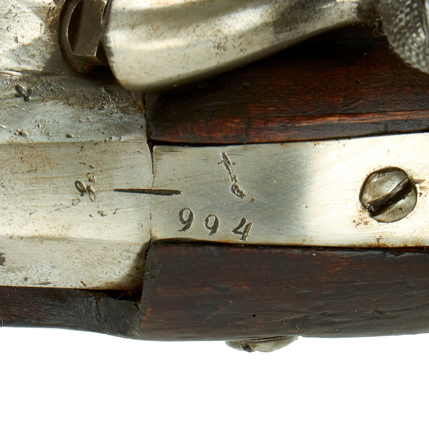 The rifle comes complete with its VERY substantial iron ram rod assembly with a conical socket in the enlarged end. This is intended to hole the bullet in place while it is rammed into the "pillar" at the breech end of the barrel. It is marked with serial number 994 on the lock plate, rear sight, barrel tang, side of the barrel, and on the butt plate tang. There are additional marks on the lock and barrel, such as a CROWN / K, for Kongsberg Våpenfabrikk (Weapons Factory) in Norway, where it was converted. The left side of the barrel shows faded regimental markings from before the conversion.