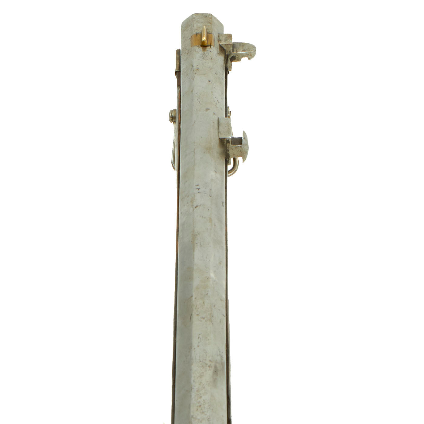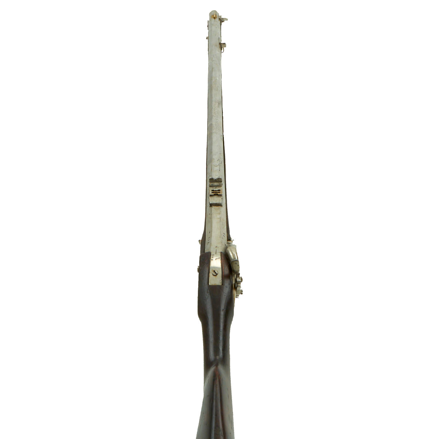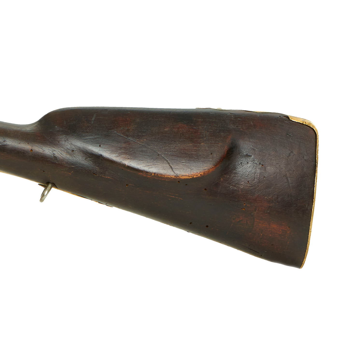 Condition of the Rifle is very good, with the metalwork polished bright steel as originally issued. The wood stock is in good condition, though it does show some past wood worm damage on the butt stock, as well as some repairs near the lock plate. The rear sight still works great, and the cleaning rod is also in good shape. The patch box in the butt stock has a working wood cover, and the right side of the barrel is fitted with mounting hardware for what looks to be a very interesting bayonet.
