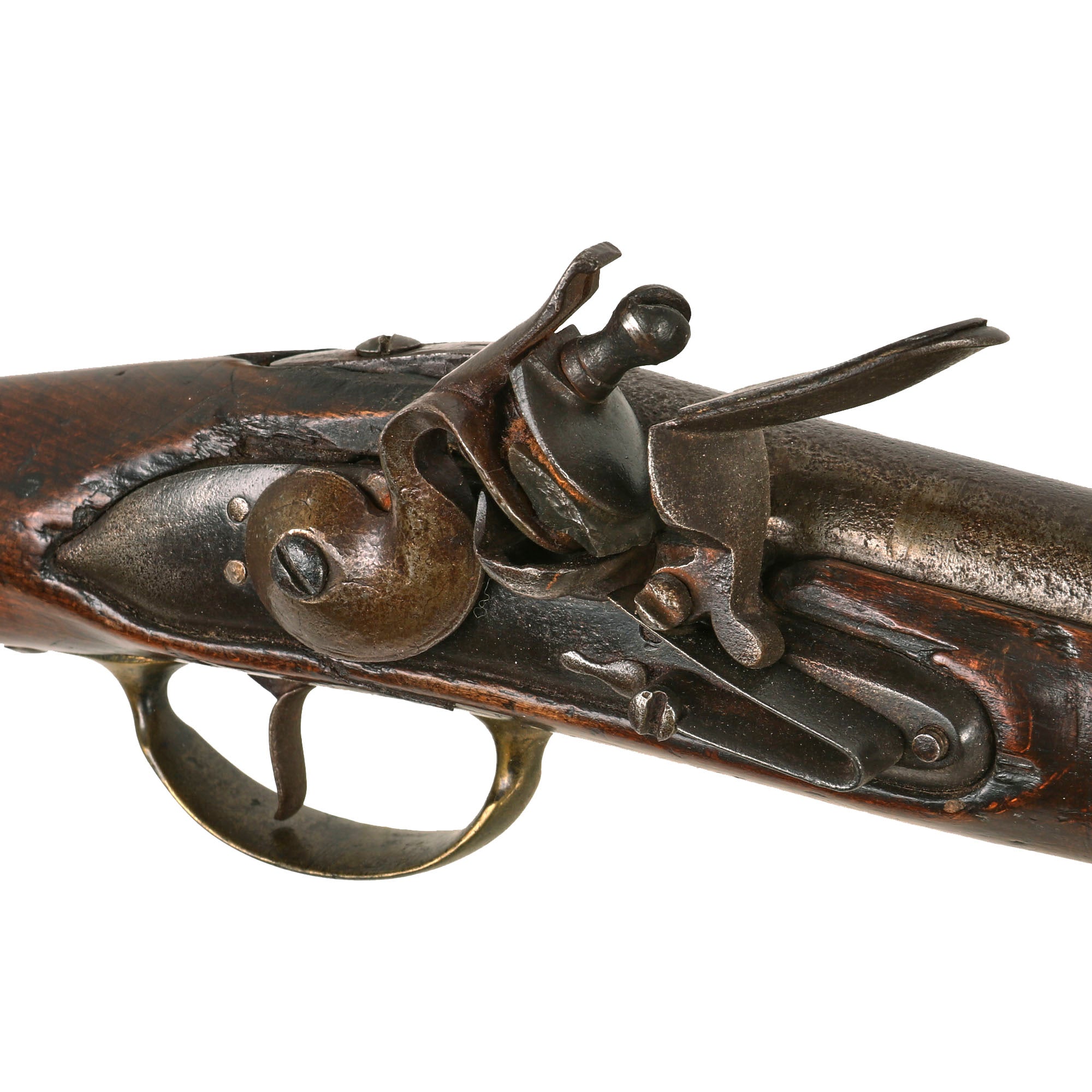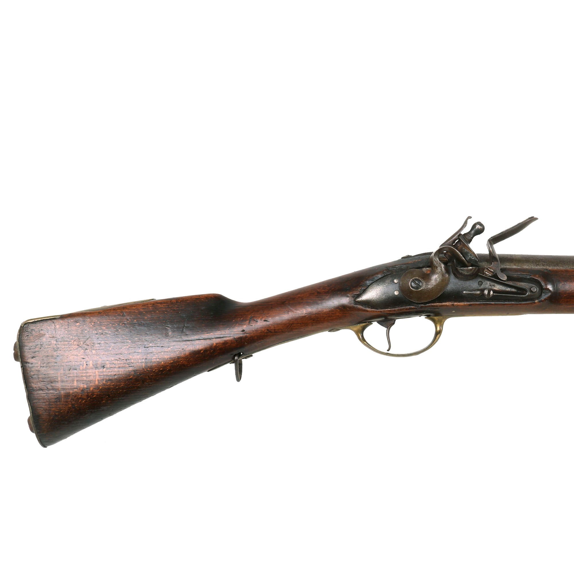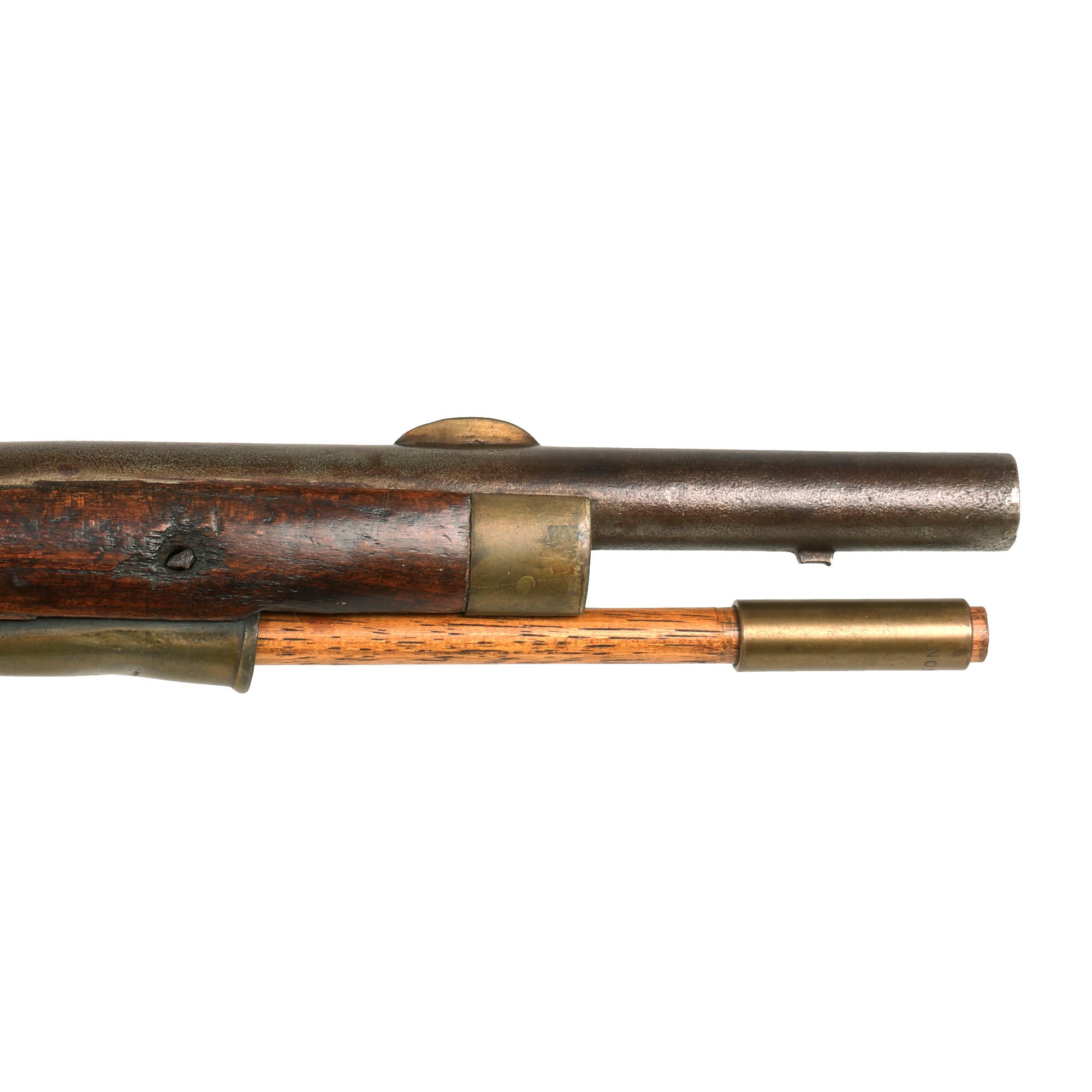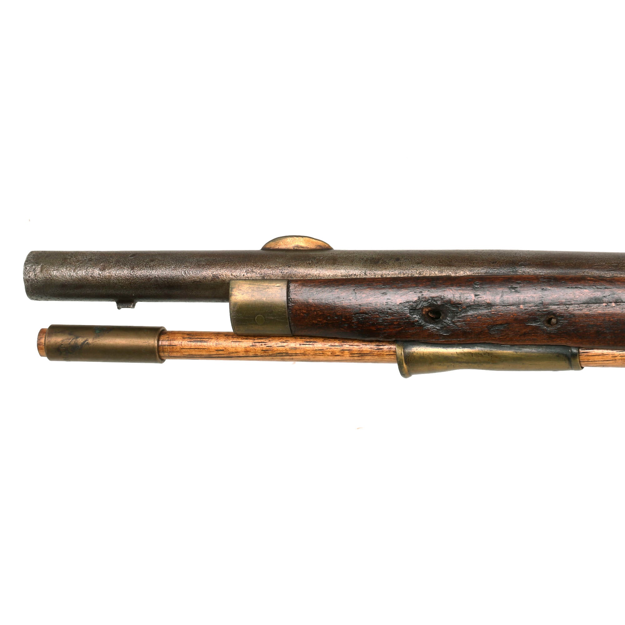 As most we see, there are very few markings on the musket, with a few small proof marks on the lock plate, which are worn. The left side of the barrel looks to have a regimental marking, which looks to read B. R. 18 N. 84., which we unfortunately have not been able to identify. There is also something scrawled on the left side of the butt stock, but we cannot make out what it says. Overall condition is very good, with a lovely peppered patina on the lock and barrel, showing some past oxidation and subsequent cleaning. The brass hardware has a lovely mellow patina, as does the large brass foresight, with no major wear. We checked the lock action, and it is functional, however it does not hold correctly at half cock due to wear.