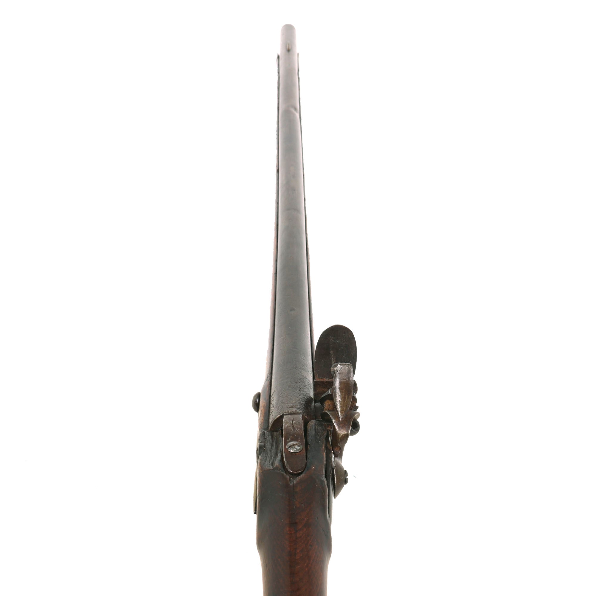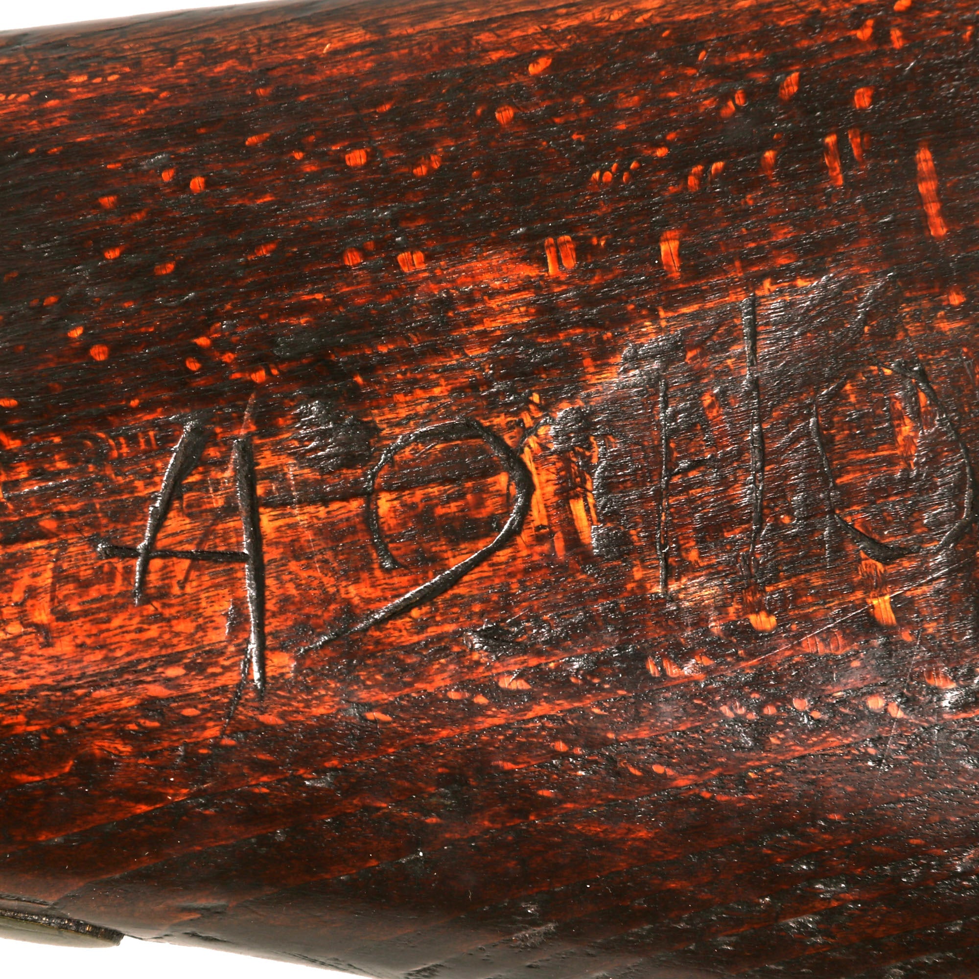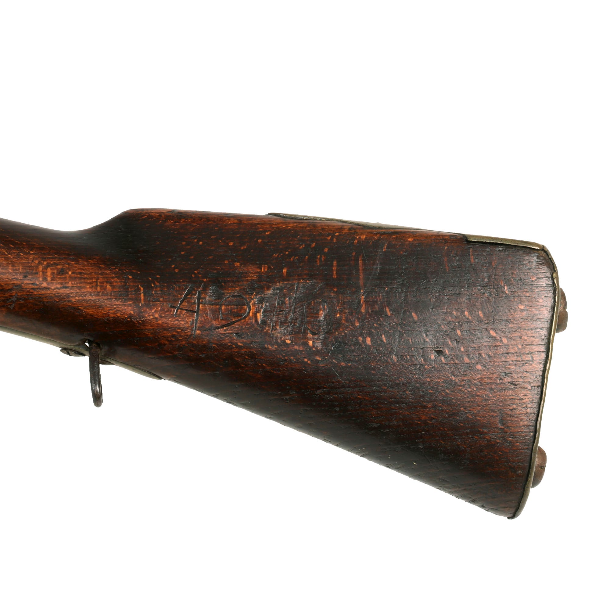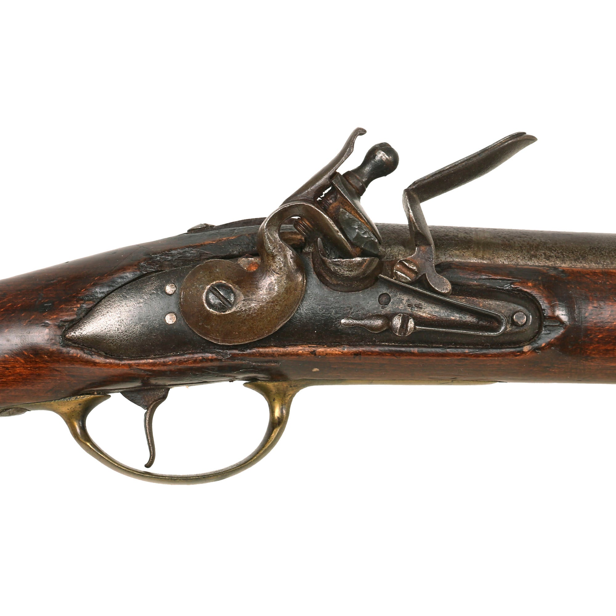 As most we see, there are very few markings on the musket, with a few small proof marks on the lock plate, which are worn. The left side of the barrel looks to have a regimental marking, which looks to read B. R. 18 N. 84., which we unfortunately have not been able to identify. There is also something scrawled on the left side of the butt stock, but we cannot make out what it says. Overall condition is very good, with a lovely peppered patina on the lock and barrel, showing some past oxidation and subsequent cleaning. The brass hardware has a lovely mellow patina, as does the large brass foresight, with no major wear. We checked the lock action, and it is functional, however it does not hold correctly at half cock due to wear.