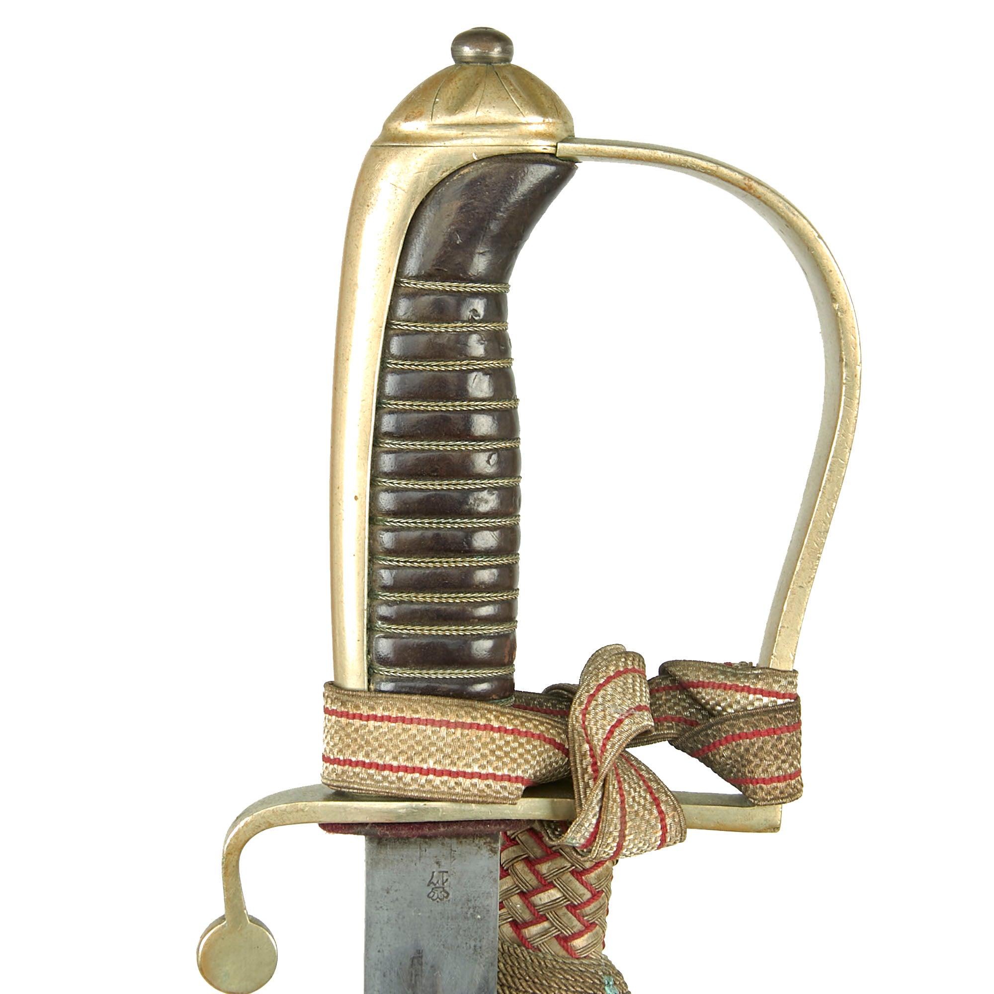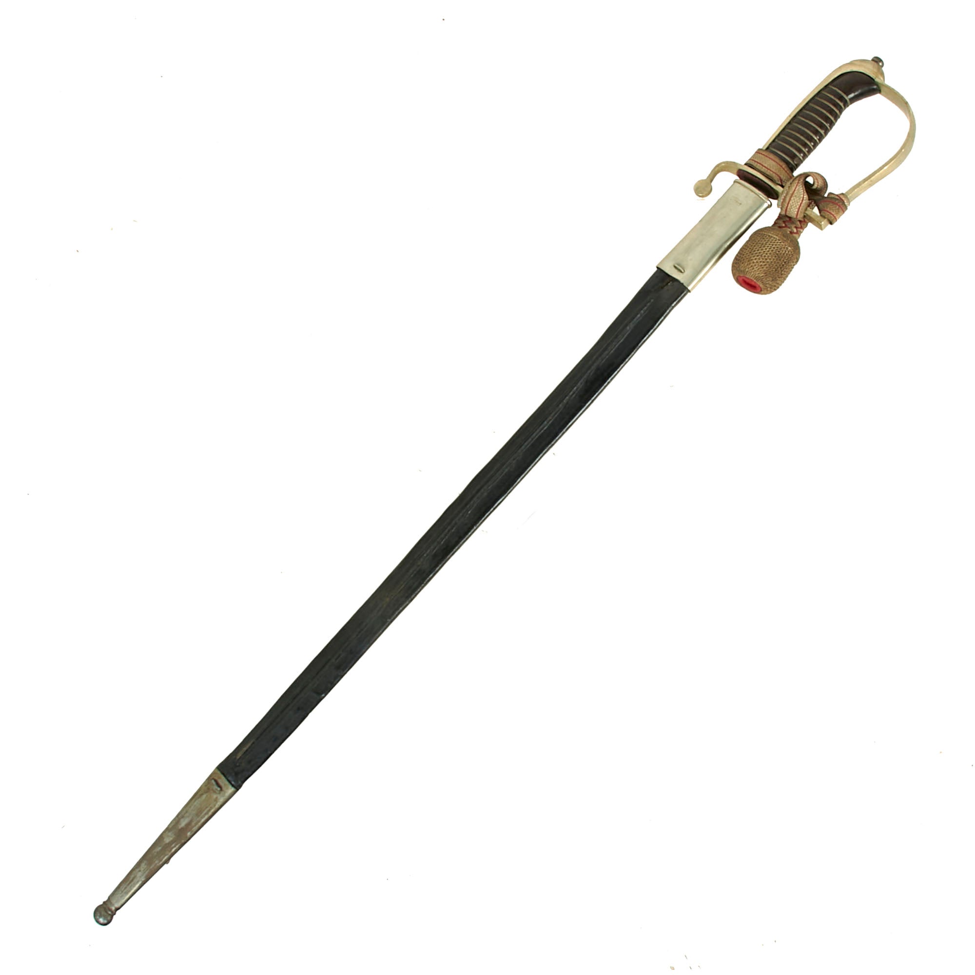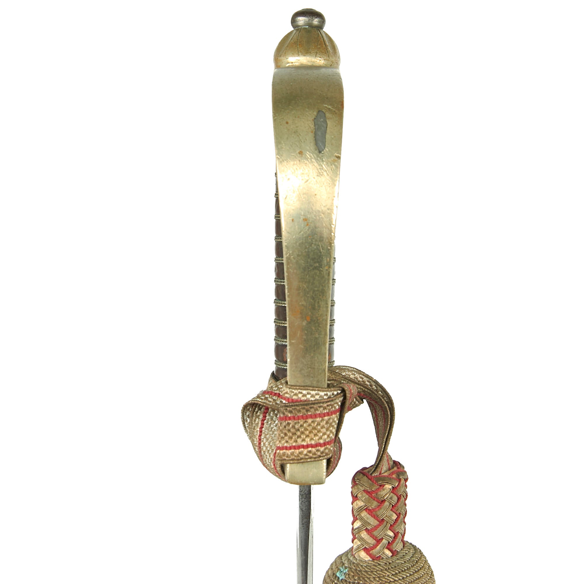 The hilt has a well-retained wire-wrapped leather grip with the original white and red sword knot still attached to the hilt.