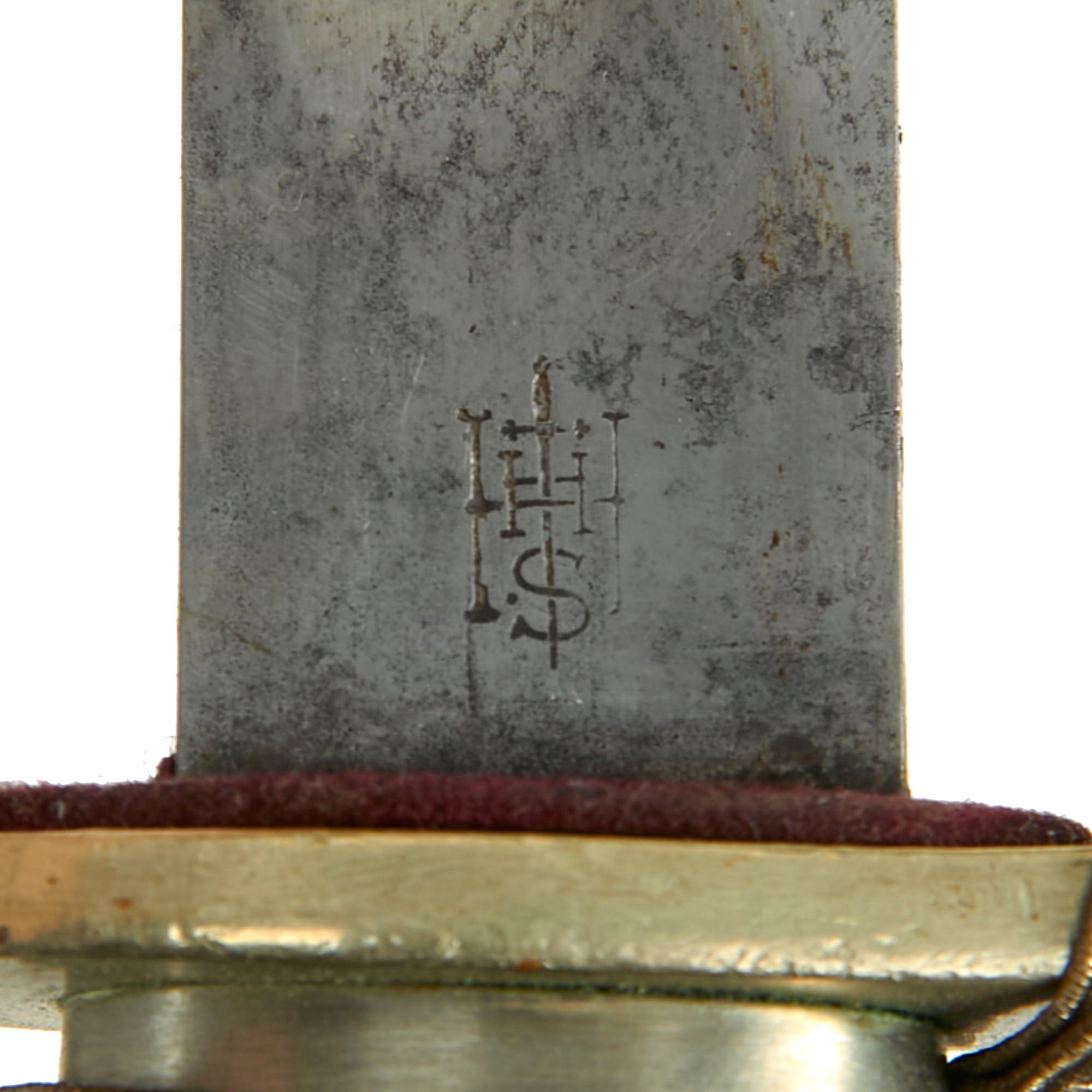 The blade is marked on the ricasso with the HS Sword trademark of E. & F. Hörster & Co Gmbh, is a well-known maker from Solingen, the famous "City of Blades" in Western Germany. Originally founded in 1850 as "Friedrich Hörster" in 1850, the company was renamed to E. & F. Hörster in 1870 at the behest of Friedrich Emil & Fritz Hörster. The firm lasted long after WWII, finally being declared insolvent in 1996. For more information please see GERMAN KNIFE AND SWORD MAKERS by J. Anthony Carter. The other side of the ricasso is marked with a Danish crown over 17, for inspection in 1917.