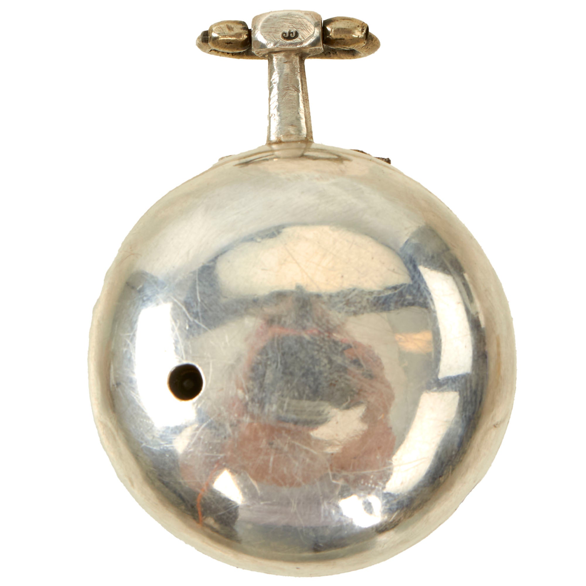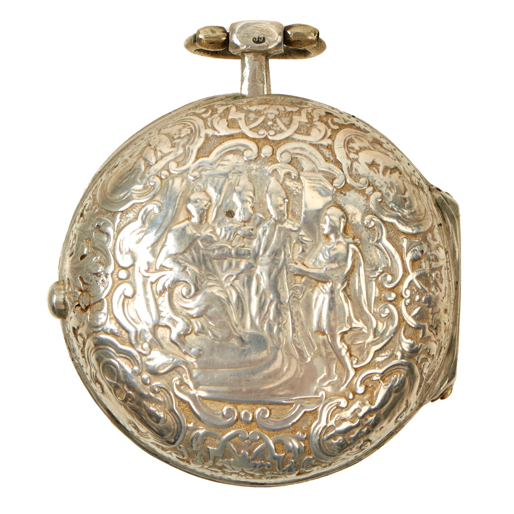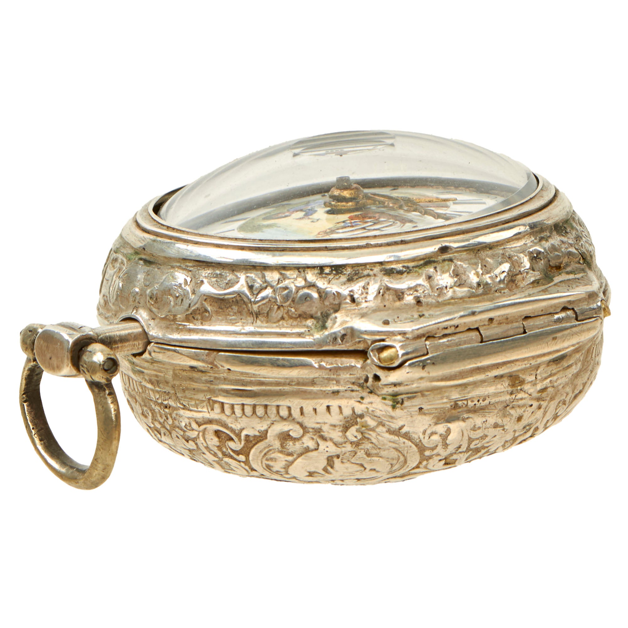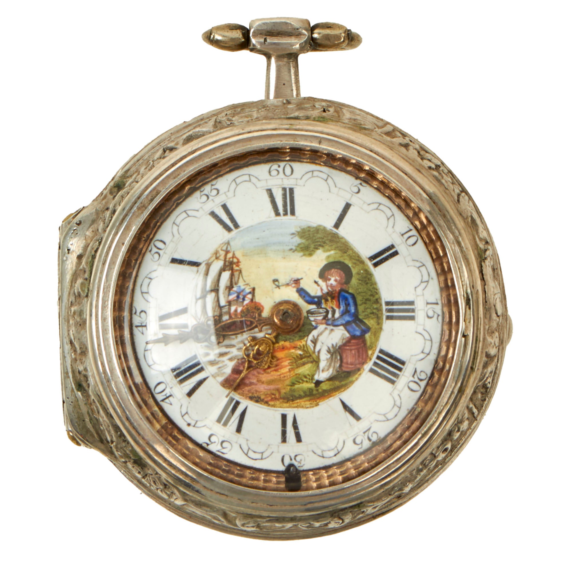 Original Item. One-of-a-Kind. This is a tremendous piece of horology, a Dutch-crafted verge escapement polychrome pocket watch in a silver repousse case, 57mm, decorated with a classical scene to the back, and foliage to the bezel and sides. This piece was designed for a Naval Officer, as is evident by the scene painted on the face. This piece is signed by Gerrit Rensman of Zwol, a well-known Dutch watchmaker of the 18th Century. The Verge escapement dates to the 13th Century, and the first Verge Fusee pocket watch was first introduced in the 17th Century, quickly becoming a symbol of the rich & wealthy, being used up until the 19th Century. Inspired by the winches and counter balances of the rigging of sailing ships, this method was used to refine the timekeeping of the movement by regulating the speed at which the mainspring unwinds. It is only proper then that this piece be utilized by a Naval Officer.