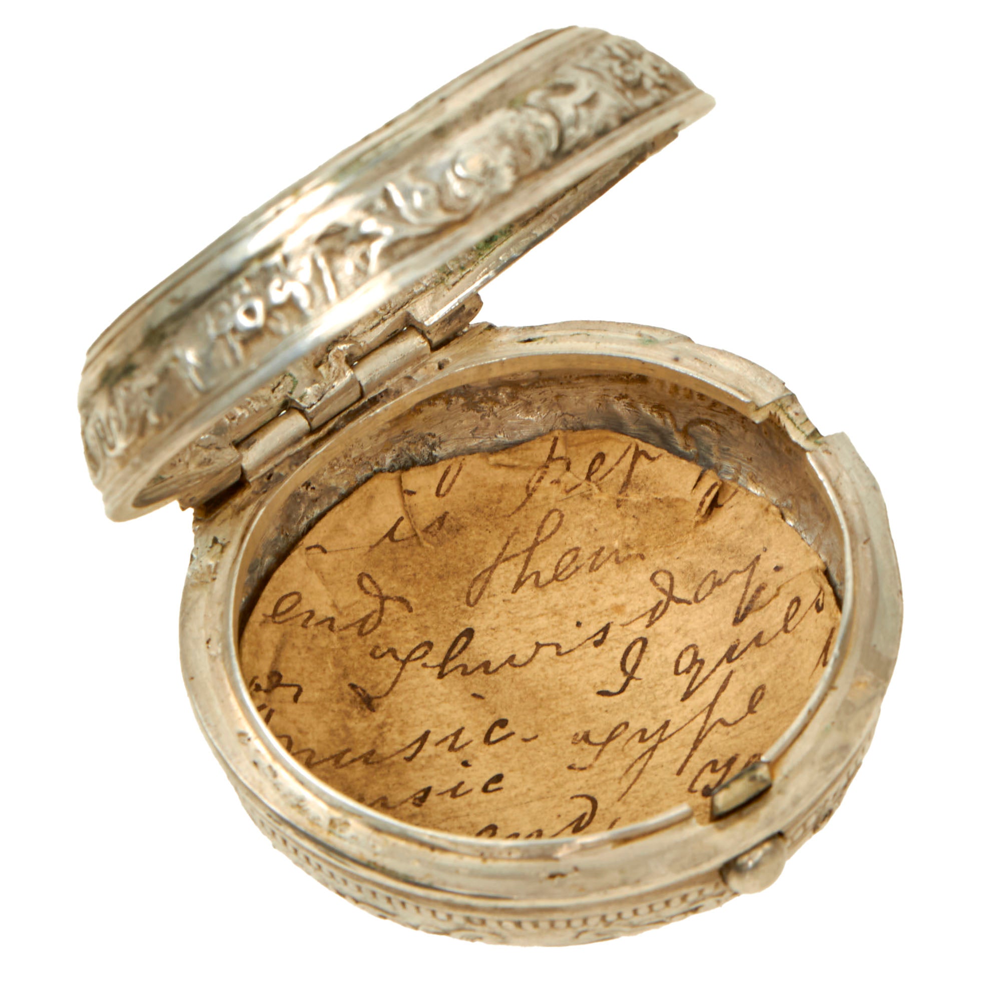 The outer case of the watch is a deep silver case lined with a small circular cut piece of a postcard that is certainly of the period when this watch would have been used. It was common to keep a small buffer like this in between the inner & outer case of the verge fusee. There is a small hole on the back of the inner case meant for the key that winds this watch, numbered 7.