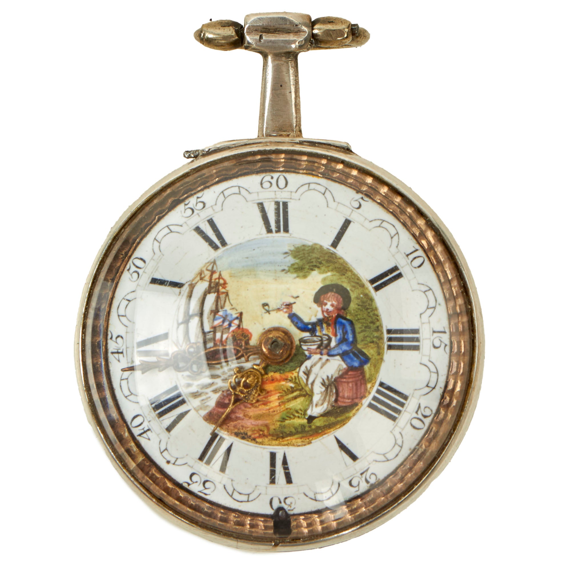 The interior workings of this watch features four wonderful and very unusual architectural pillars and a large silver regulator disk. A gilded verge escapement was standard for Gerrit Rensman of Zwol, Holland, the maker of this intricate piece of societal status. The dial is an enamel polychrome with a gilt ribbed rim. The dial is beautifully painted with a naval scene, depicting a sailor of the Royal Navy & his pipe, with a ship flying the British Naval ensign in the background. Opening the inner case reveals the true “guts” of this piece, the back of which is engraved & signed by Gerrit Rensman Zwol.