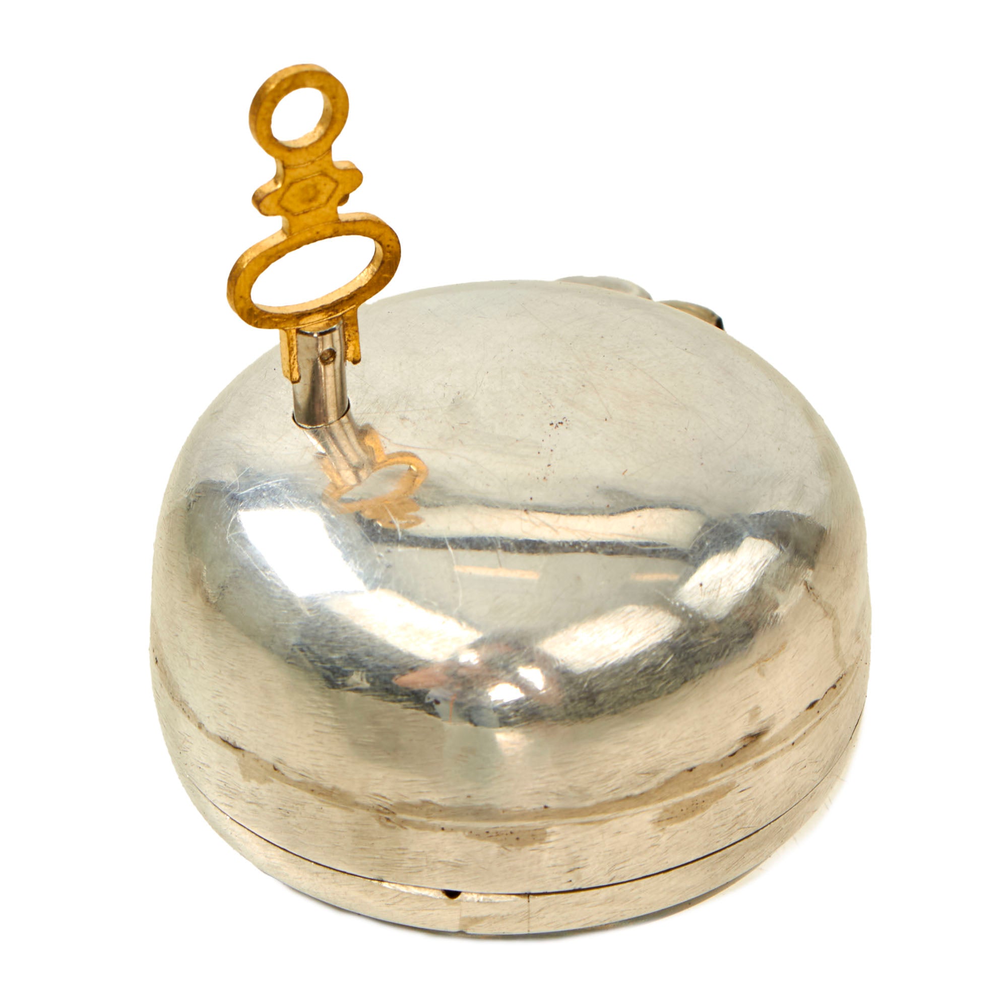 The condition of the pocket watch is fair overall. There is some fading to the arcaded chapter ring, and some light scratches but no hairlines. This example is missing its key, which would allow the watch to be wound. We are unsure of the watch’s workability at present, but a key might be all it needs to begin ticking. Some preliminary tests show that it will tick if prompted. There is some wear to the high points on the back, and some signs of old repairs to the bezel and rims. The catch, catch button and hinge are fine. The hinge has the central sleeve detached but the bezel snaps shut nicely. The high dome bull’s eye crystal is also fine.