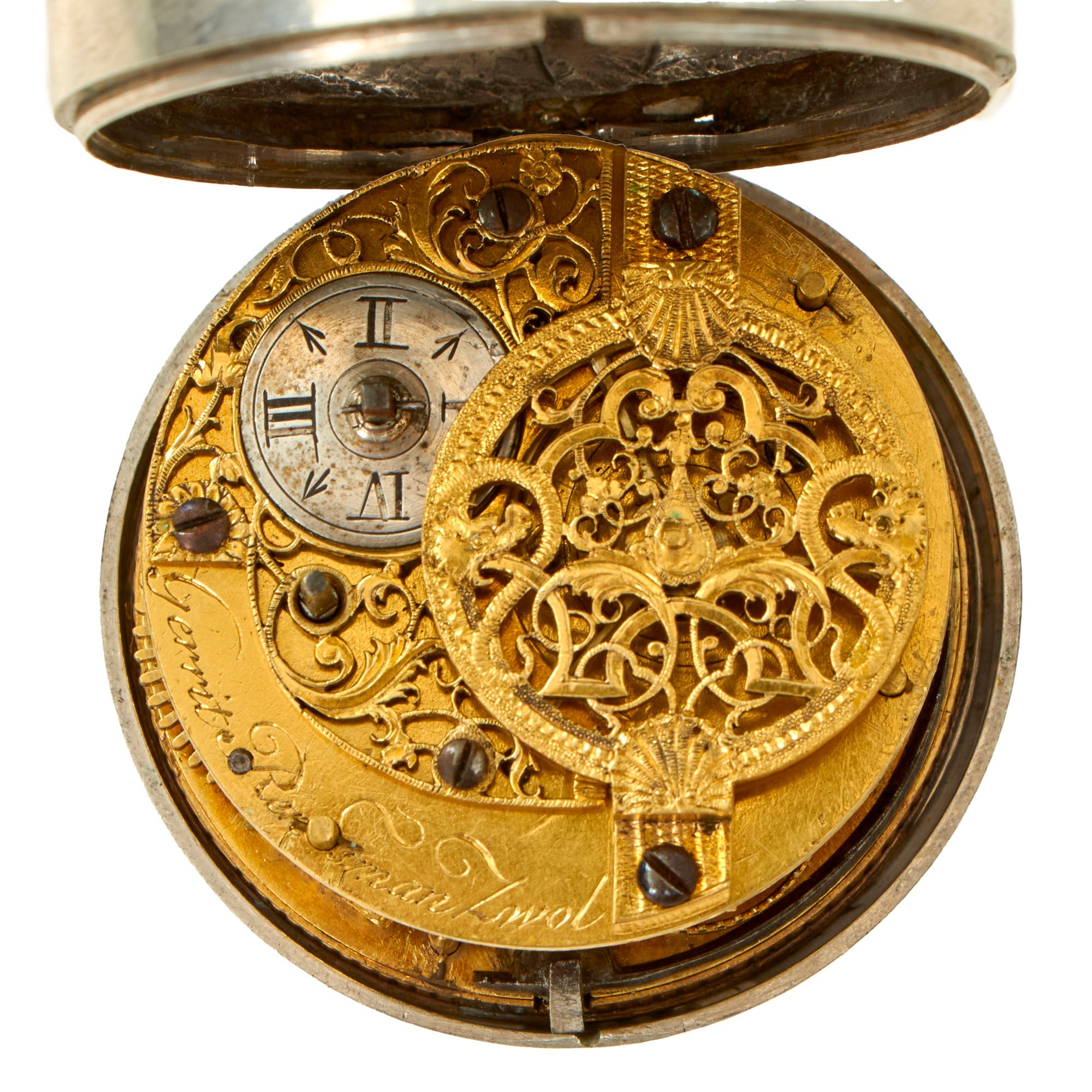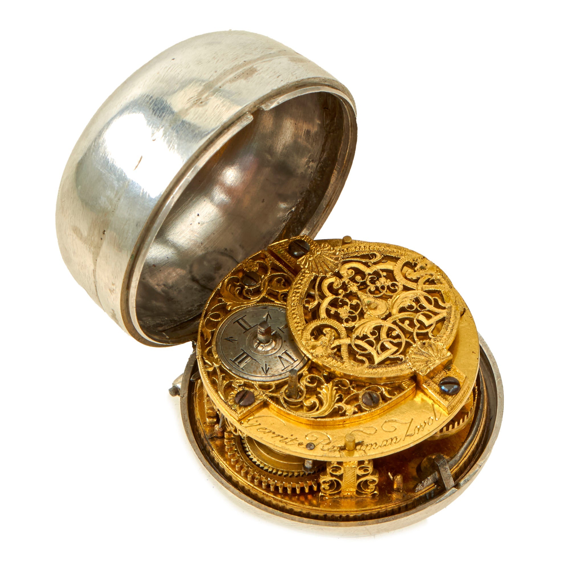 Gerrit Rensman is listed in Zwol, Holland in the early 18th century. There are several known examples of verge escapement pocket watches by him, as well as grandfather style clocks. This particular example is unique, with a one-of-a-kind painted face & escapement, with many small details not found on his other examples. This piece dates to the 1720s or 1730s.