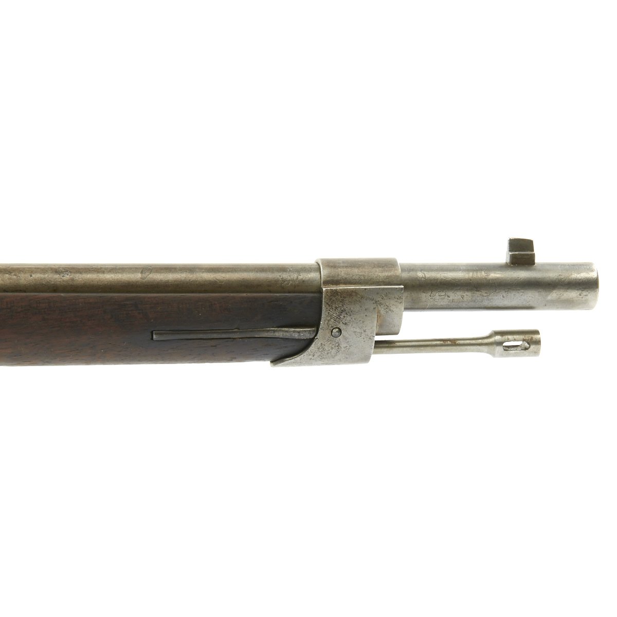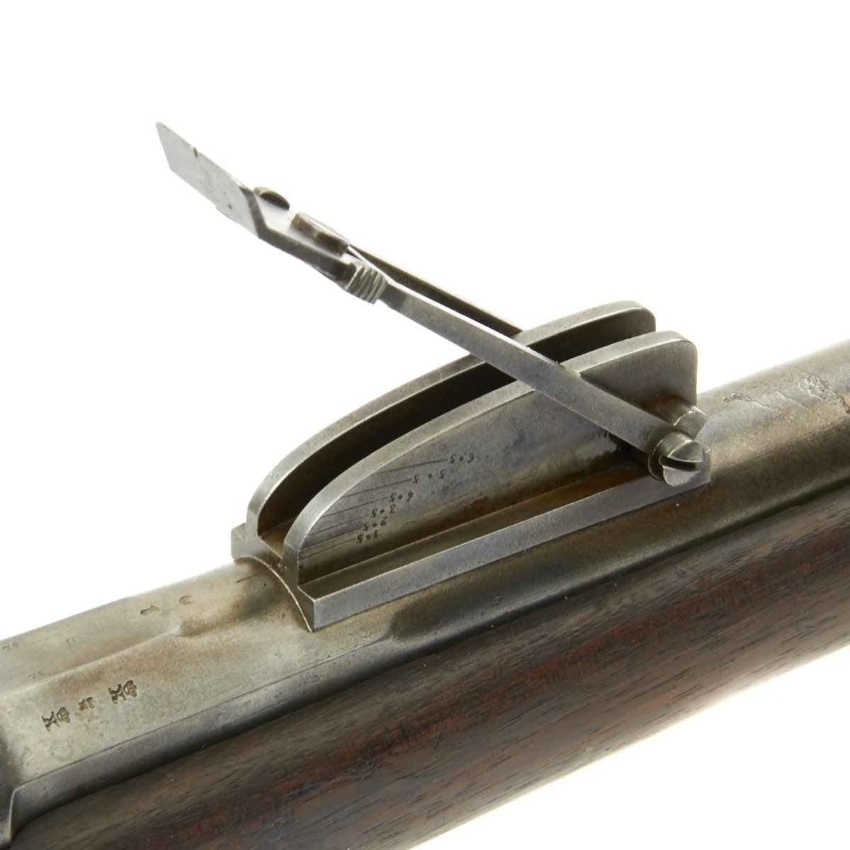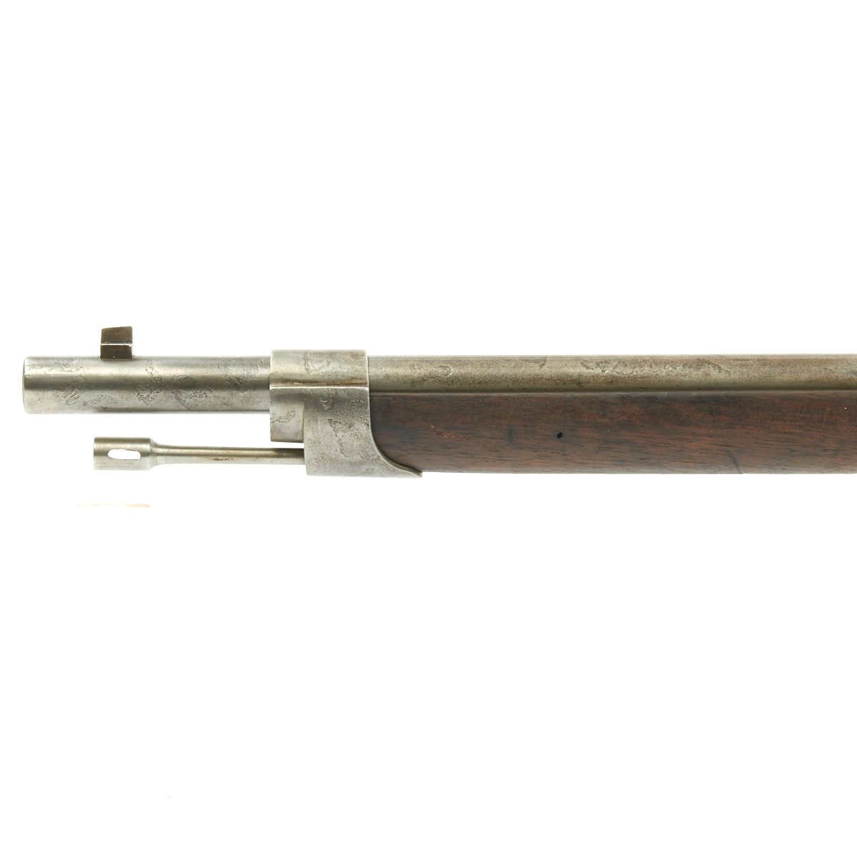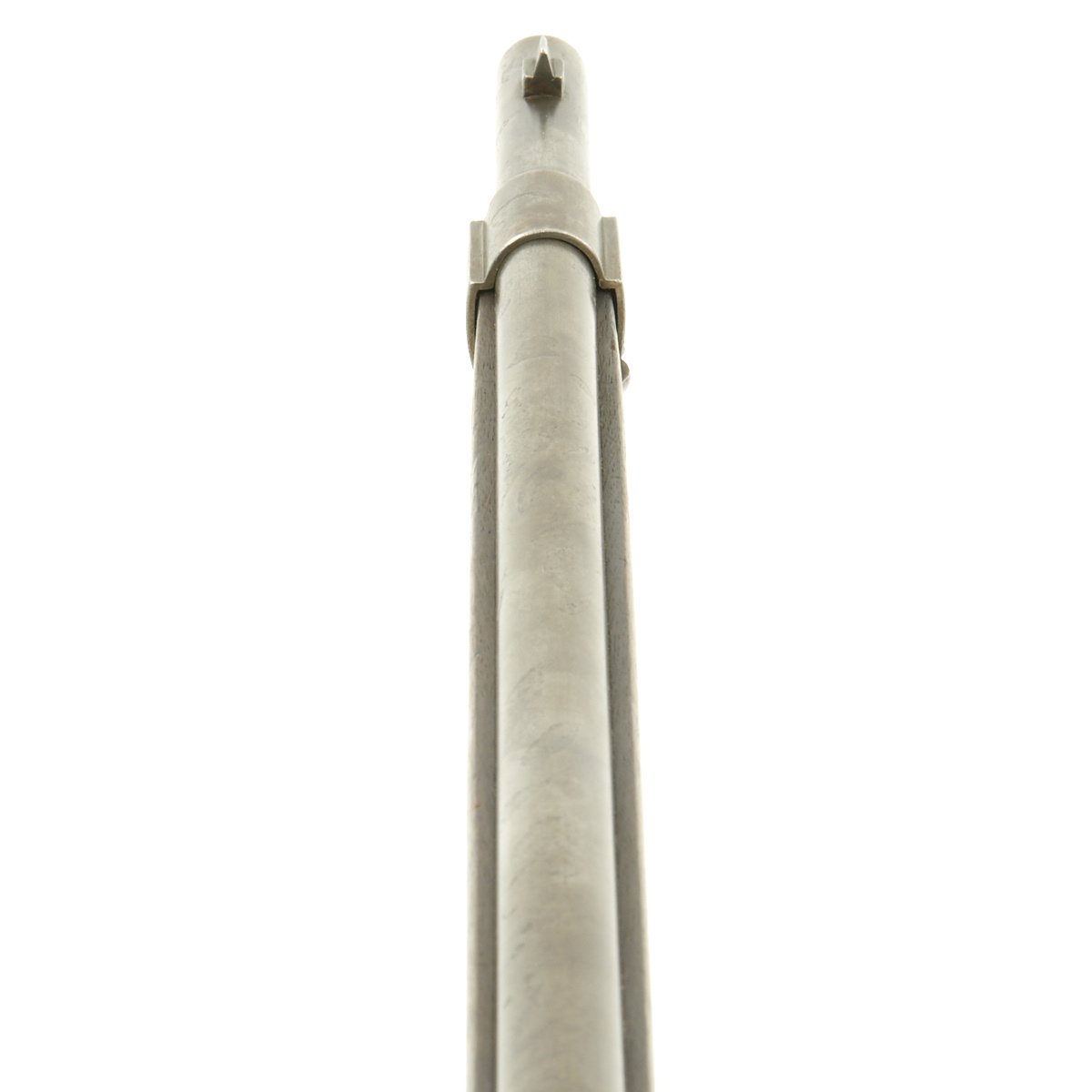 The rifle is in very good overall condition, complete with cleaning rod. The metal finish is worn to a lovely patina gray patina, though there are areas of light pitting. All components are solid and the bolt moves, though it sticks a bit. The bolt is made up of many components, which unfortunately have gotten loose due to wear. The bore is excellent, with clear lands and grooves with a bright shiny finish. The wood stock is in good condition, though it has been worn down from cleaning and use. This has made the markings somewhat faint, and there are some small dents. No major damage that we can see, the stock is still solid.