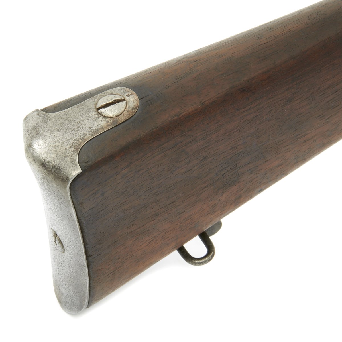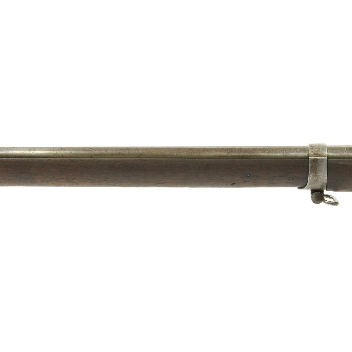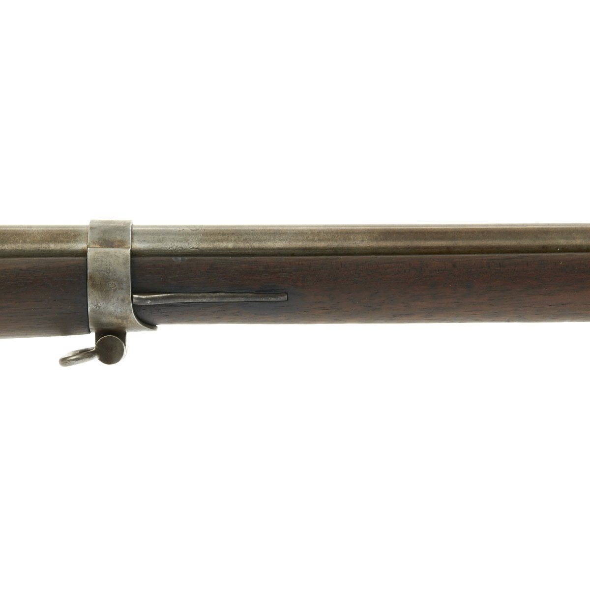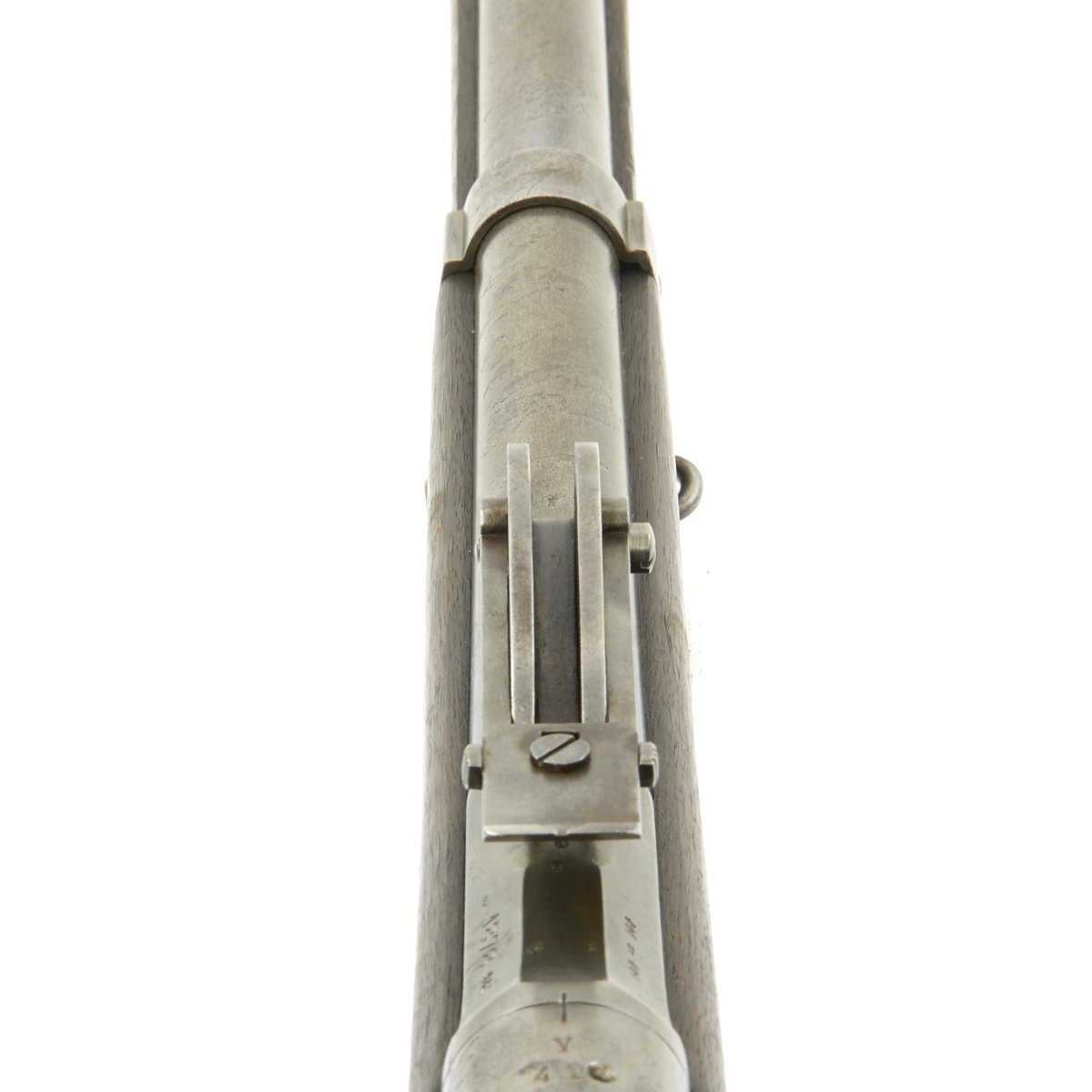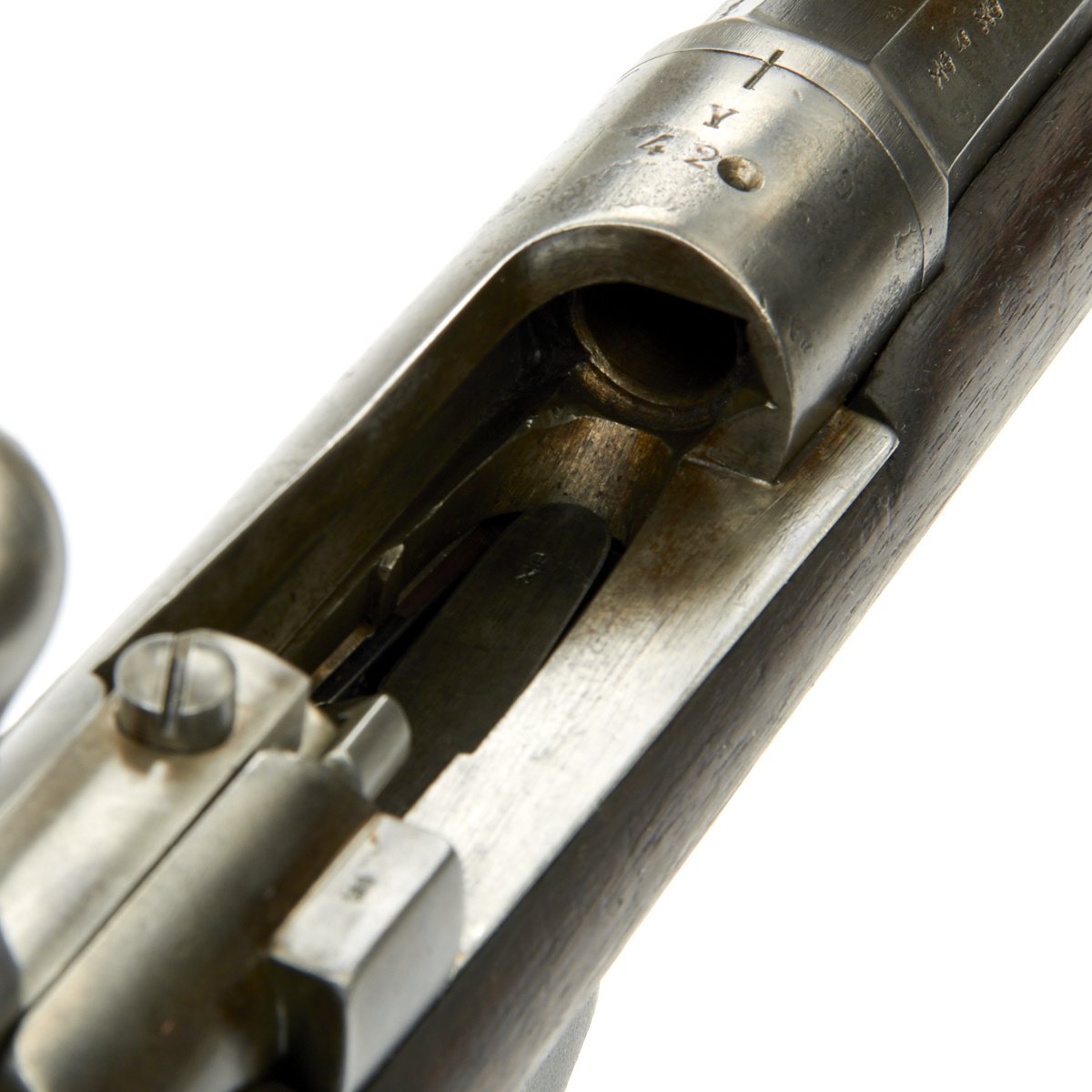 The rifle is in very good overall condition, complete with cleaning rod. The metal finish is worn to a lovely patina gray patina, though there are areas of light pitting. All components are solid and the bolt moves, though it sticks a bit. The bolt is made up of many components, which unfortunately have gotten loose due to wear. The bore is excellent, with clear lands and grooves with a bright shiny finish. The wood stock is in good condition, though it has been worn down from cleaning and use. This has made the markings somewhat faint, and there are some small dents. No major damage that we can see, the stock is still solid.