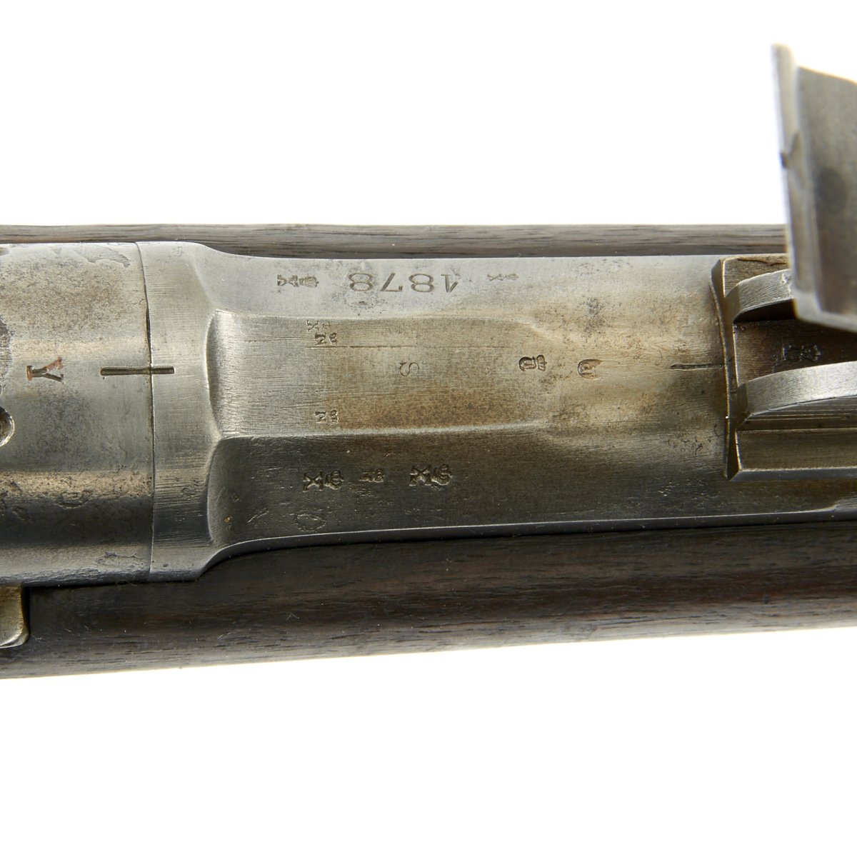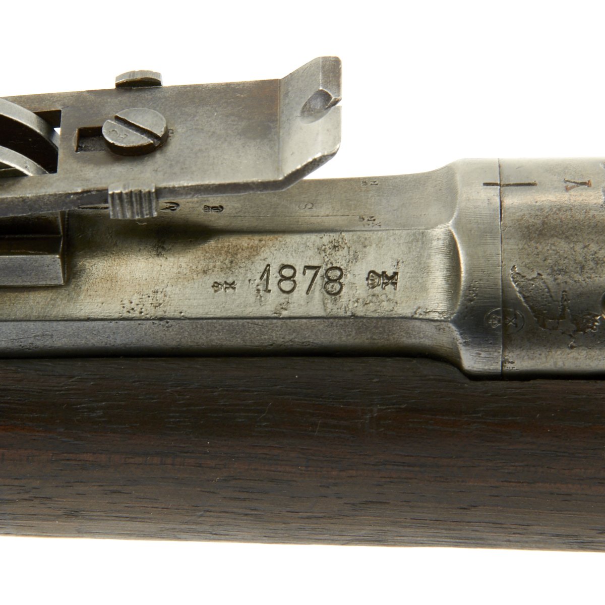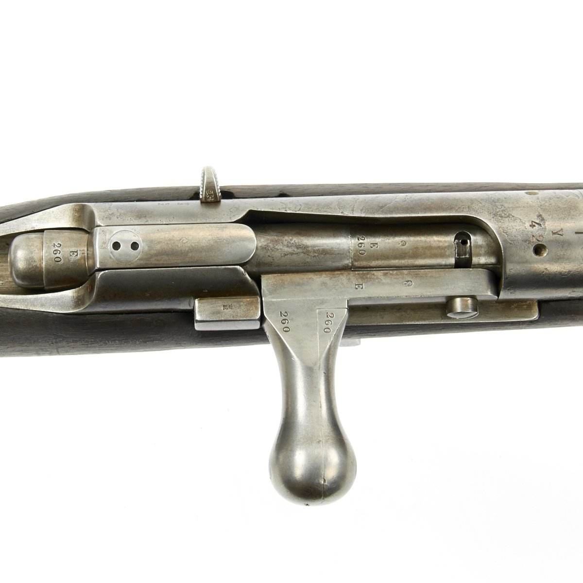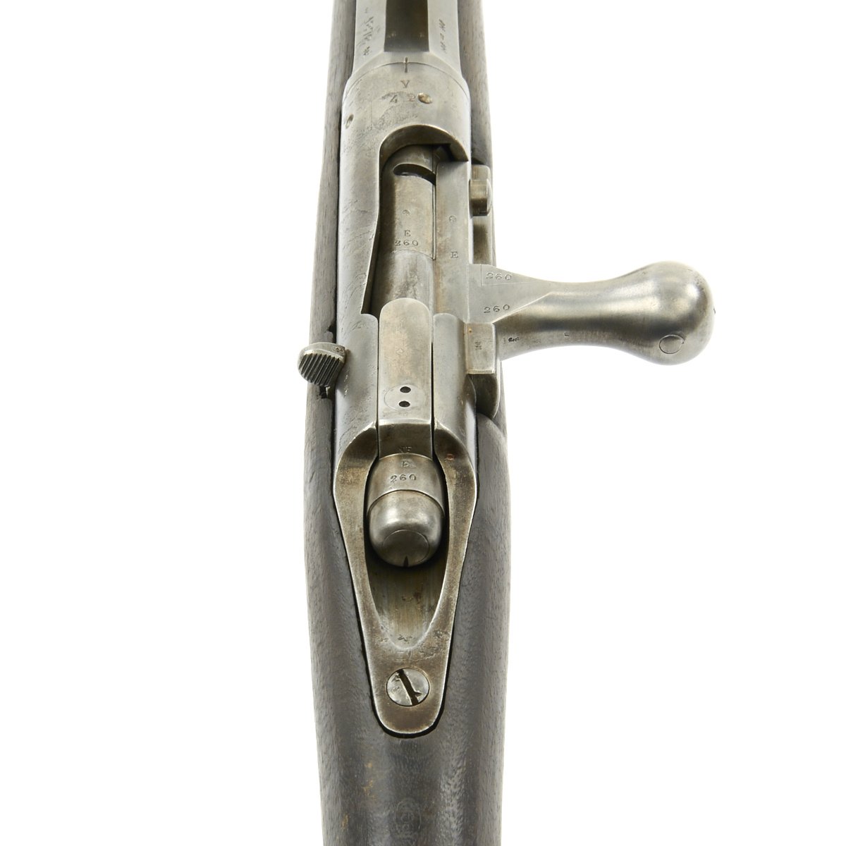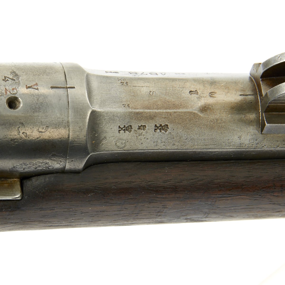 This example has serial number Y/ 42 above the chamber on the receiver, as well as on the magazine floor plate. The bolt has all components marked E / 260. This is normal for the converted rifles, as the action had to be rebuilt, and often parts were mixed. The barrel is dated 1878, and the receiver is faintly marked P. STEVENS, which would normally have MAASTRICHT under it. It is in nice tight condition overall with a very faint roundel stamp in the stock showing a faint Crown over W surrounded by MAASTRICHT and an unclear date.