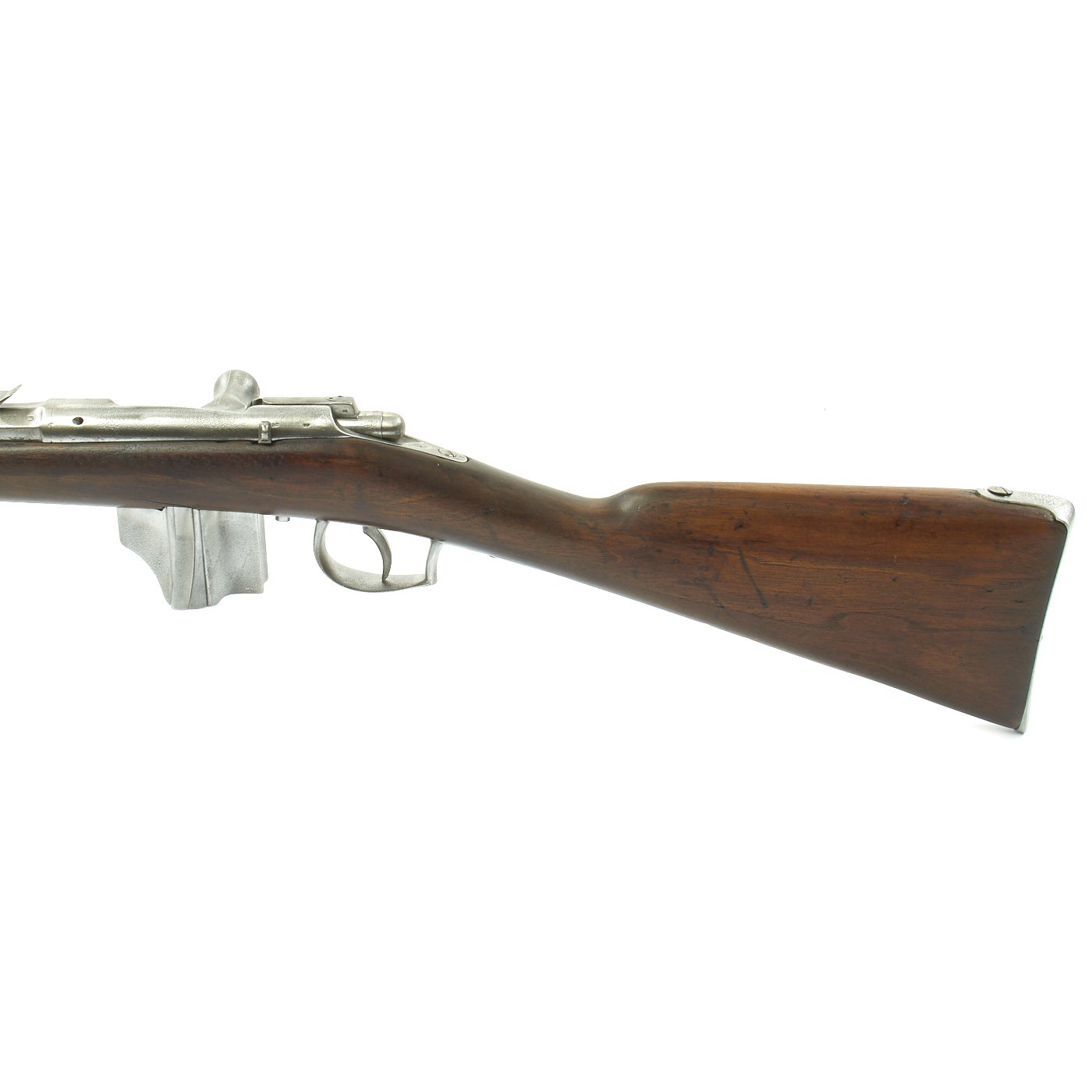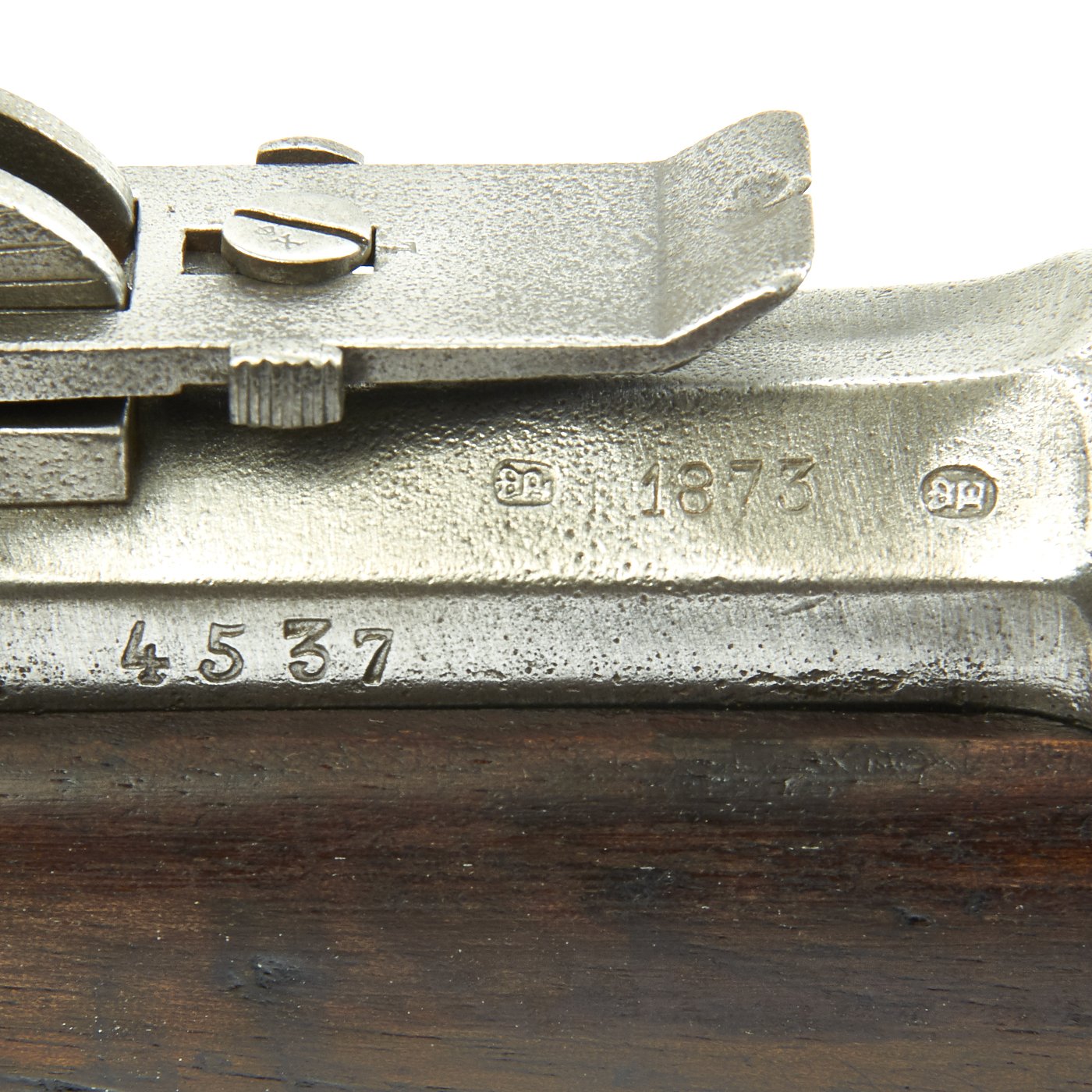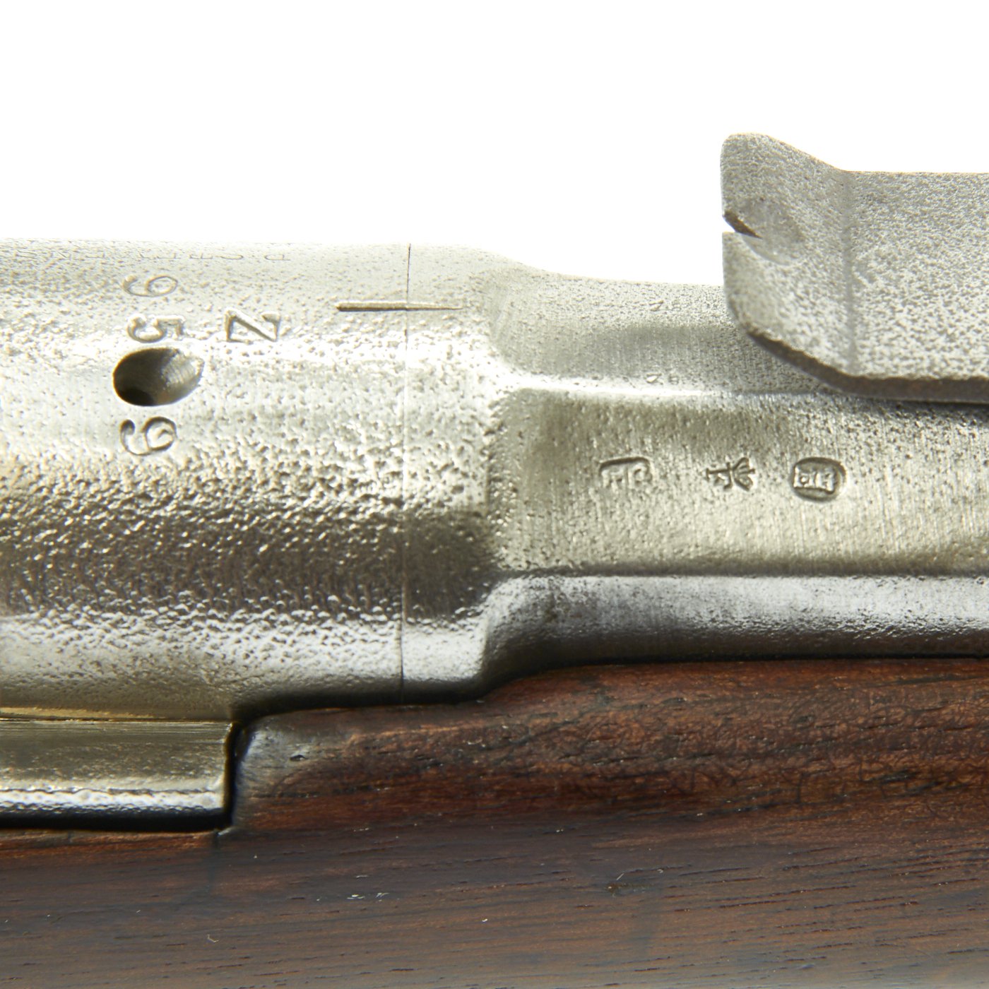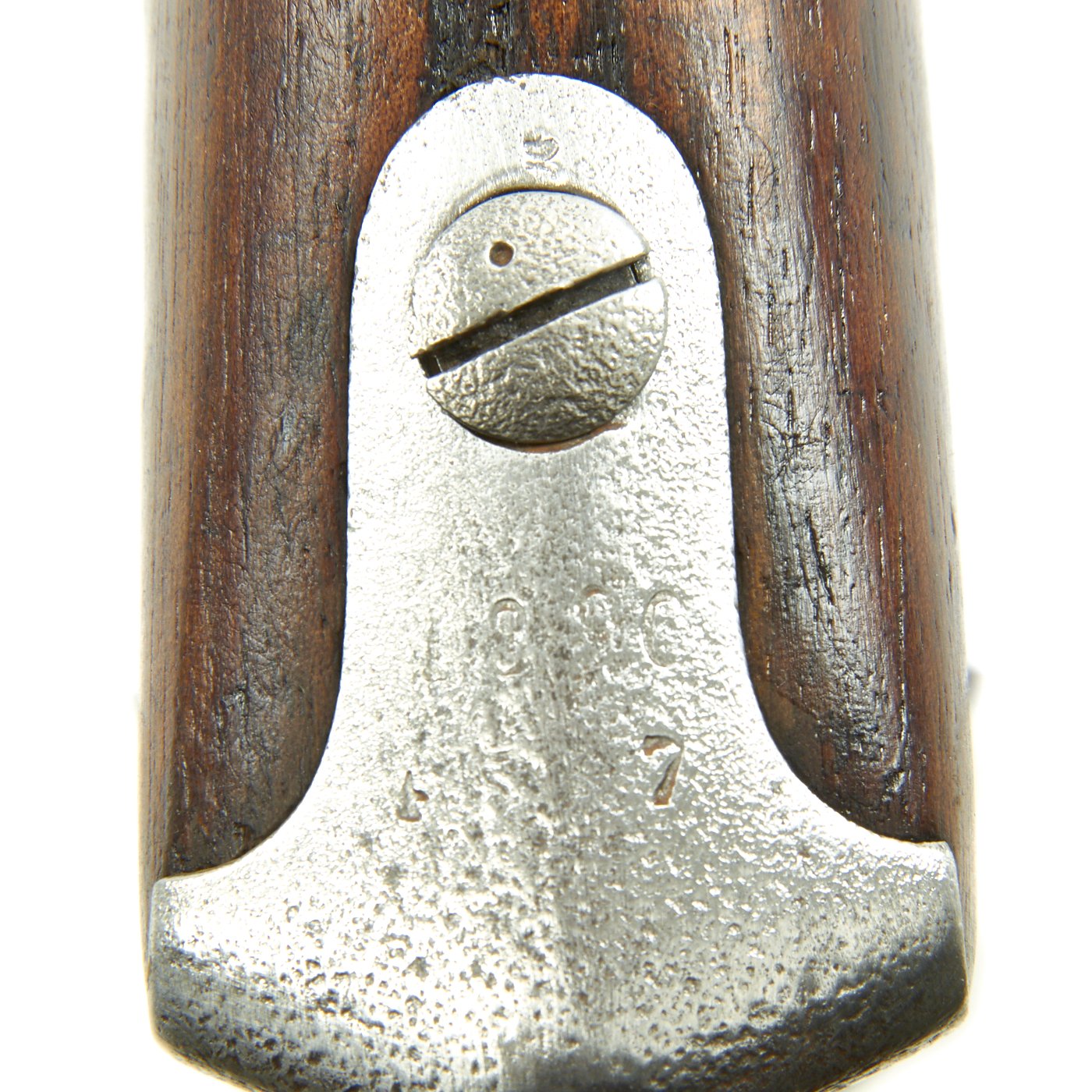 This example has serial number 4537 on the barrel and butt plate(partial), and numbers B / 651 on the bolt components and Z / 959 above the chamber on the receiver, as well as on the magazine floor plate. This is normal for the converted rifles, as the action had to be rebuilt, and sometimes bolts were swapped later. The barrel is dated 1873, and the receiver is very faintly marked P. STEVENS / MAASTRICHT. It is in nice condition overall with a roundel stamp in the stock showing a partial Crown over W surrounded by MAASTRICHT and a clear 1875 date. Additionally, the butt plate is faintly marked [18]90, indicating the year it was converted to the bolt-action magazine system.