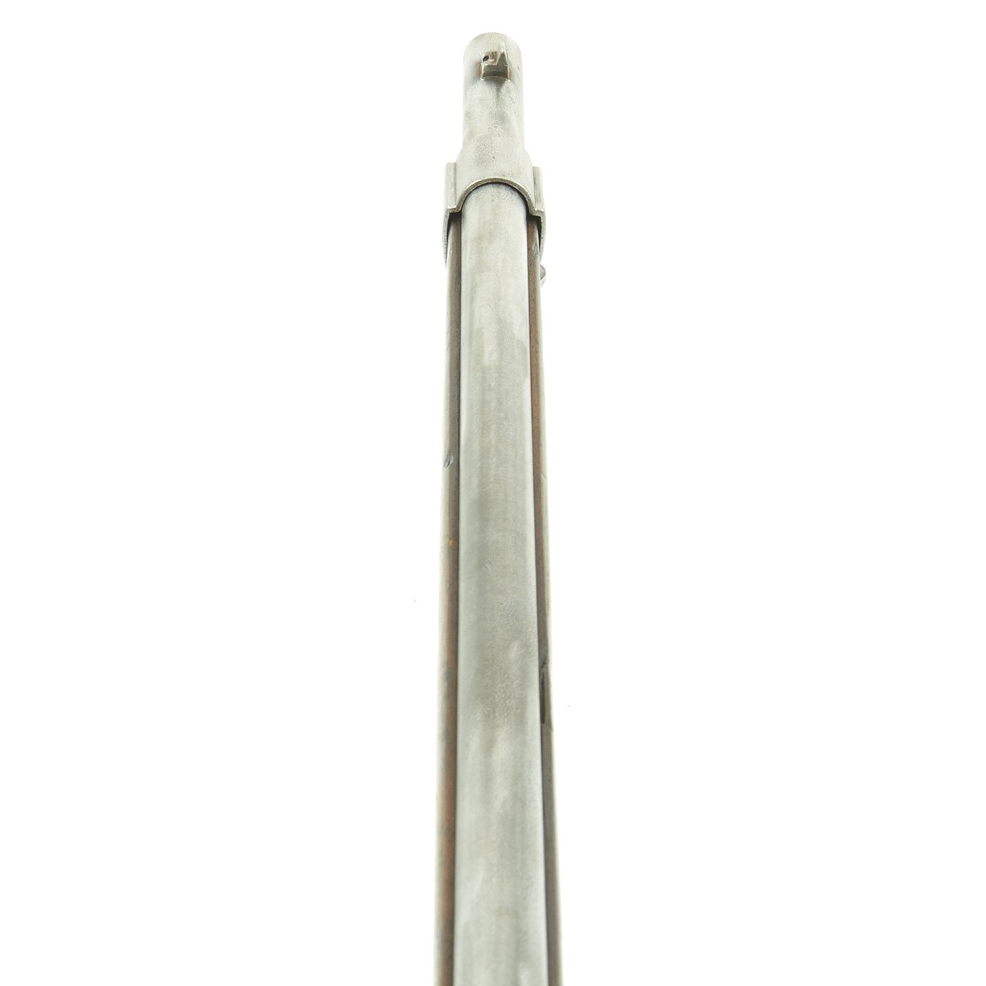 The rifle is in very good overall condition, though the cleaning rod is a replacement. The metal finish is mostly bright, and it looks like the metalwork was at one time covered with surface rust, now removed. All components are solid and the bolt moves crisply. The bore is unfortunately quite dark, as it suffered the same oxidation as the rest of the rifle. The wood stock is quite nice, with a few small repairs, and the usual handling and dent marks from years of service. Ready to display!