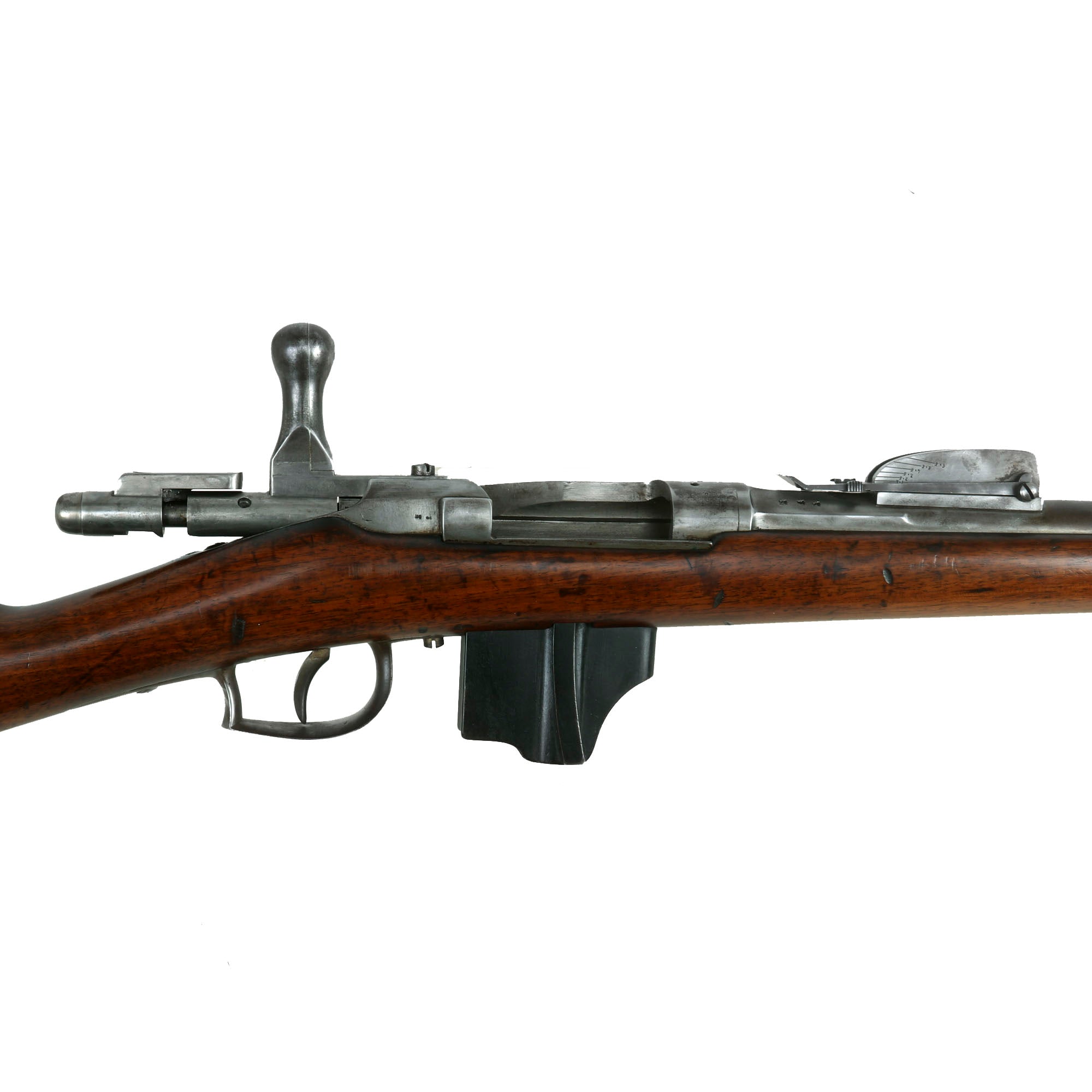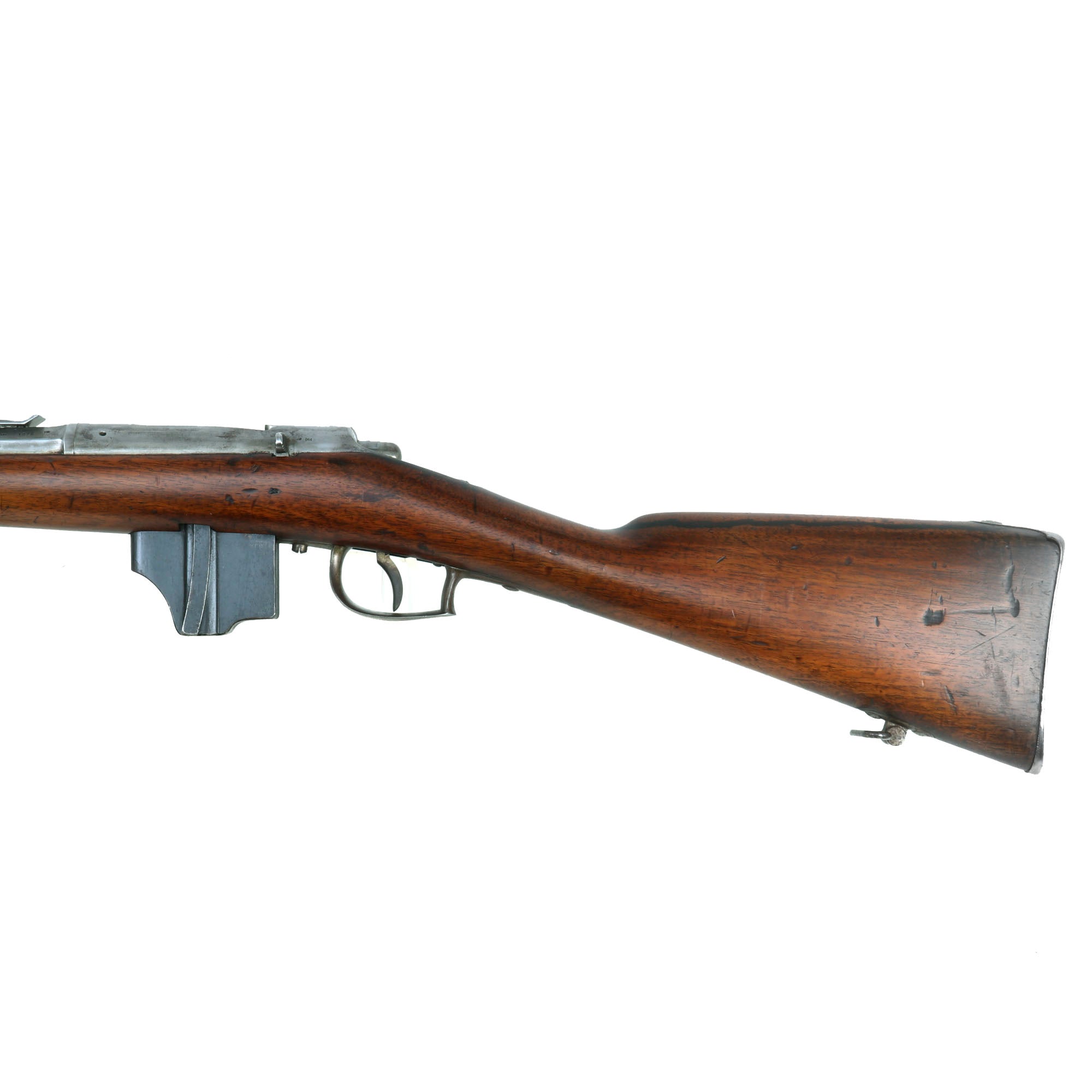 Created in 1871 by a Dutch engineer named Messerecht, the Dutch Beaumont rifle was one of the first metallic cartridge bolt-action rifle to be adopted by any military. Firing an 11.3x50mm cartridge it was single shot only, meaning the user had to insert a new cartridge after every shot. Unlike other rifles, the mainspring of the Beaumont was located within the bolt handle, an exact copy of the Mauser Norris rifle, which would also be copied by the Japanese with the Murata rifle. This same feature, however, made it impossible to turn down the bolt on cavalry and carbine models.